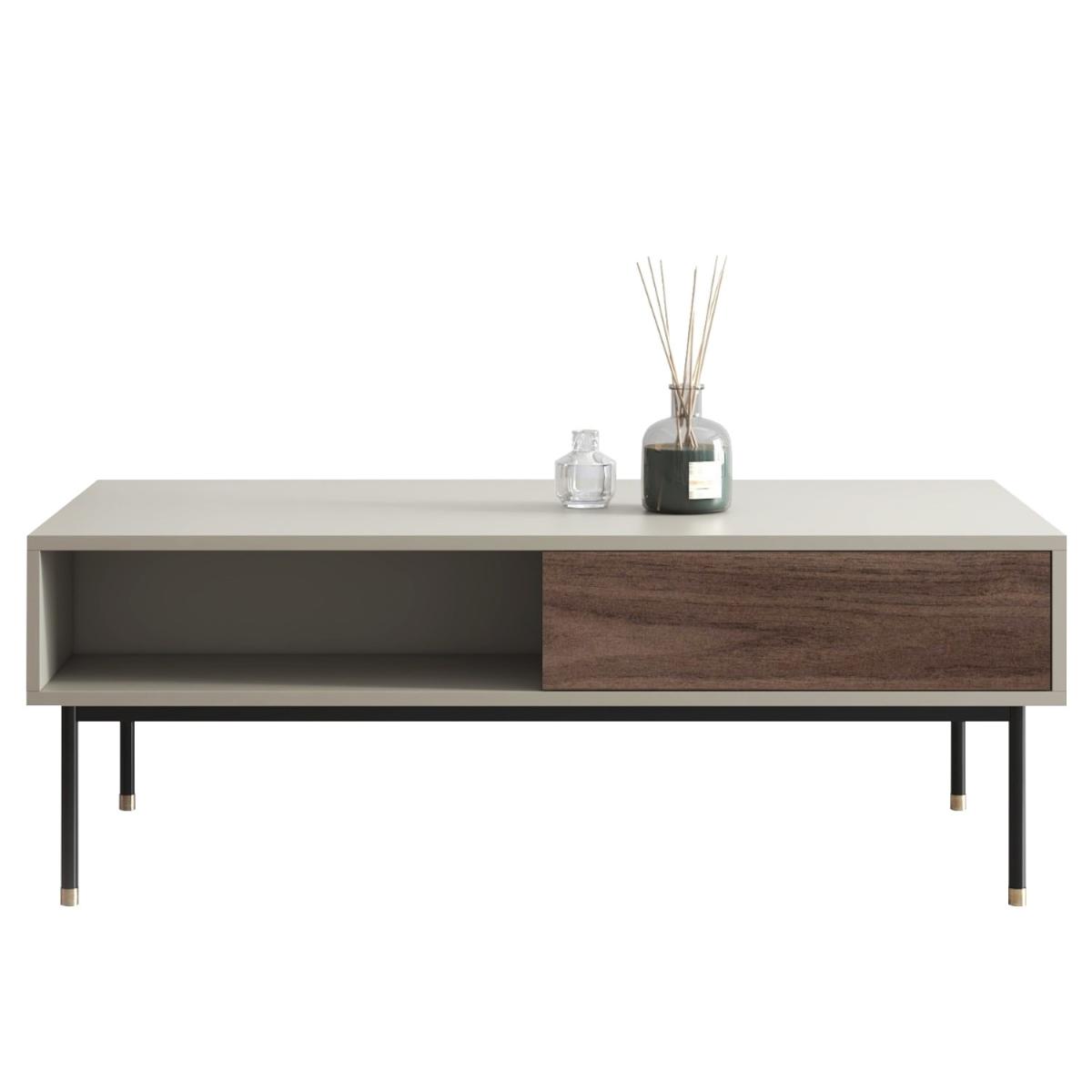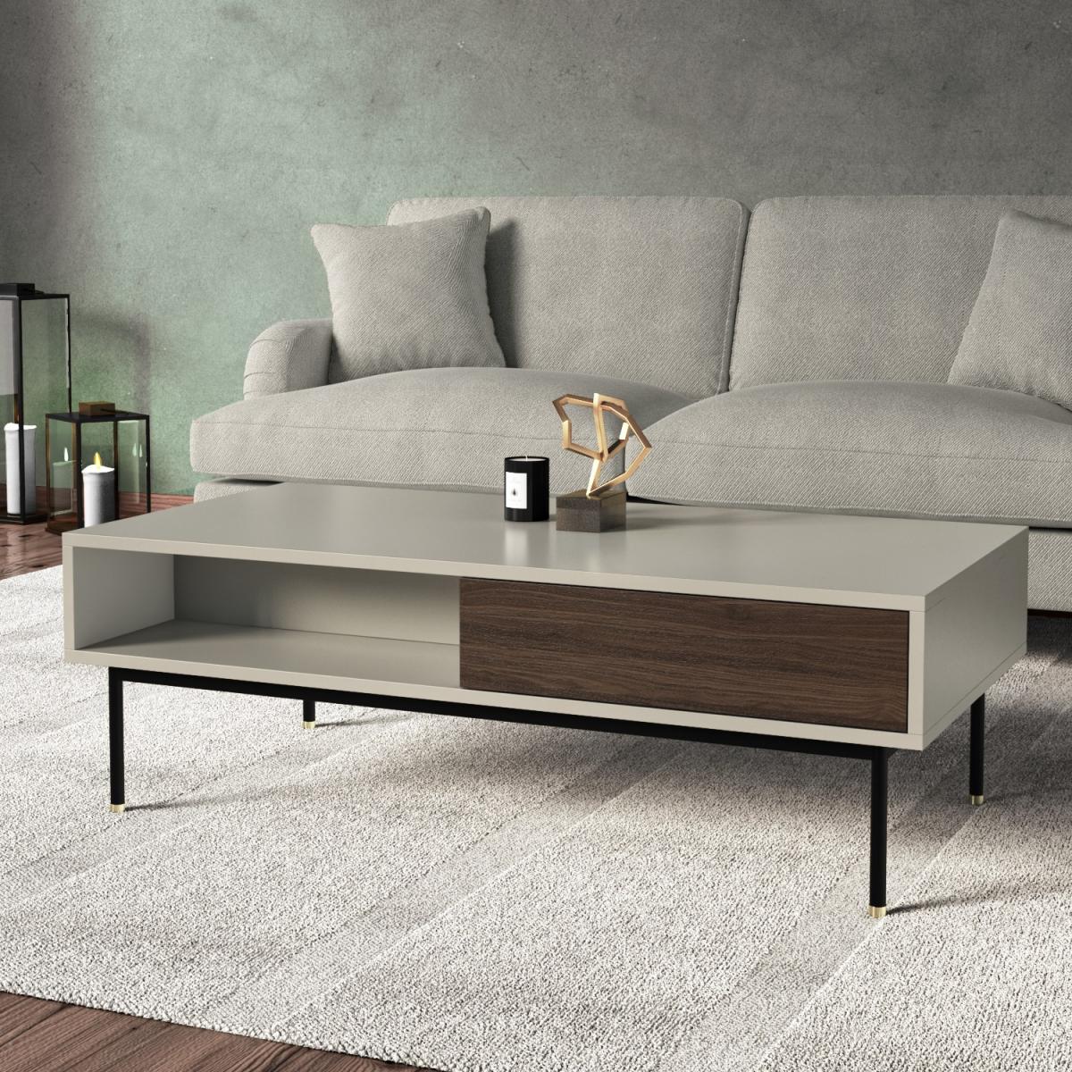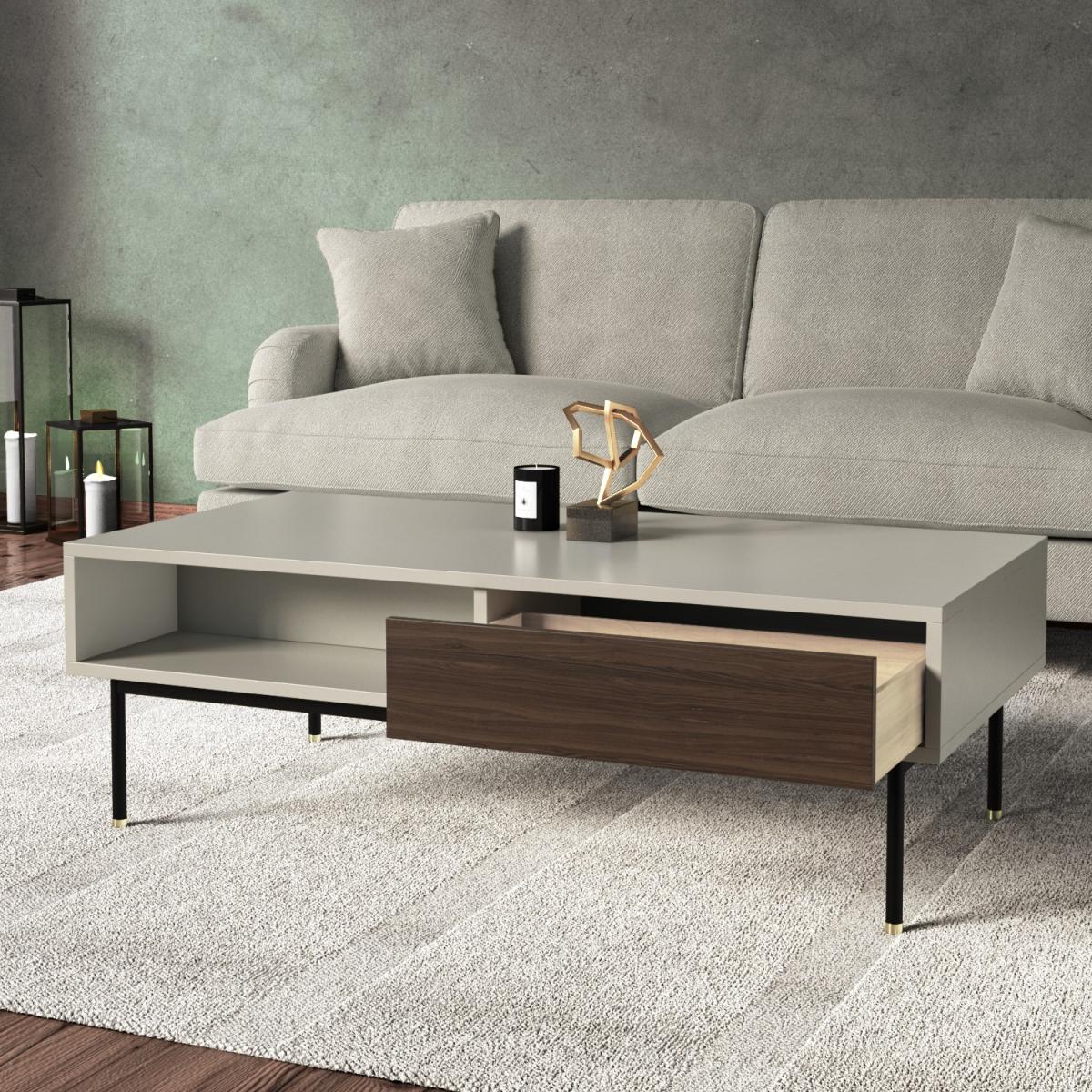 Features we love Modern coffee table finished in a beautiful matt taupe Combination of open and closed storage with 1 drawer. Warm neutral tones complement the minimalistic design. Walnut veneer detailing add a stylish finishing touch. Minimal assembly is required just attach the legs. Matching items available in the Kallen range All about me. The Kallen coffee table is the perfect combination of functional storage and style. Finished in a matt taupe with contrasting walnut veneer shelves and featuring black metal legs with stainless steel gold tip detailing. With a 360 degree finish it is perfect for any living room as a coffee table or simply extra storage. Need to know. Dimensions. H40 x W120 x D60cm Max supported weight. 150kg Weight. 44kg Colour. Taupe champagne Sideboard finish. Matt Leg finish. Powder-coated metal Material. MDF Walnut veneer metal legs with stainless-steel tips Assembly required. Yes - just attach the legs.