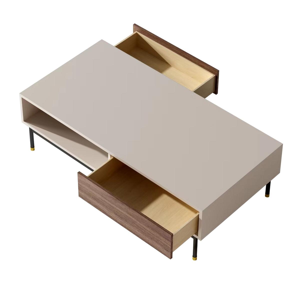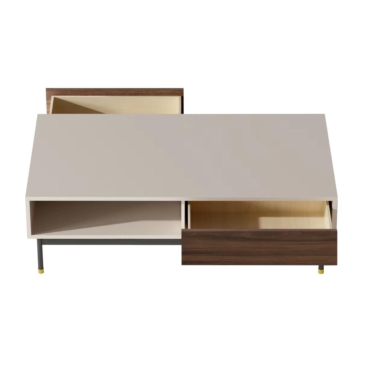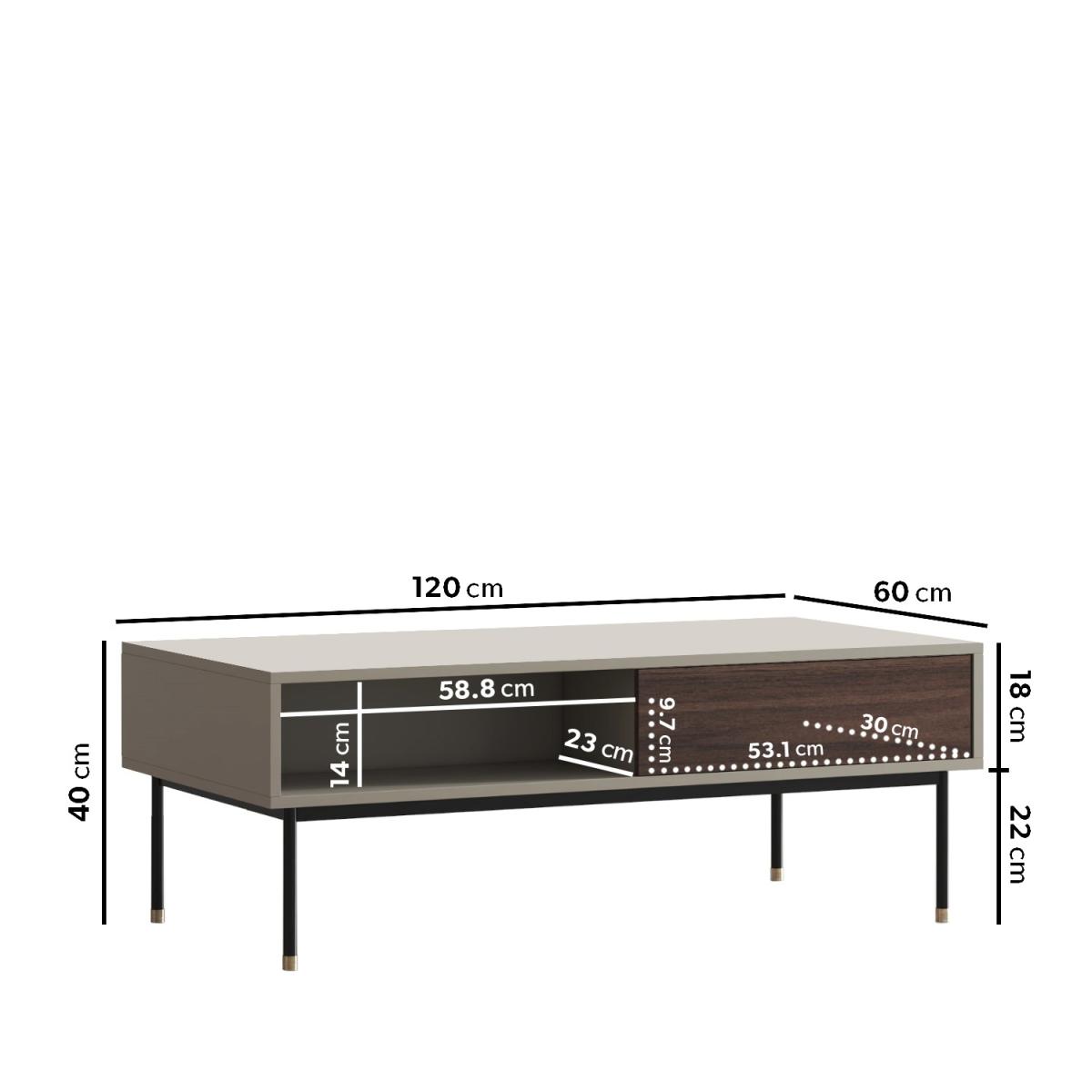 Features we love Modern coffee table finished in a beautiful matt taupe Combination of open and closed storage with 1 drawer. Warm neutral tones complement the minimalistic design. Walnut veneer detailing add a stylish finishing touch. Minimal assembly is required just attach the legs. Matching items available in the Kallen range All about me. The Kallen coffee table is the perfect combination of functional storage and style. Finished in a matt taupe with contrasting walnut veneer shelves and featuring black metal legs with stainless steel gold tip detailing. With a 360 degree finish it is perfect for any living room as a coffee table or simply extra storage. Need to know. Dimensions. H40 x W120 x D60cm Max supported weight. 150kg Weight. 44kg Colour. Taupe champagne Sideboard finish. Matt Leg finish. Powder-coated metal Material. MDF Walnut veneer metal legs with stainless-steel tips Assembly required. Yes - just attach the legs.