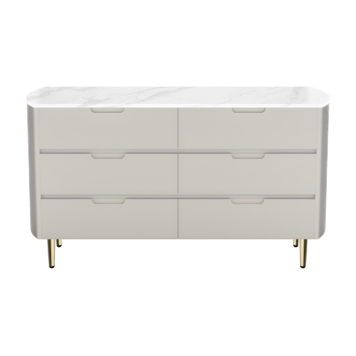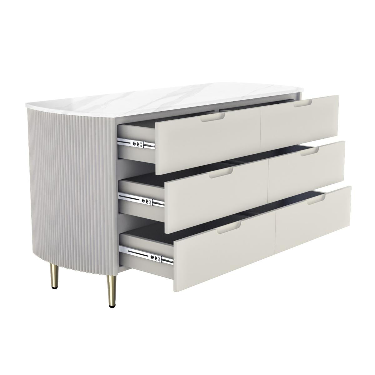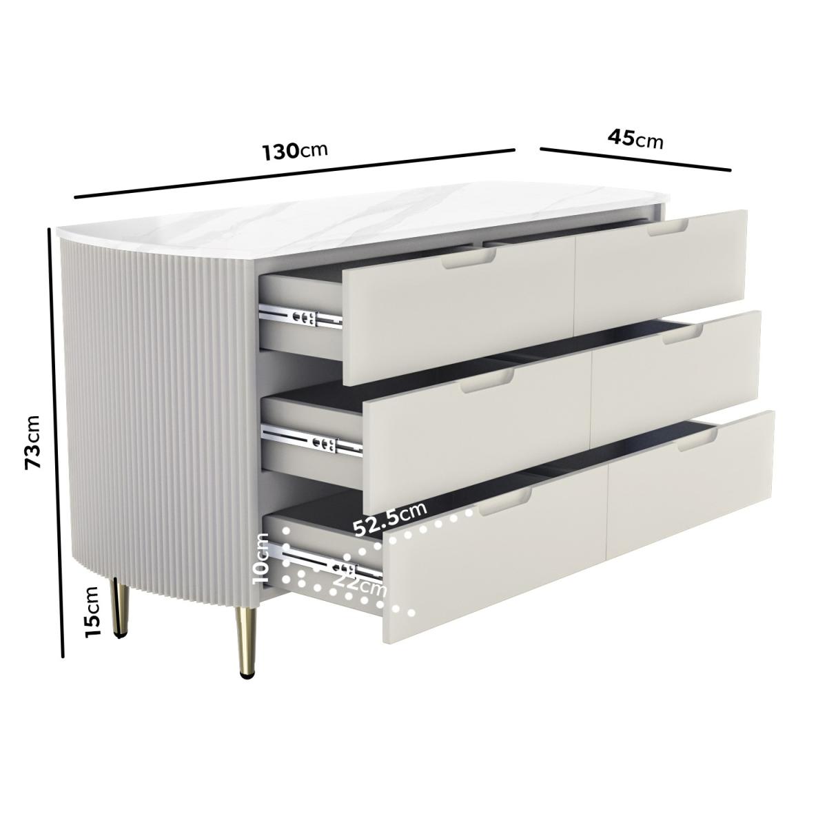 A stunning solution to keep your clothes tucked away, this six-drawer chest looks fantastic in any bedroom. It features a spacious, marble-effect top which is ideal for displaying photos or standing ornaments. The light grey lacquered finish complements any colour that features in your room, while the curved, ridged sides give this chest a softer, more glamorous look. It's lifted off the floor by brushed metal legs, helping to keep your space light and airy.
