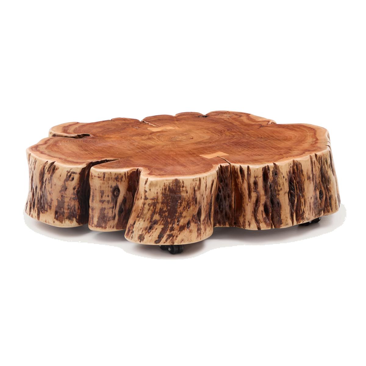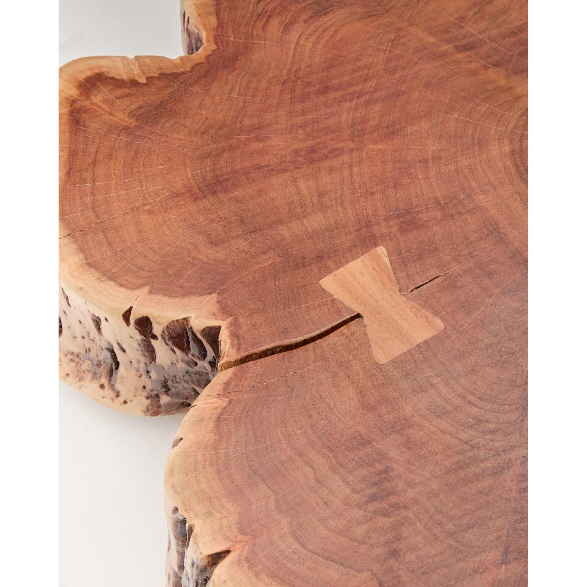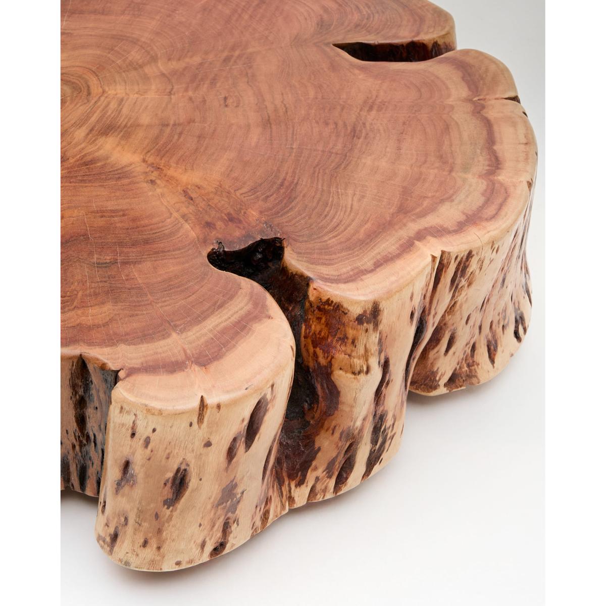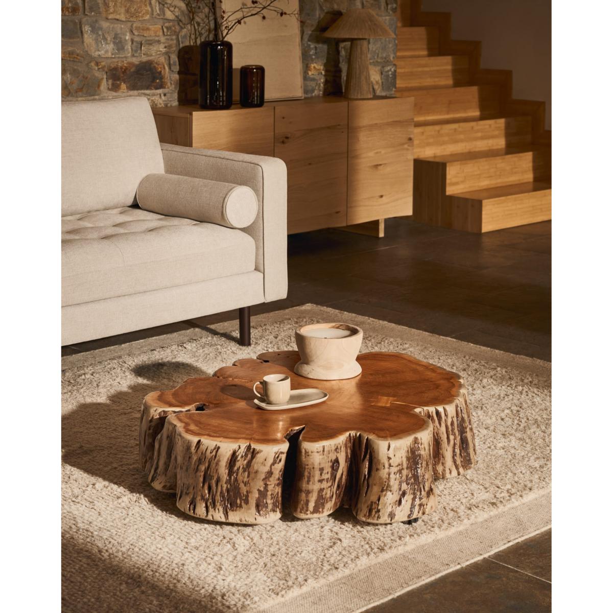 Tavine is made from solid acacia wood with a bleached finish, maintaining the original shape of the tree trunk, making each table a unique and individual piece. Each piece retains the irregular shapes, organic contours and unique veins that only the tree itself can offer, bringing unmistakable personality and sculptural presence to any space. The bleached finish enhances the texture of the wood and adds a subtle brightness that highlights the natural beauty in every detail. For added functionality, Tavine includes discreet wheels that make it easy to move around, adapting to your daily needs. This combination of design and practicality makes Tavine the centre of attention, perfect for those looking for a centrepiece with character and versatility for their home.
