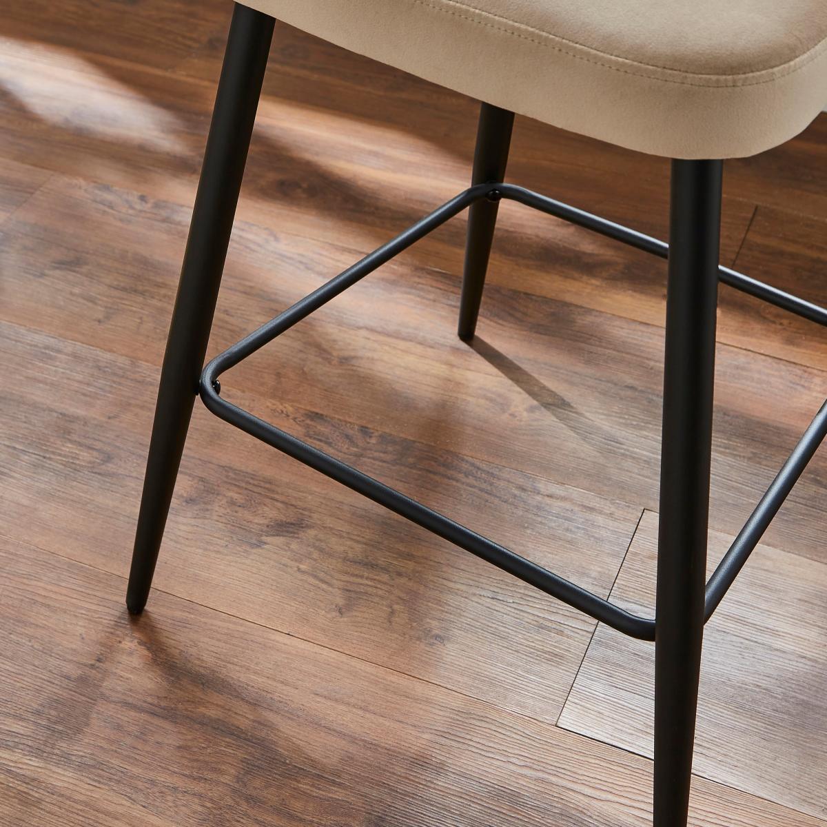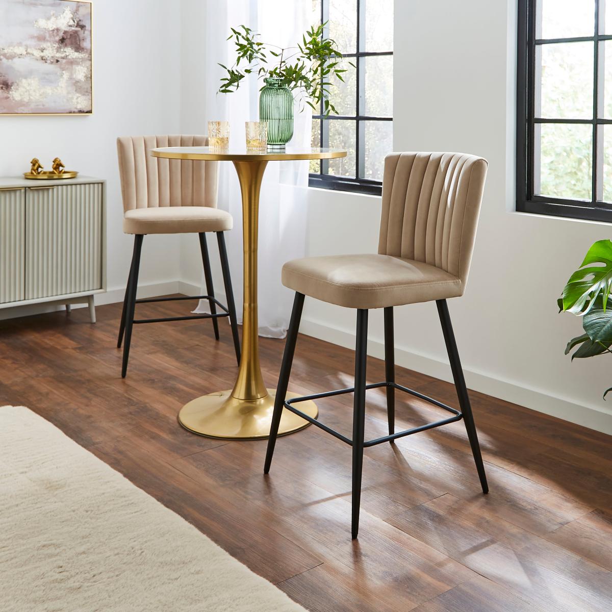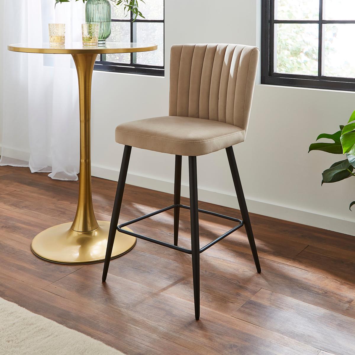 I’m a fan of this mink velvet stool for its pared-back silhouette and soft, tactile upholstery - the slim black legs keep it feeling contemporary while the fluted back adds subtle interest. The neutral mink tone sits comfortably in Scandi-inspired schemes, urban lofts or even a pared-down Art Deco setting, pairing well with marble or brass accents. For practical styling, pull two up to a kitchen island with a quartz or timber top, leaving around 60cm between each for ease of movement. Layer a small woollen throw over the backrest in cooler months to introduce an extra cosy texture, or anchor the look with a sleek bar trolley nearby to echo the metal frame.