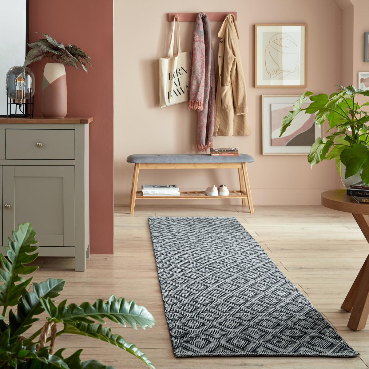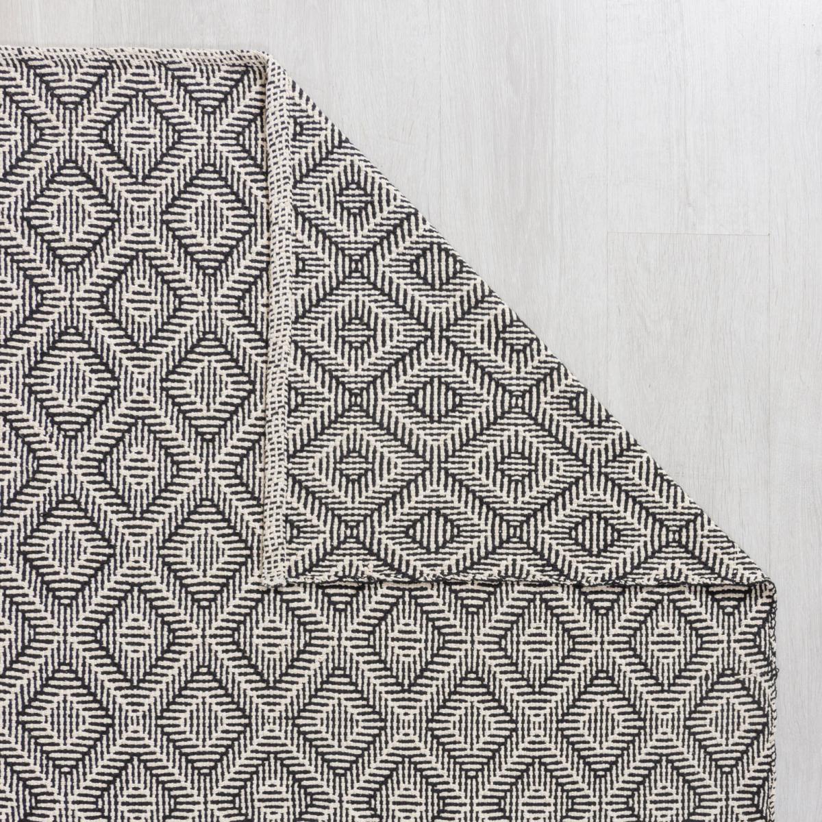 Inspired by authentic global rugs the Taylor flatweave runner is the perfect addition to your home to add interest and style. The striking design features a stitched effect in a monochrome palette which creates a textured look whilst staying true to the lightweight and flexible nature of a flatweave runner. The Taylor Diamond runner is slim-line with a 0 cm pile height and an authentic blanket-like appearance, for emulating global style. Handmade in India by skilled rug artisans this 100% natural cotton flatweave rug is reversible too, making it the ideal long-lasting addition to your space. Caring for your runner. Opening your rug. Steps 1-4 will help reduce wrinkles and curling from packaging. Turn your rug regularly to ensure even wear and reduce pressure marks from furniture.