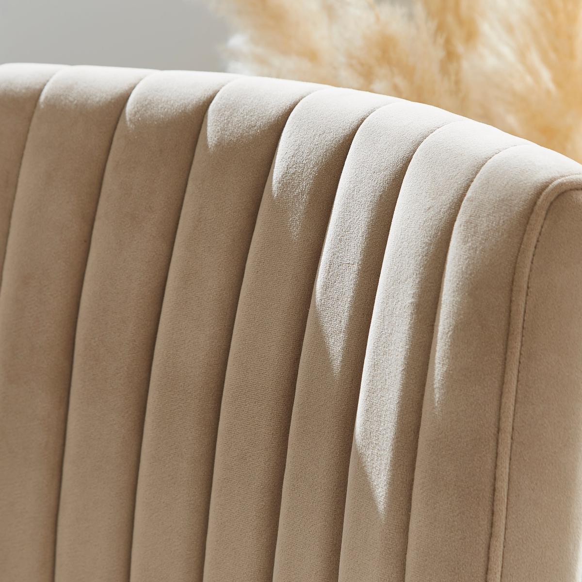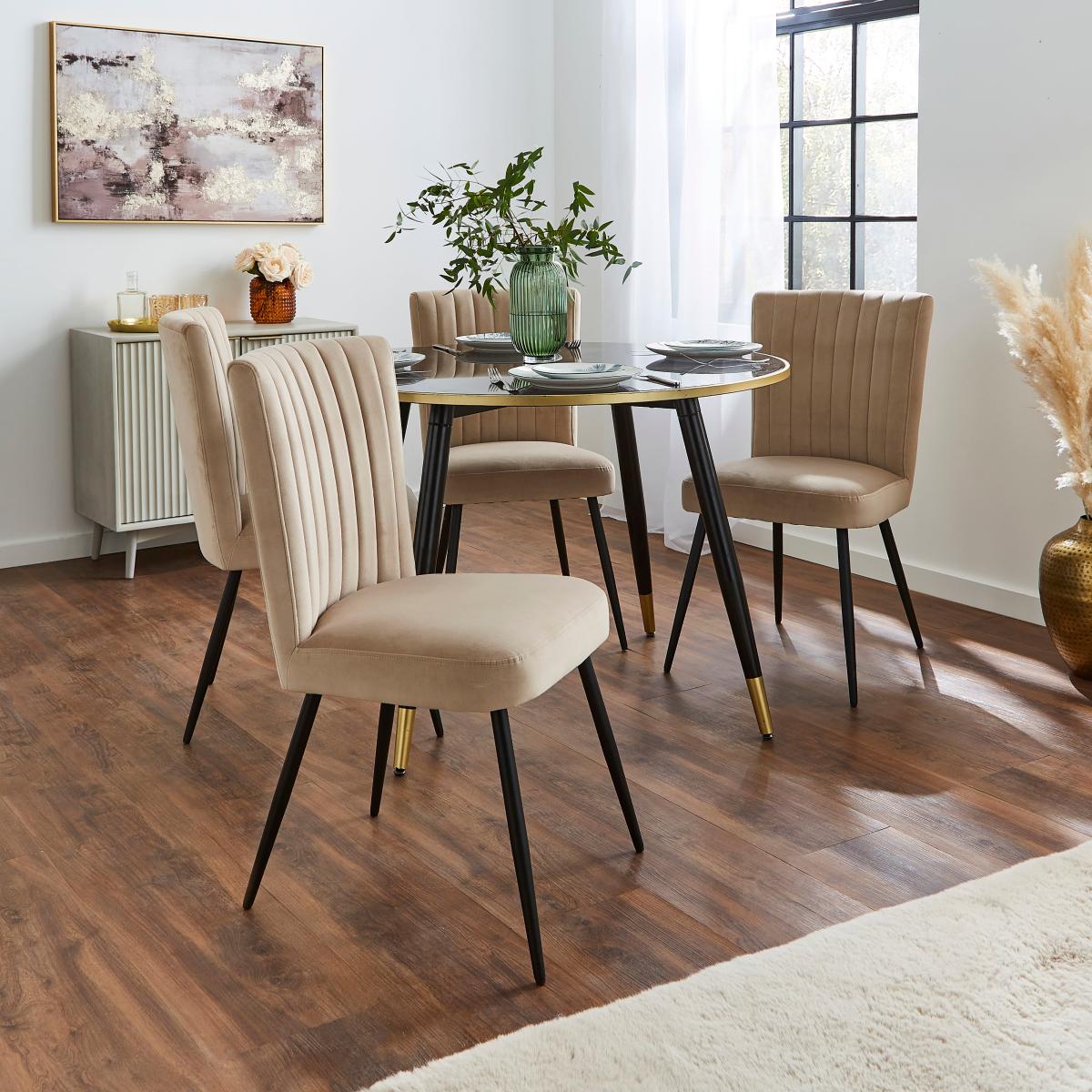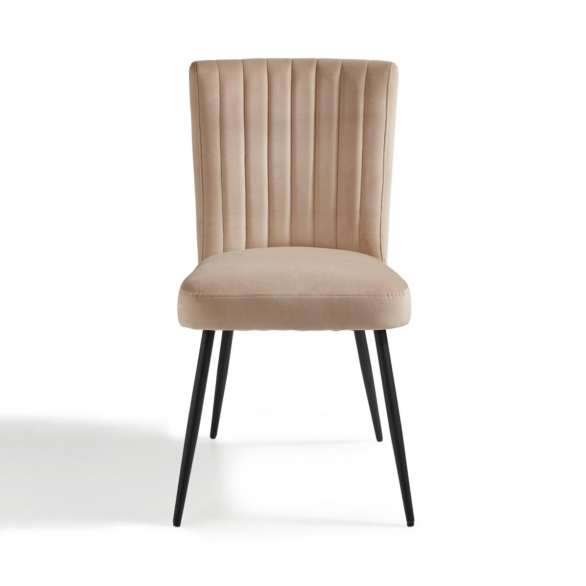 I really like this chair - it’s a stylish addition that combines contemporary elegance with comfort. The velvet mink upholstery adds a touch of luxe, making it suitable for both modern and more classic dining spaces. Its neutral colour helps it blend seamlessly with various colour schemes, while the subtle vertical stitching detail gives it a sophisticated edge. Practical styling tips include pairing it with a glass or marble table to highlight its plush texture, and adding colourful or textured cushions for extra personality and comfort. It works well in smaller dining rooms or kitchens where you want to introduce some understated luxury without overwhelming the space.