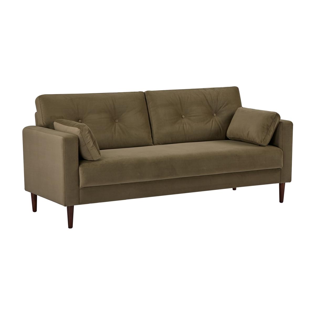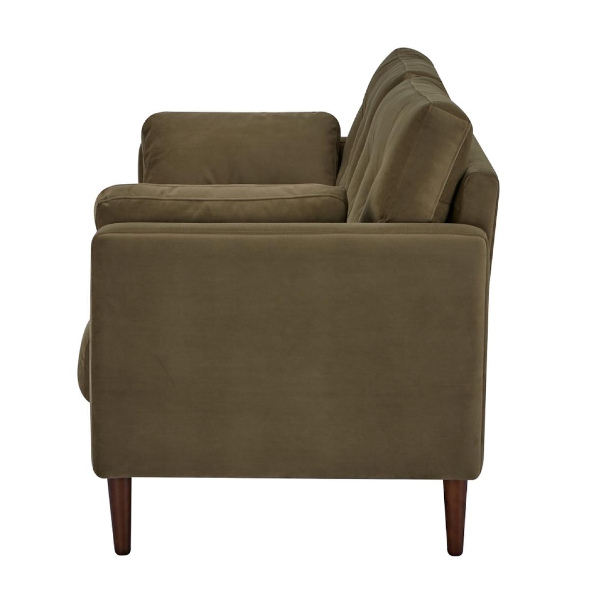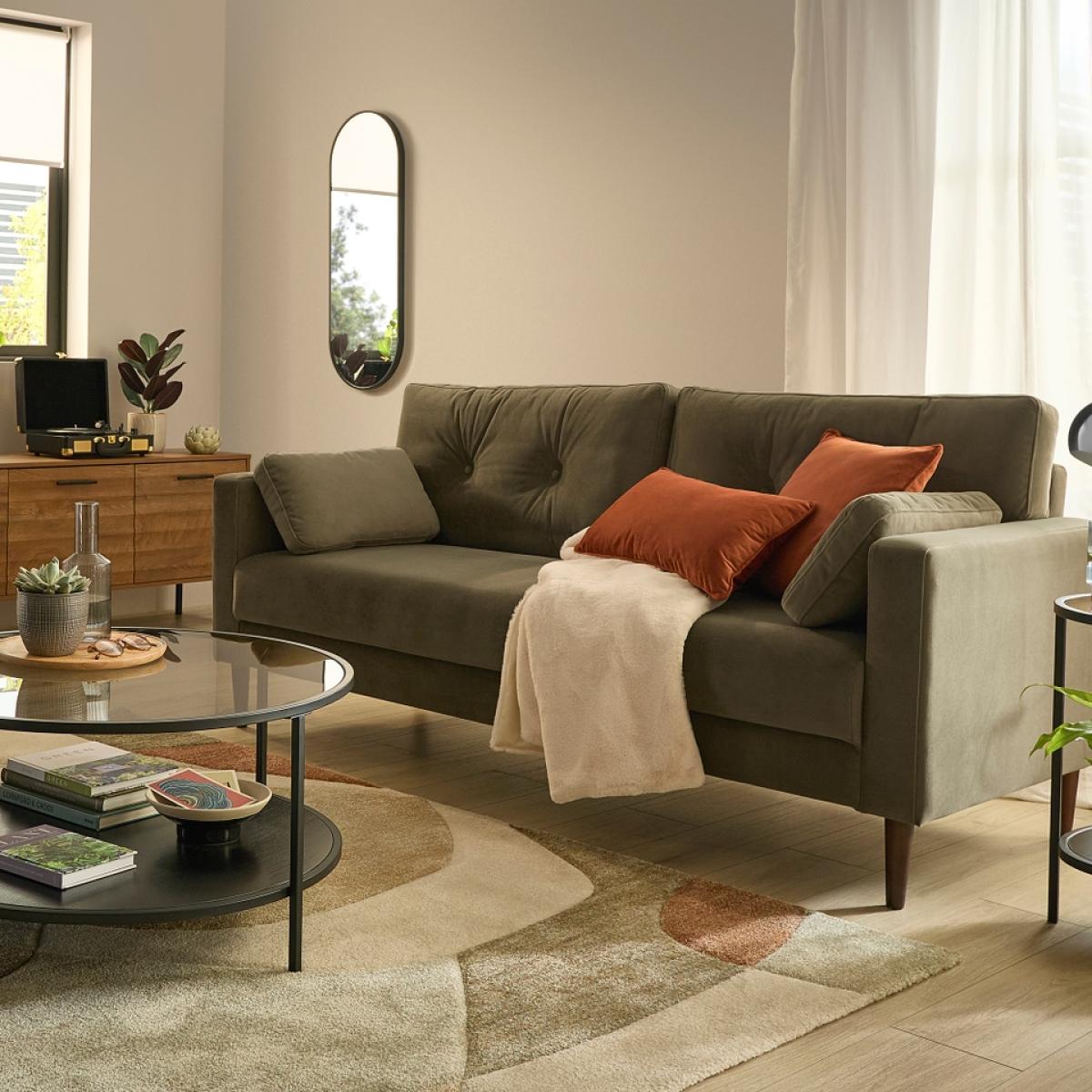 Add a modern retro feel to your living room with the Taylor three seater sofa. The strong bold lines give Taylor a bold personality while the luxurious olive green velvet upholstery bring a warm and cosy feel to your space. The deep foam and fibre filled seat, back and cushions make this the perfect spot to sink in and relax.