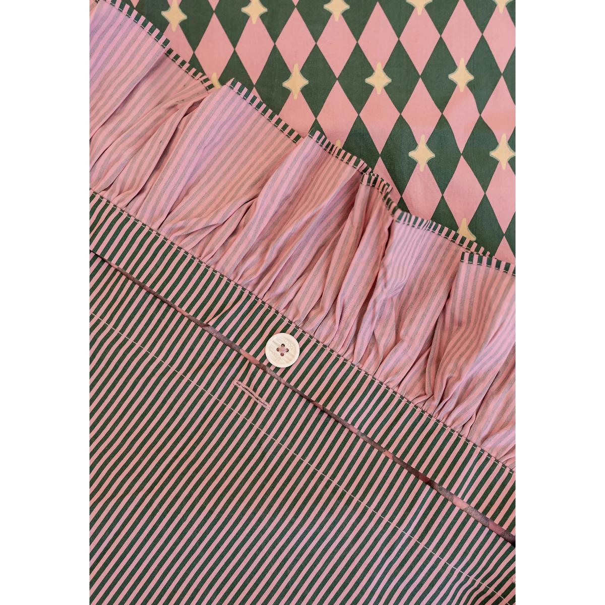 For versatile styling, this soft cotton duvet cover is designed with a harlequin pattern on the front and contrasting stripes to the reverse. * By TBCo * 100% Cotton * Concealed button closure * Ruffle edge * Machine wash * Imported