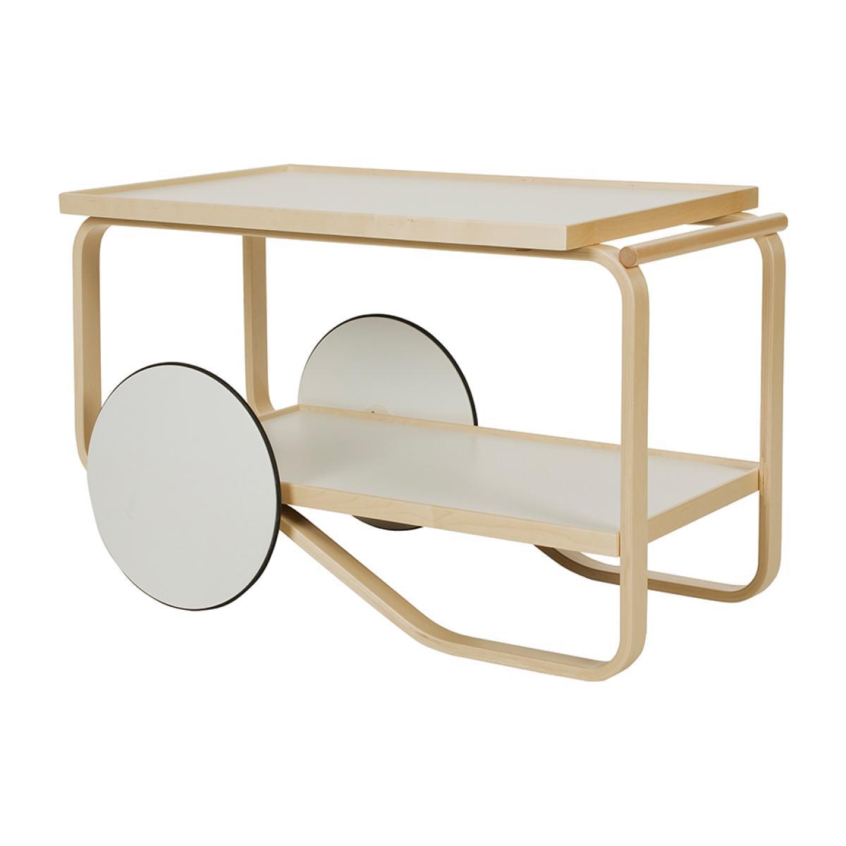 Inspired by the British tea culture and Japanese woodwork that Aino and Alvar Aalto encountered on their travels, the Tea Trolley 901 was designed by Alvar Aalto for Artek in 1936.With a frame crafted from two form-bent solid birch lamella hoops, the trolley features two shelves that are available in black linoleum or an elegant white laminate. Supported by two MDF wheels, the trolley is easily manoeuvrable thanks to its solid birch handle. Alvar Aalto was one of the founding members of Finnish manufacturer, Artek, and embraced strong individuality with focus on designing predominantly for humanity, creating functional and dynamic pieces for public and personal spaces alike. The perfect centrepiece for afternoon tea and cocktails alike, the Tea Trolley 901 would make a stylish addition to any kitchen, dining space or living room.