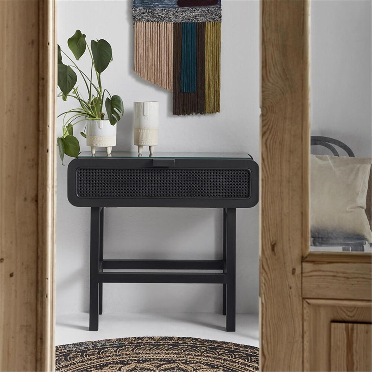 Update your space with this console table from Nordal. Made from solid teak, it has a glass table top with open mesh weaving. Featuring a practical door that opens down, it’s ideal for storing everyday essentials and brings laid-back vibes to any home.