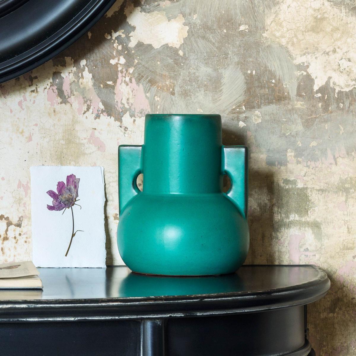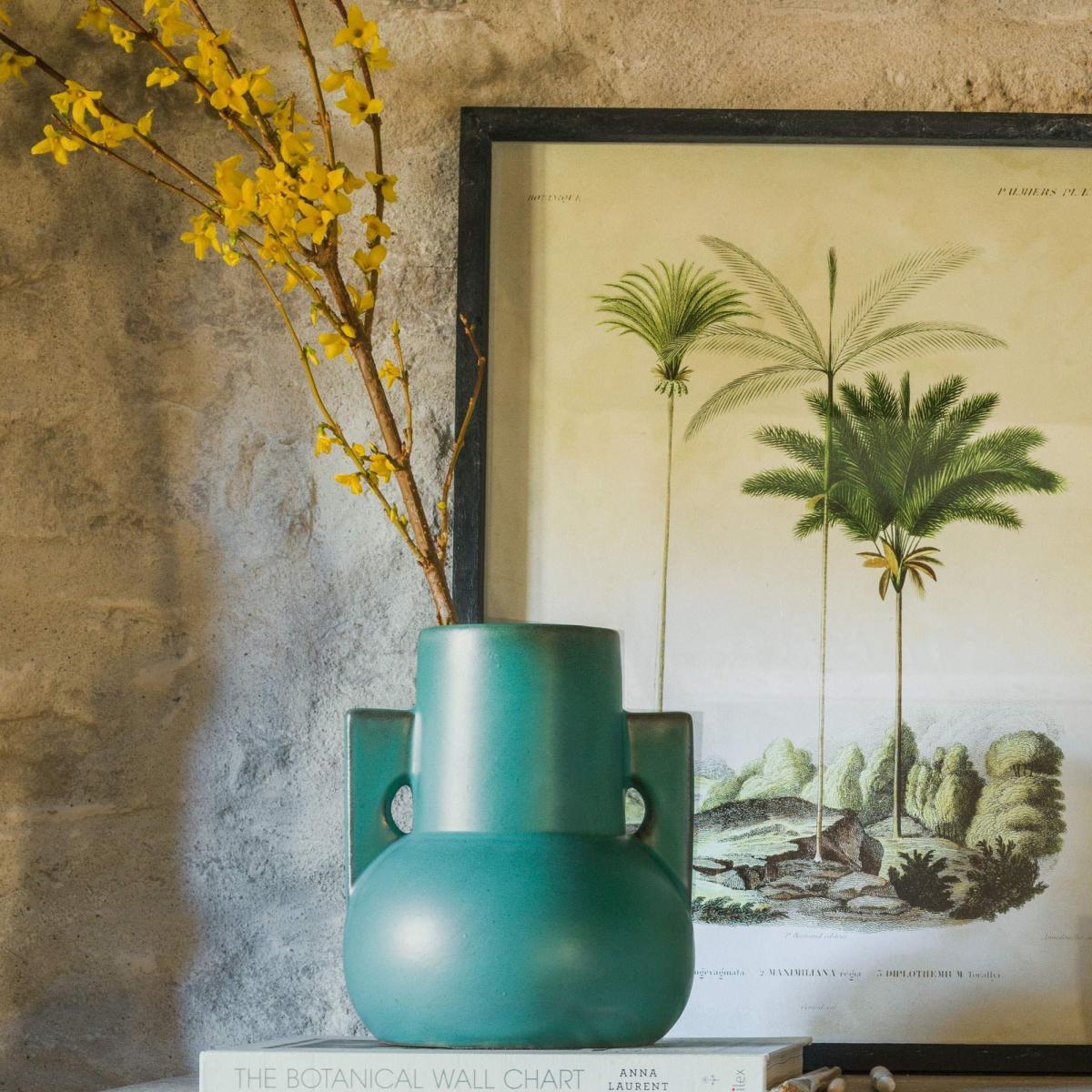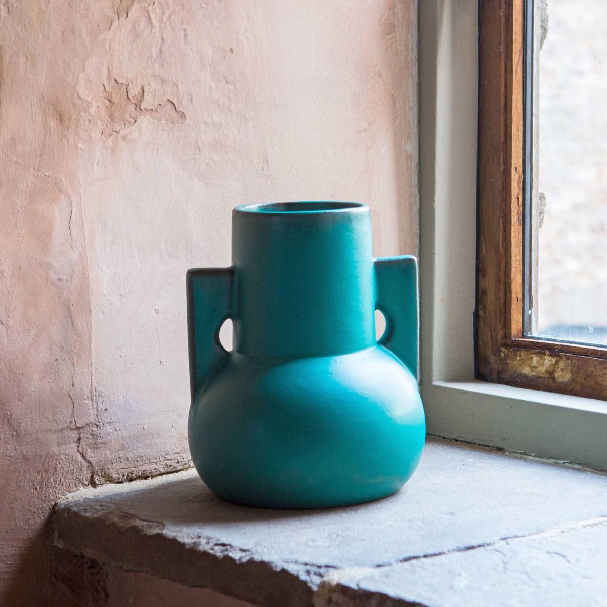 I really like this teal terracotta vase because of its bold colour and sculptural form, which can instantly add a vibrant focal point to any room. It works particularly well in modern or eclectic interiors, where it can be paired with neutral tones for contrast or with other colourful accents for a layered look. For practical styling, try using it as a standalone statement piece on a sideboard or coffee table, or fill it with simple foliage like eucalyptus or dried grasses for a natural touch. Its versatile size also makes it suitable for both small arrangements or even as a decorative object on its own.