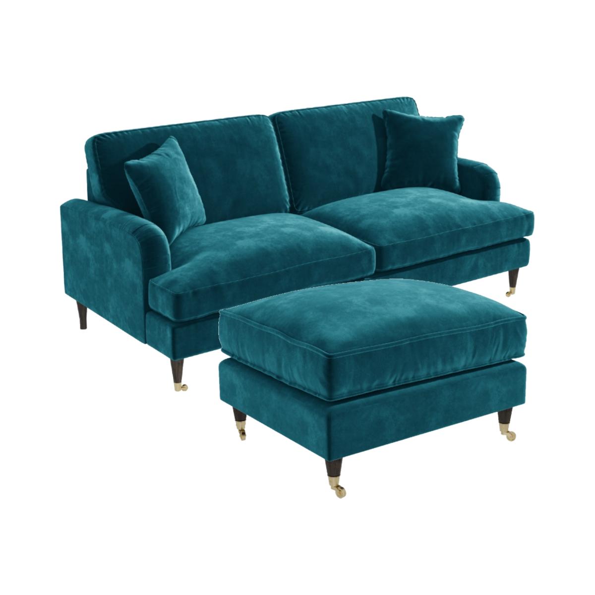 This bundle includes: 1 x Payton Teal Blue Velvet 3 Seater Sofa 1 x Payton Teal Blue Velvet Footstool Features we love Teal velvet three-seater sofa and footstool The perfect modern addition to any living room Soft-touch plush velvet upholstery is right on trend Tailored piping and saddle arm detailing Dark wooden legs finished with gold castors All about me Lounge in ultimate comfort with our Payton three-seater sofa and footstool set in teal. All the cushion covers, including the two scatter cushions, are removable and easy to wipe clean. Filled with spongy foam, the sofa and footstool make the perfect place to relax after a long day. Both items are easy to assemble; simply screw on the legs. Need to know Three-seater sofa Dimensions: W190 x D96 x H85 cm Packaging dimensions: W192 x D98 x H61 cm Weight: 54kg Colour: Teal blue, dark wooden legs, gold castors (front legs only) Finish: Upholstered Material: Velvet (100% polyester), wooden frame and legs and metal castors (front legs only) Filling: Foam Assembly required: Yes - just attach the legs Footstool Dimensions: W75 x D62 x H44 cm Packaging dimensions: W77 x D64 x H31 cm Weight: 10kg Colour: Teal blue, dark wooden legs, gold castors Finish: Upholstered Material: Velvet (100% polyester), wooden frame and legs and metal castors Filling: Foam Assembly required: Yes - just attach the legs