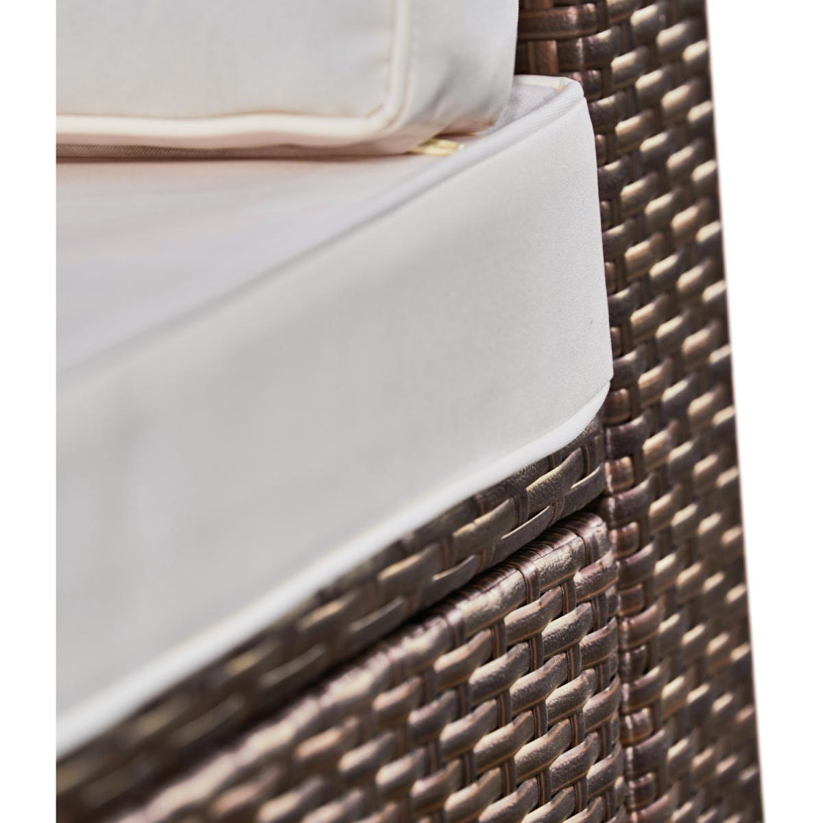 Dark brown woven rattan, 6 Individual rattan chairs and softly padded back and seat cushions with removable cushion covers for easy cleaning. It comes as part of a full outdoor collection and is easy to assemble. 6 rattan chairs into several configurations.