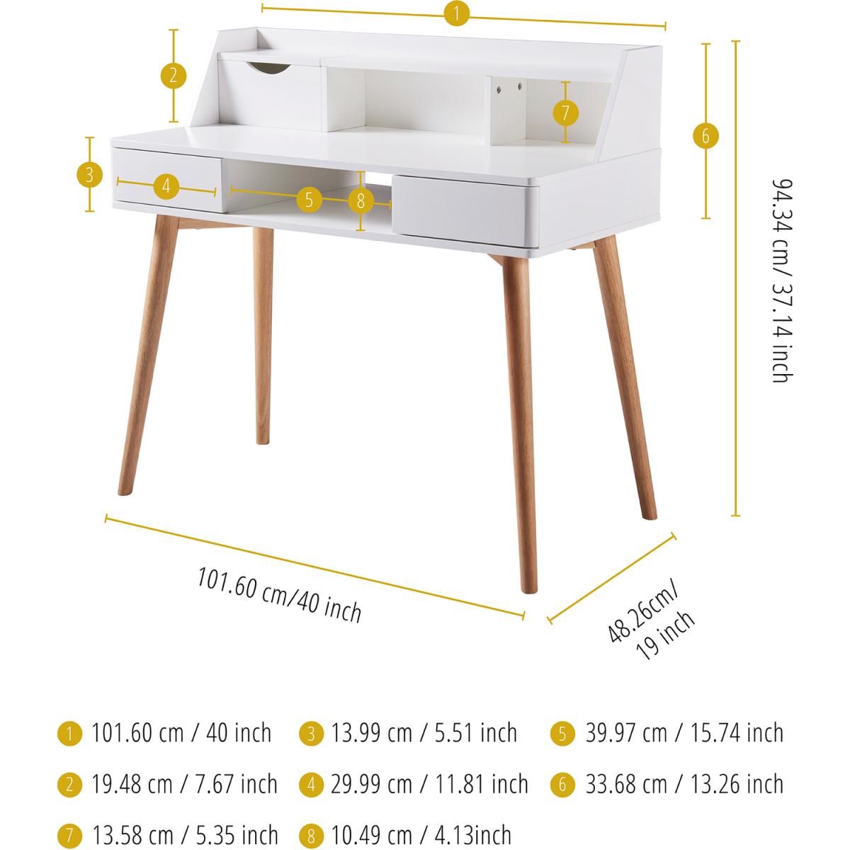 Add a touch of modern organisation to your living space with the Versanora Creativo Wooden Writing Desk with Storage. This stylish desk features a classic white finish with natural tapered legs for a sleek and functional addition to your office or living space. With 3 bottom storage areas and a built-in hutch featuring a flip drawer and 2 cubbies, this desk provides ample space for your media devices and extra storage for electronic devices, office accessories, and more for easy organisation. Constructed from sturdy and eco-friendly MDF, this writing desk is built to last, and its easy-to-clean surfaces make wiping up every day spills a breeze. Purchase this desk on its own or with other items from the Creativo collection to create a complete, updated look. For quick and easy assembly, this modern desk includes step-by-step instructions. The Versanora Creativo Wooden Writing Desk with Storage measures 40" x 19" x 37.14" to provide organisation to your living space without taking up too much room. For over 20 years, Teamson has been manufacturing products of the highest quality along with the best craftsmanship. Offering exceptional toys, lifestyle furniture, and accessories is our mission, and we achieve that mission with our innovative and attractive designs. We strive to continue making long-lasting and eye-catching products that will WOW you and help you create your dream home filled with style and smiles for your loved ones.