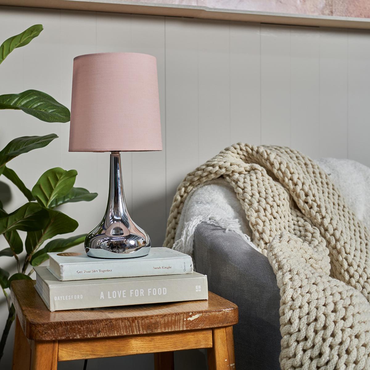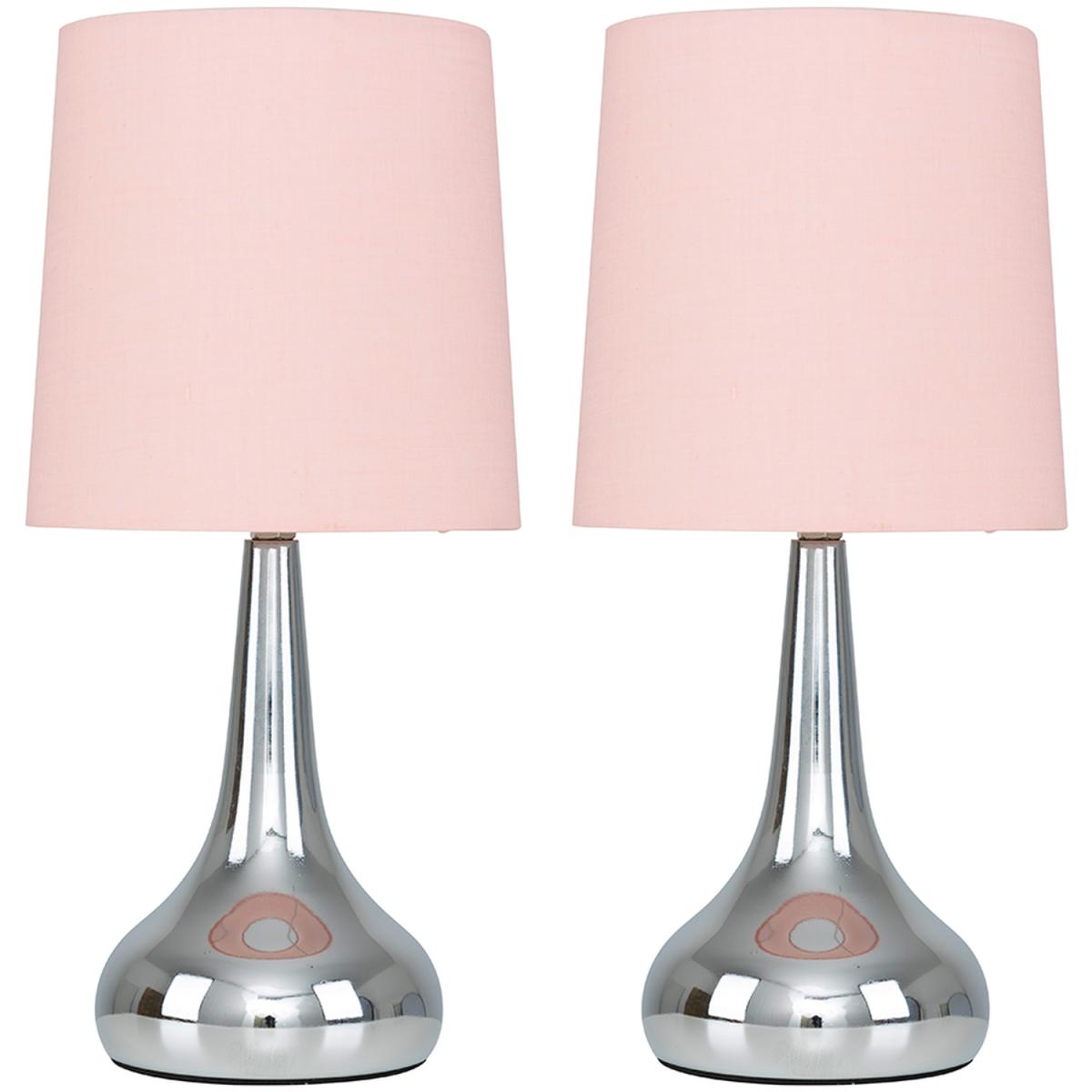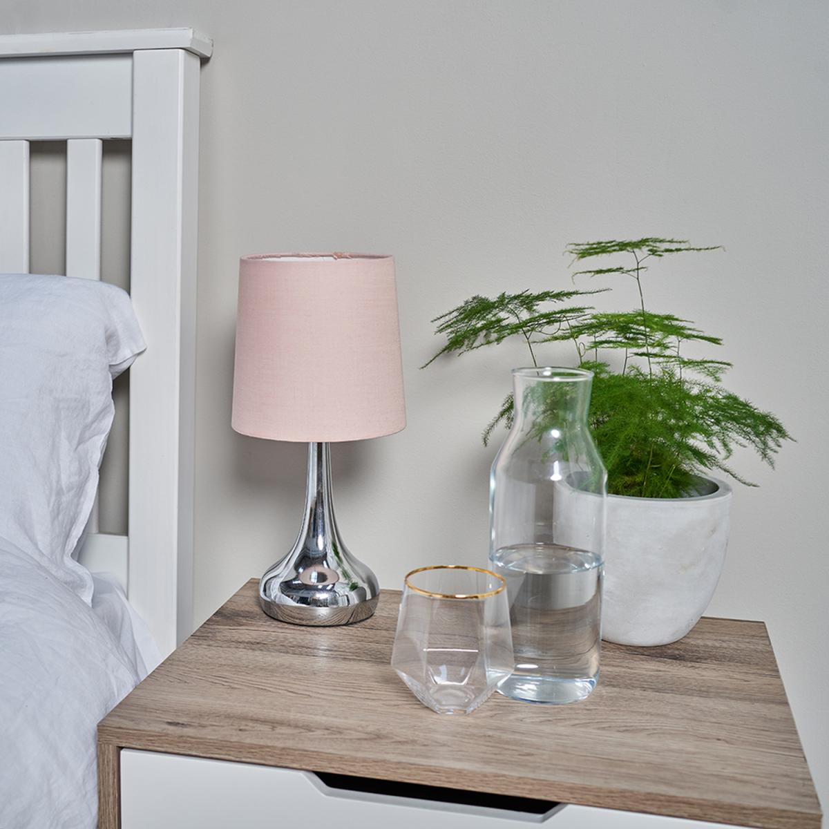 These fantastic touch table lamps with curved polished chrome bases are a wonderful addition to any contemporary home. The pink fabric shades allow the light to be dispersed evenly throughout the room. Simply touch the metal base to turn it on. The light can be set to 4 stages, off, a low level light for mood lighting, a medium level light for general lighting and a high level light which is the brightest setting to create an intense pool of light. Please Note This lamp requires dimmable bulbs. Not suitable for standard LED or energy saving bulbs.