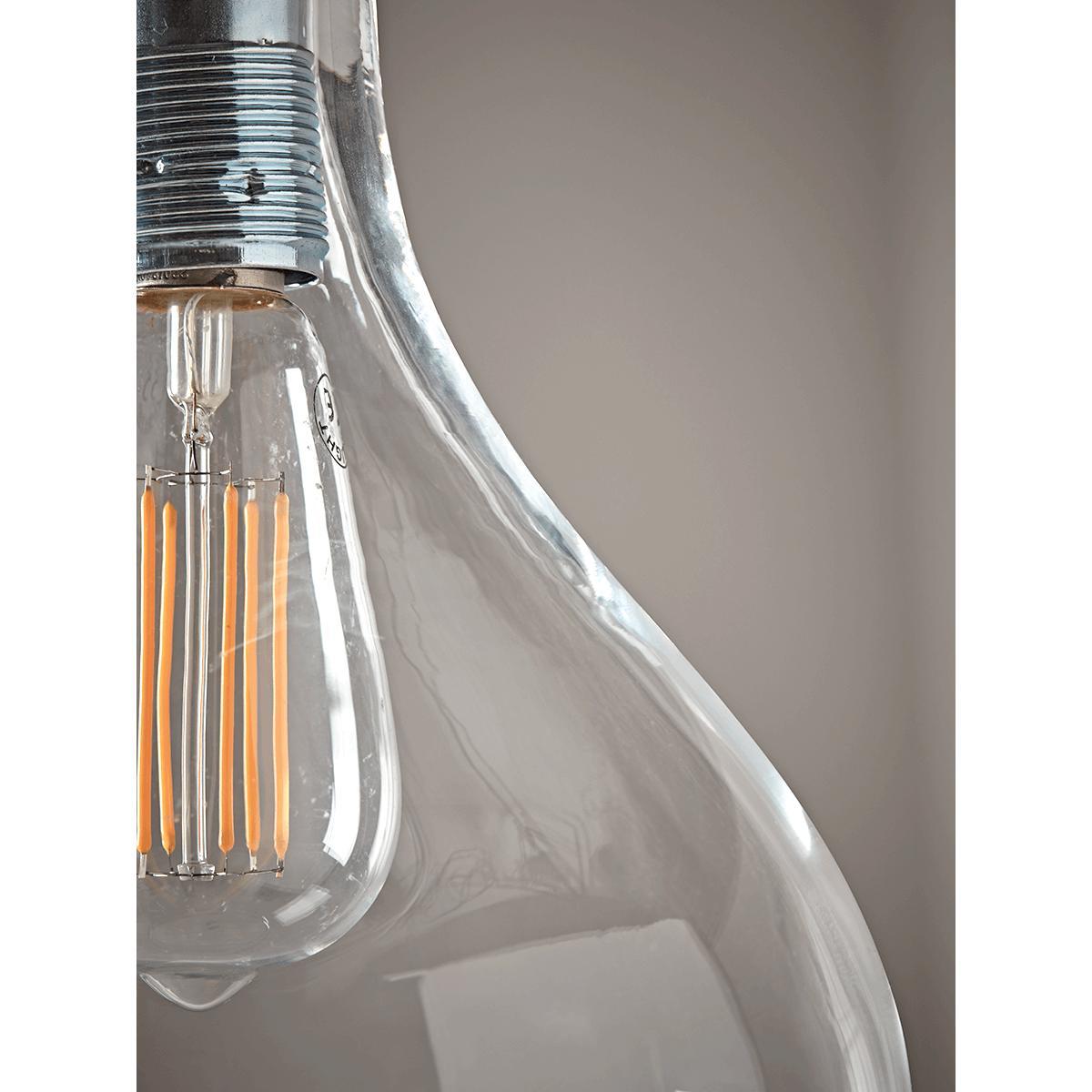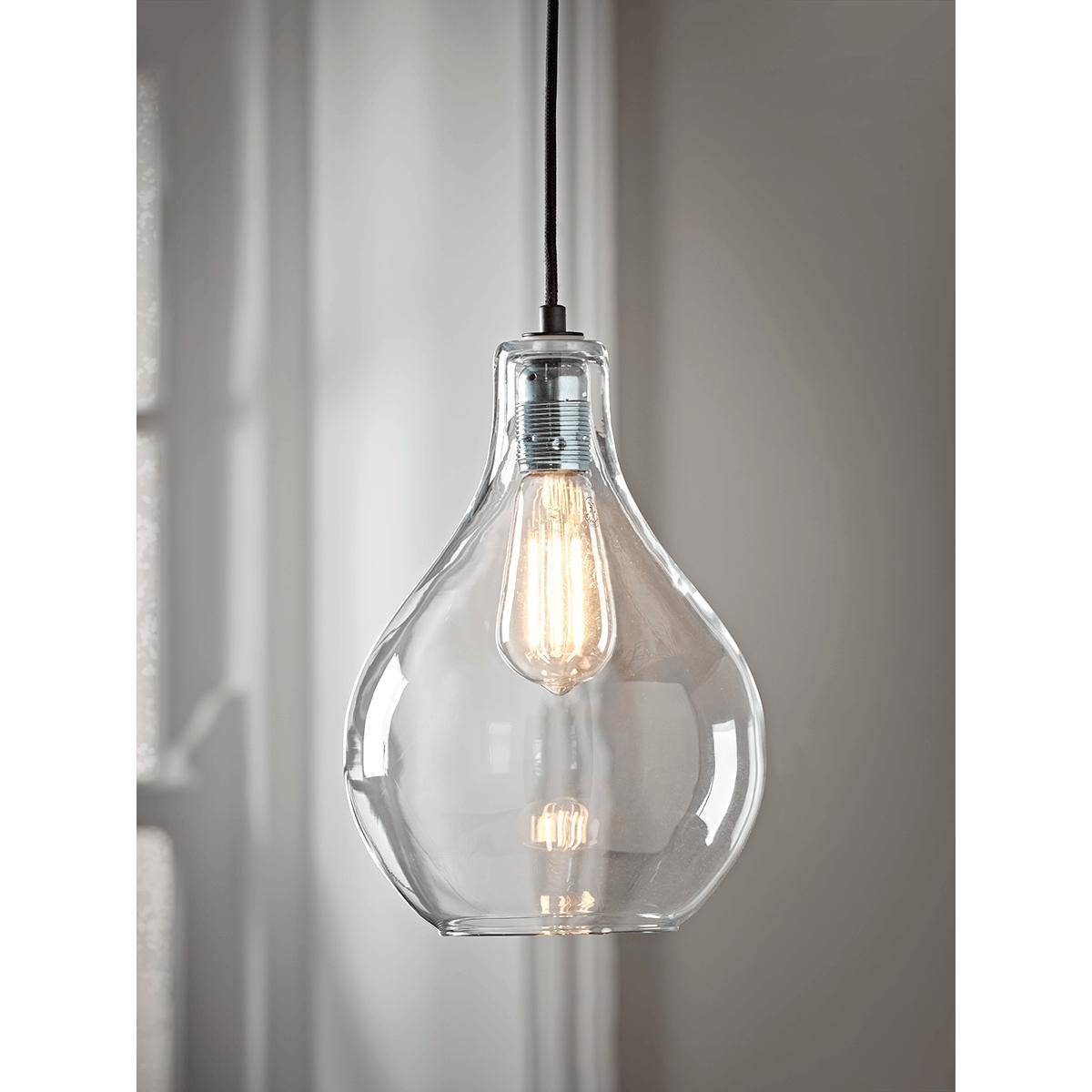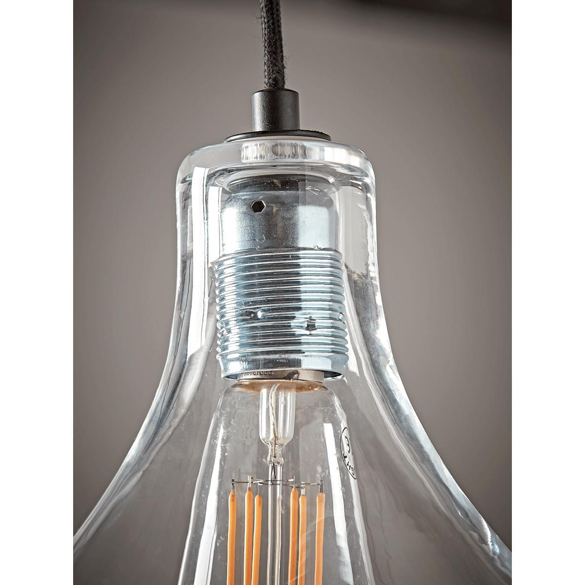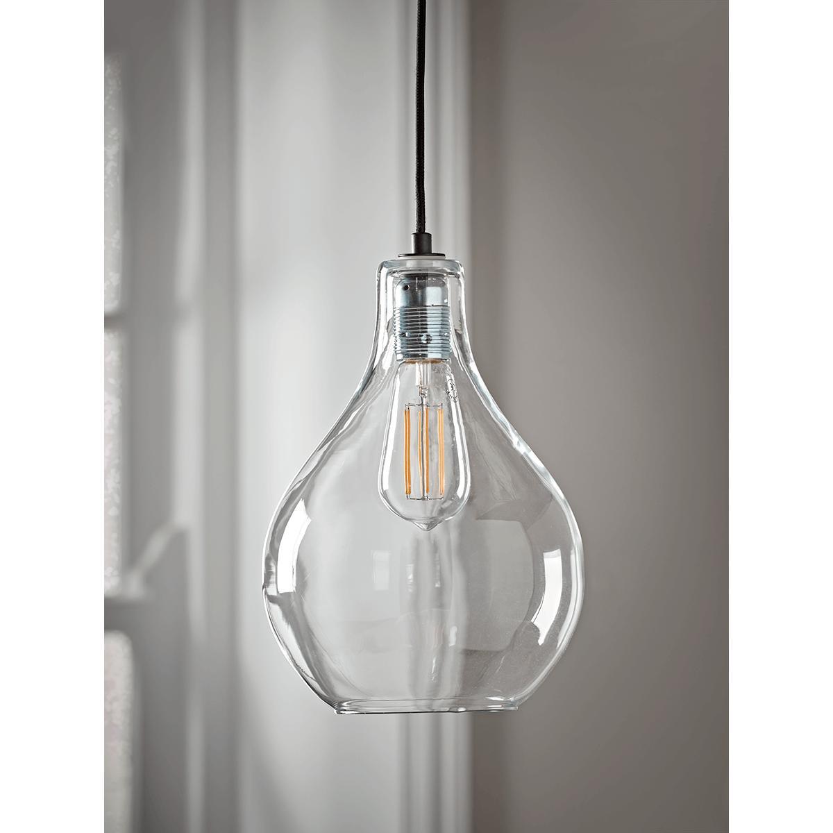 Beautifully simple and elegant, with a voluminous, teardrop shaped shade in crystal clear glass, our fabulous ceiling pendant will add class to any room. Each light features a simple bulb fitting and black plastic flex.
