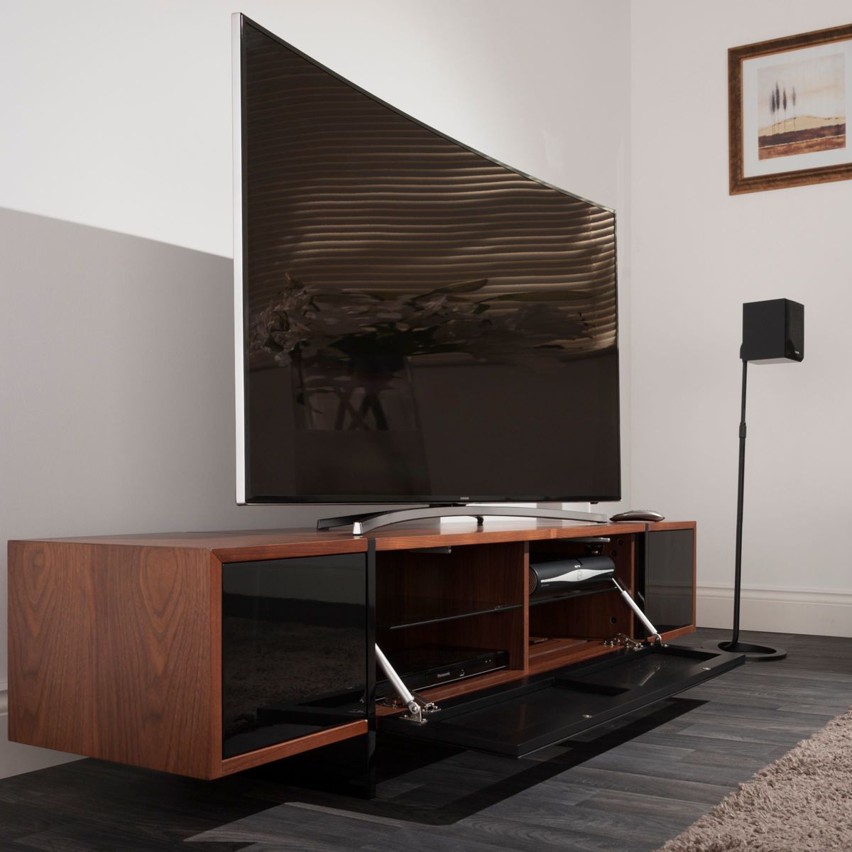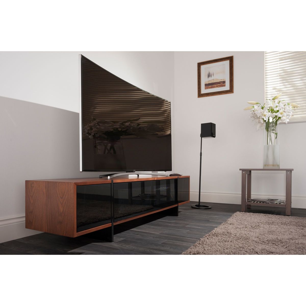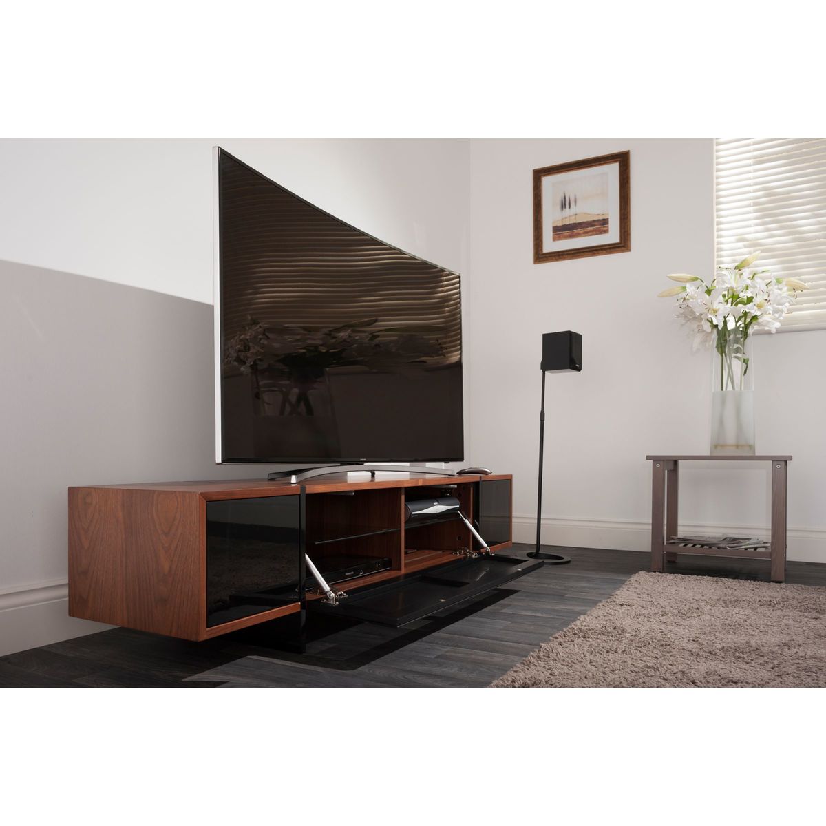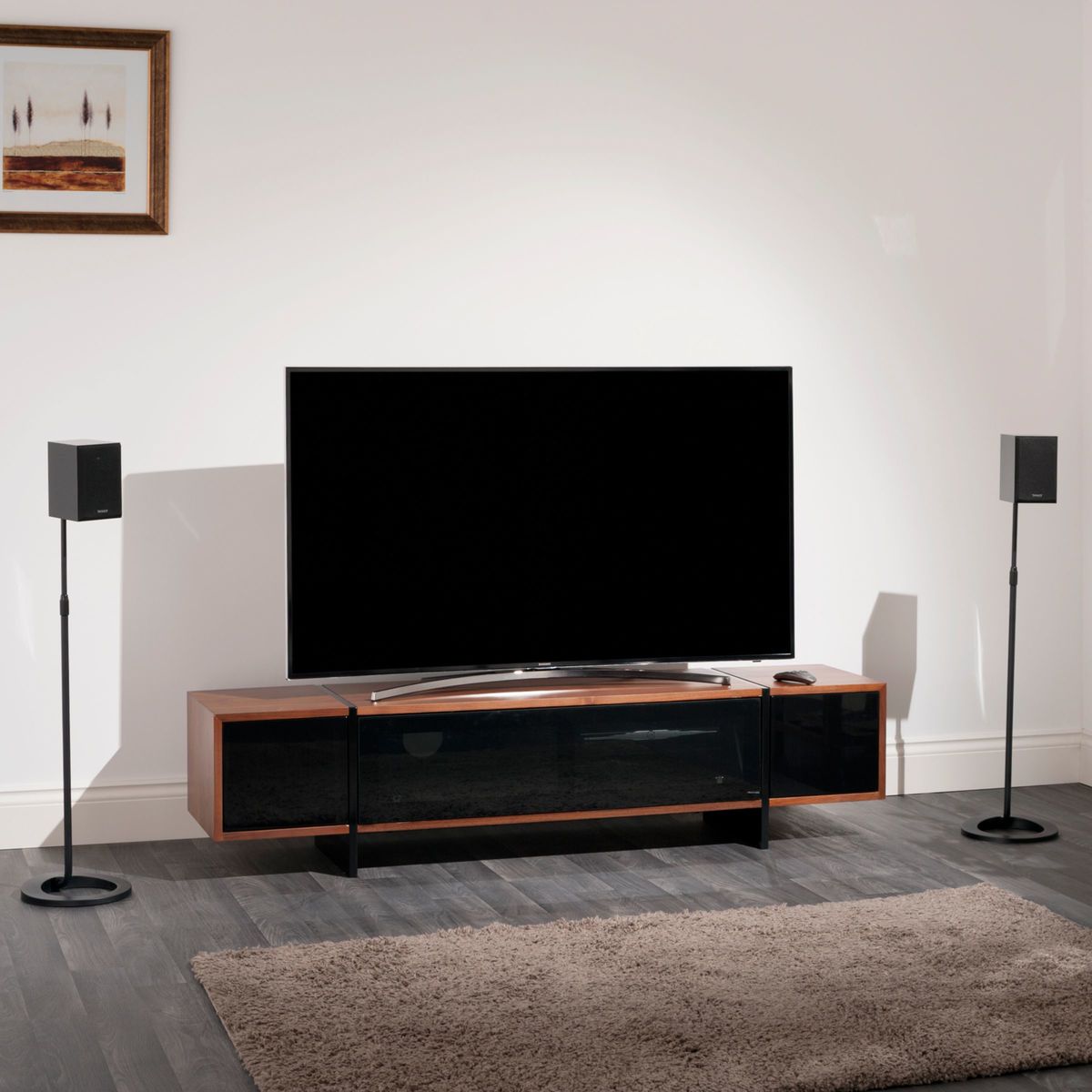 With simple sophistication, the Edge makes a beautifully contemporary stand and storage cabinet for a large TV and home entertainment set-up. Rich wood design with contrasting legs support generous storage space with a door on each side. The central remote-friendly drop-down door allows full practical use of concealed equipment. A central glass shelf provides ample storage for media players, consoles and Hi-Fi equipment. Cable management keeps clutter out of sight and integrated ventilation ensures optimum air circulation around your tech. Key Features: Solid, minimalist design Top of unit can support up to 50kg, shelves can support up to 30kg 38cm depth Real wood veneer with solid satin colour Assembly Required Please note: Any maximum TV size quoted is a recommendation only and the exact dimensions of the TV's pedestal/feet should be checked to ensure it fits prior to purchase.