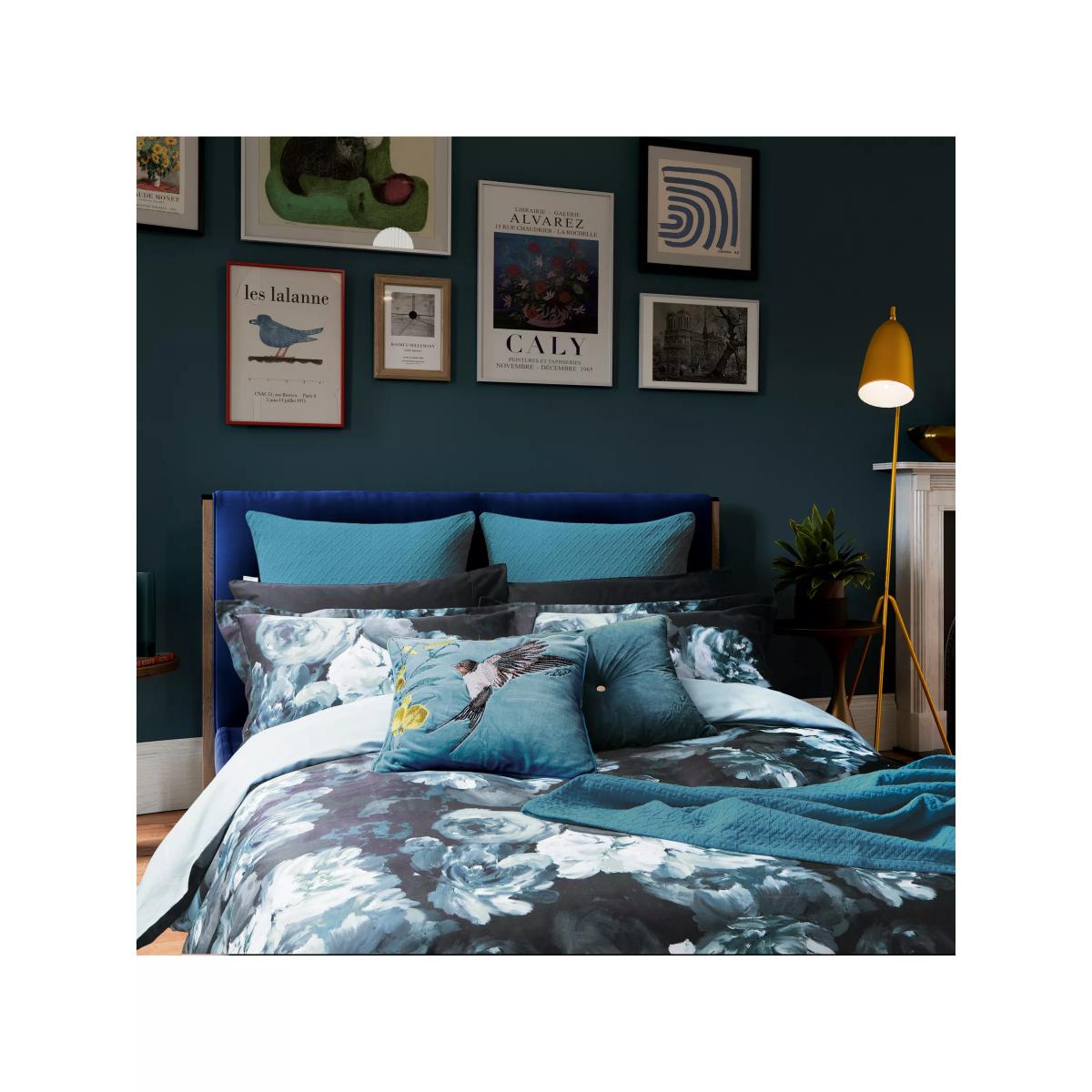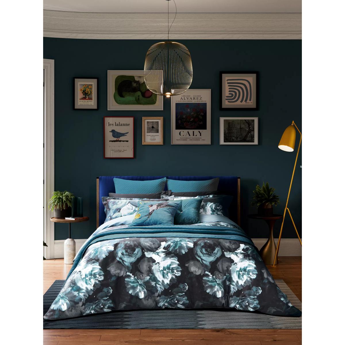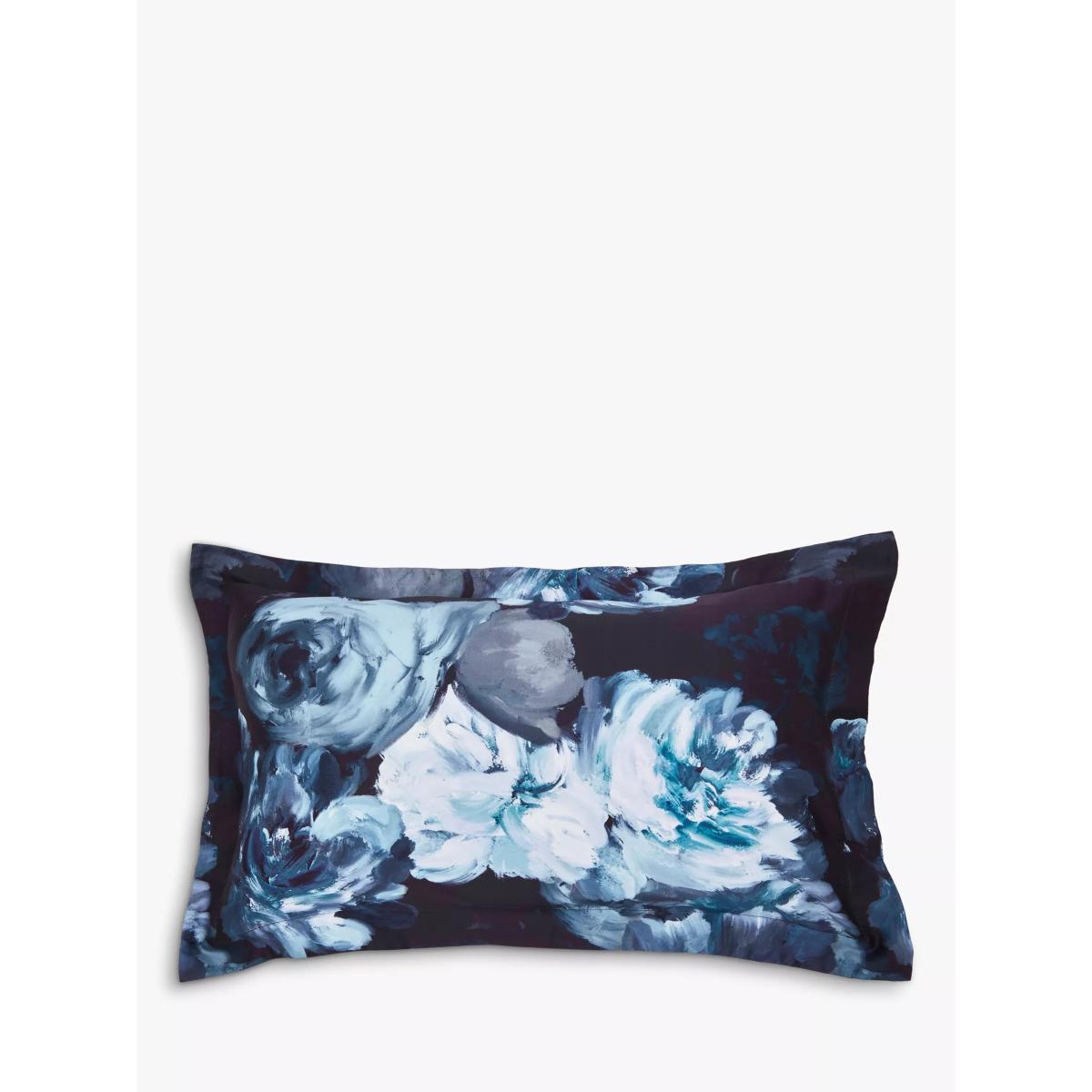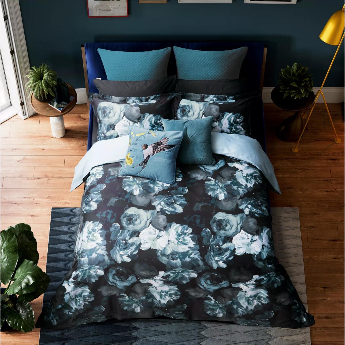 Embrace your love of nature with this eye-catching bedding featuring oversized, painterly blooms captured in moody teal and inky blue tones, contrasted against a black ground. Digitally printed on a super soft 220 thread count cotton sateen and teamed with a plain blue reverse. All sets include two Oxford pillowcases. Bedding sizes To fit duvet/pillow size (cm) Oxford pillowcase to fit 50cm x 75cm excluding frill Double duvet cover to fit 200cm x 200cm Kingsize duvet cover to fit 225cm x 220cm Super kingsize duvet cover to fit 260cm x 220cm
