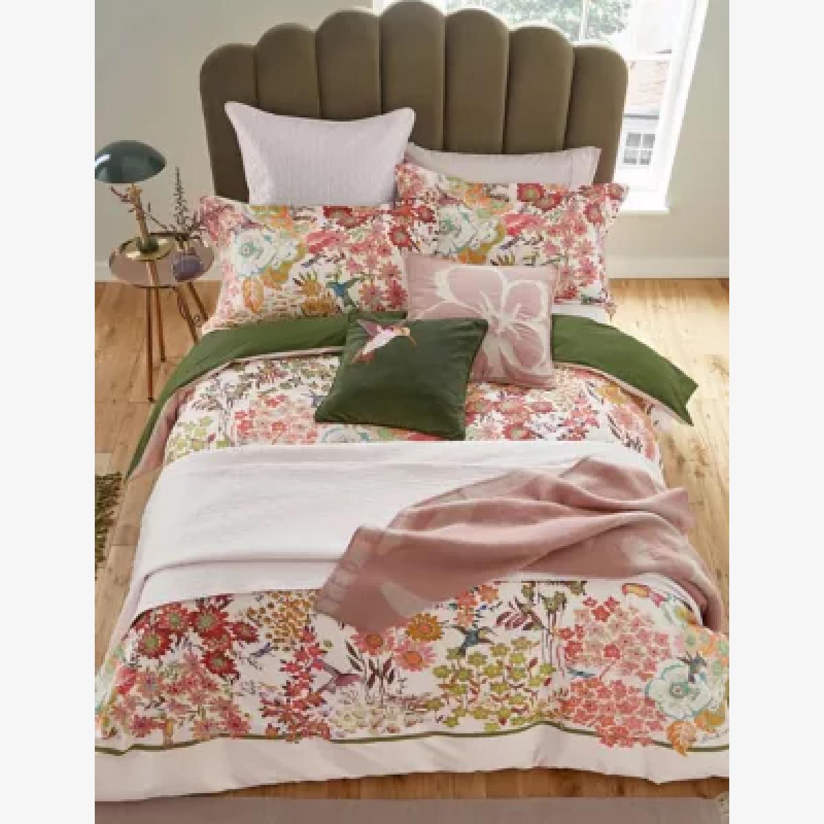 I love the retro hummingbird design for its vibrant, playful aesthetic, making it a real statement piece in the bedroom. It’s versatile enough to work in both contemporary and eclectic interiors, where you want to introduce colour and pattern without overwhelming the space. Styling tips include pairing it with neutral or muted bed linens for a balanced look, as seen here with the soft pink and green accents. The sateen finish adds a subtle sheen, elevating the overall feel. For a coordinated look, consider mixing with floral or botanical-themed accessories to highlight the nature-inspired motif, or keep accessories simple if you want the duvet cover to be the focal point. It’s practical too, being made from pure cotton, ensuring comfort and durability.