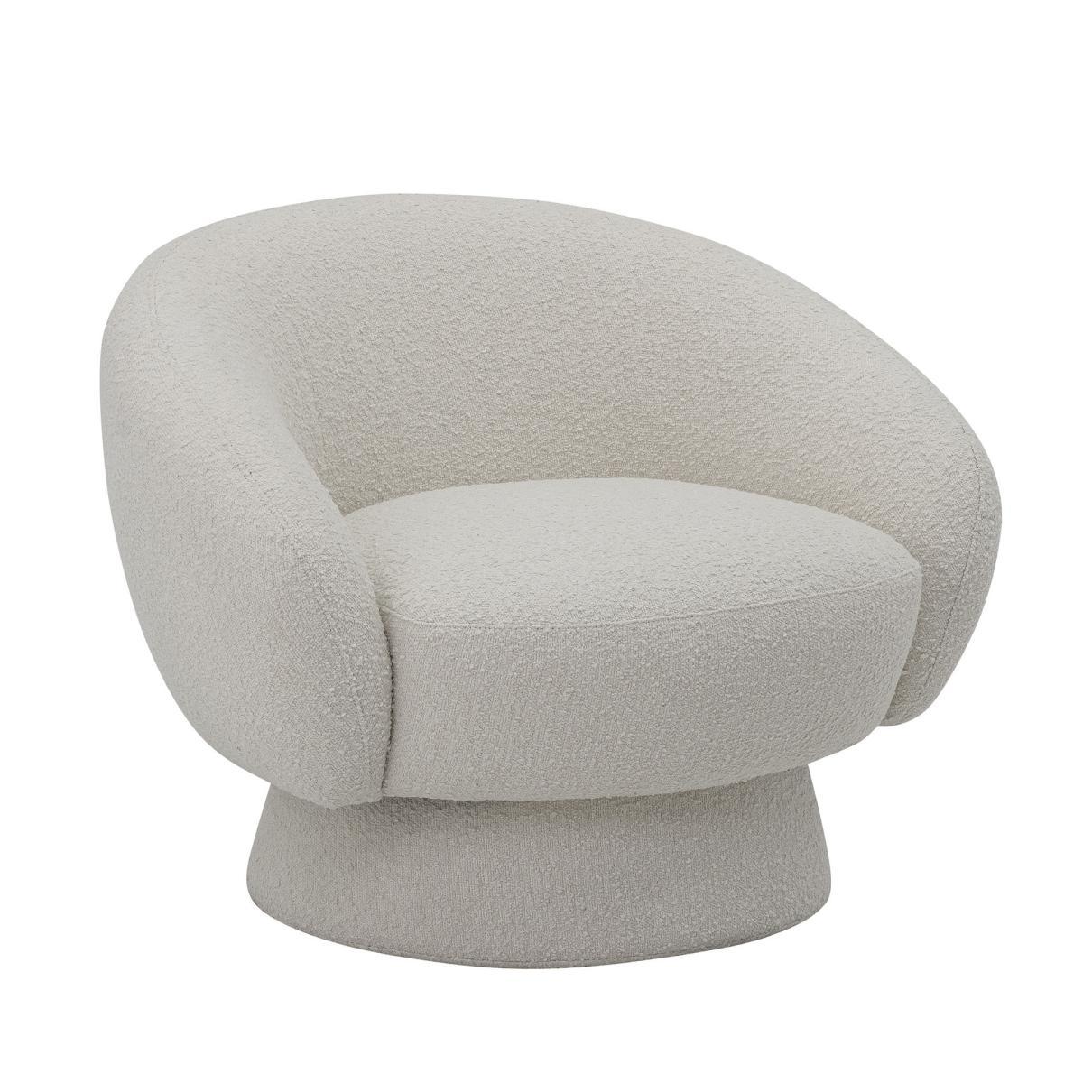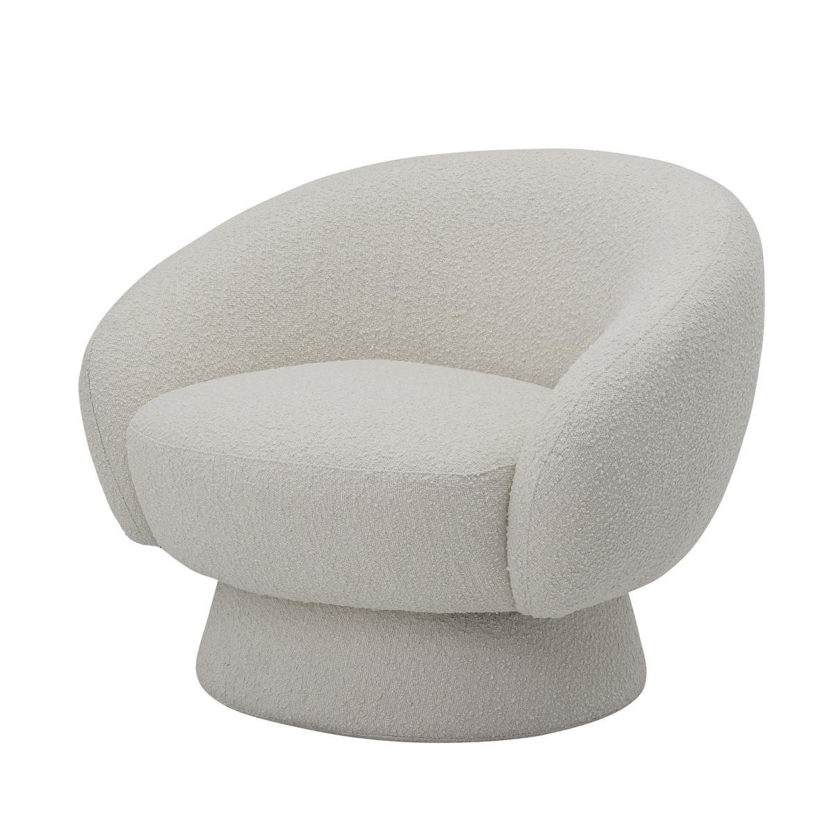 A seventies inspiration for this large enveloping armchair with curved lines. It will become the centrepiece of your lounge. Its rounded contours form a comfortable seat. It is decorated all over in an elegant bouclé fabric, a tactile, cosy and comforting material. Its natural and simple look matches all kinds of décors.