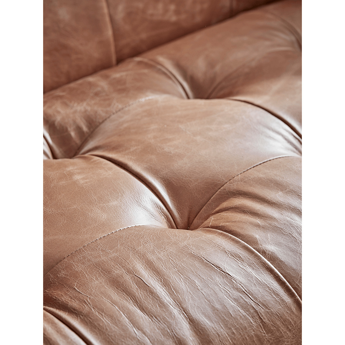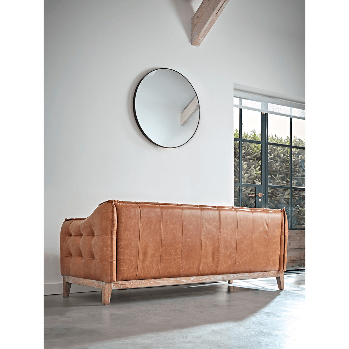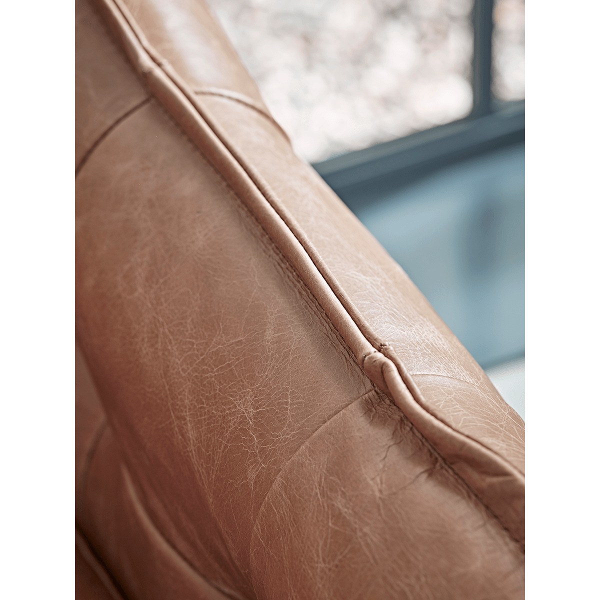 Our plush and ever so stylish sofa is a statement piece upholstered in a mellow brown vintage look leather, with a deep and decorative buttoned seat and low buttoned back. Perched atop four solid ash wood legs our Teddington Sofa has a seam detail to each arm rest which accentuates the wonderful curved feature. Our beautifully toned sofa with its relaxed form would sit well in a layered Industrial toned room to create a warmer, club house feel.