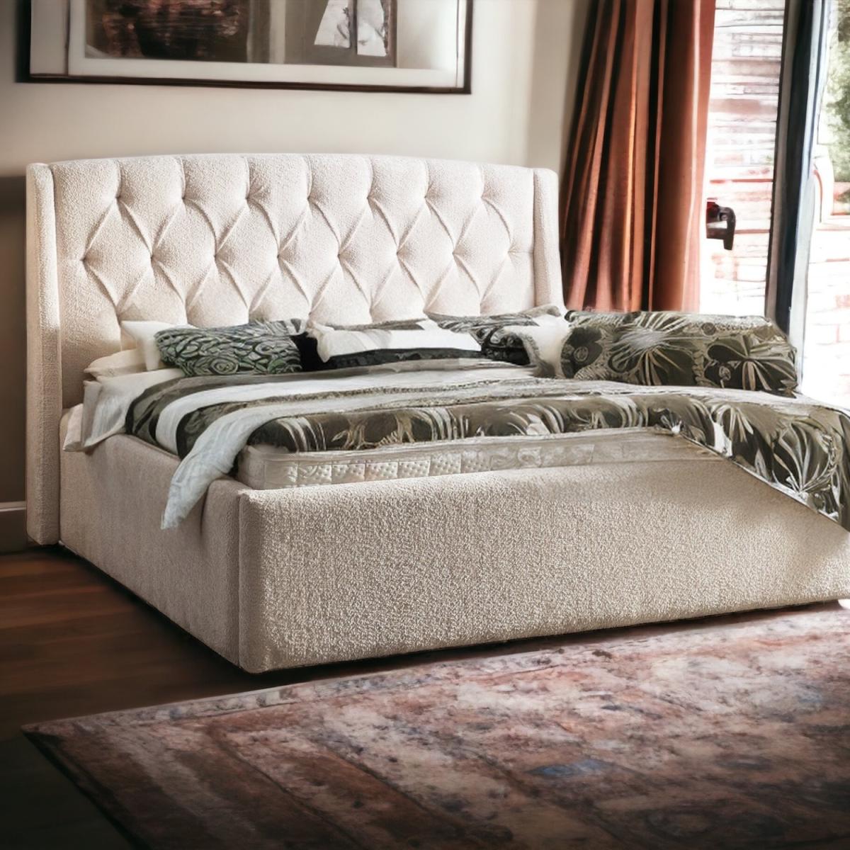 Our Teddy Boucle wingback bed frame featuring the luxury Teddy fabric. In the deep button chesterfield design mixed with our tapered wingback frame this bed is luxury and fine craftsmanship at its best. High comfort and new fabric design. 54 inches high headboard with added upholstered wings. High Quality.