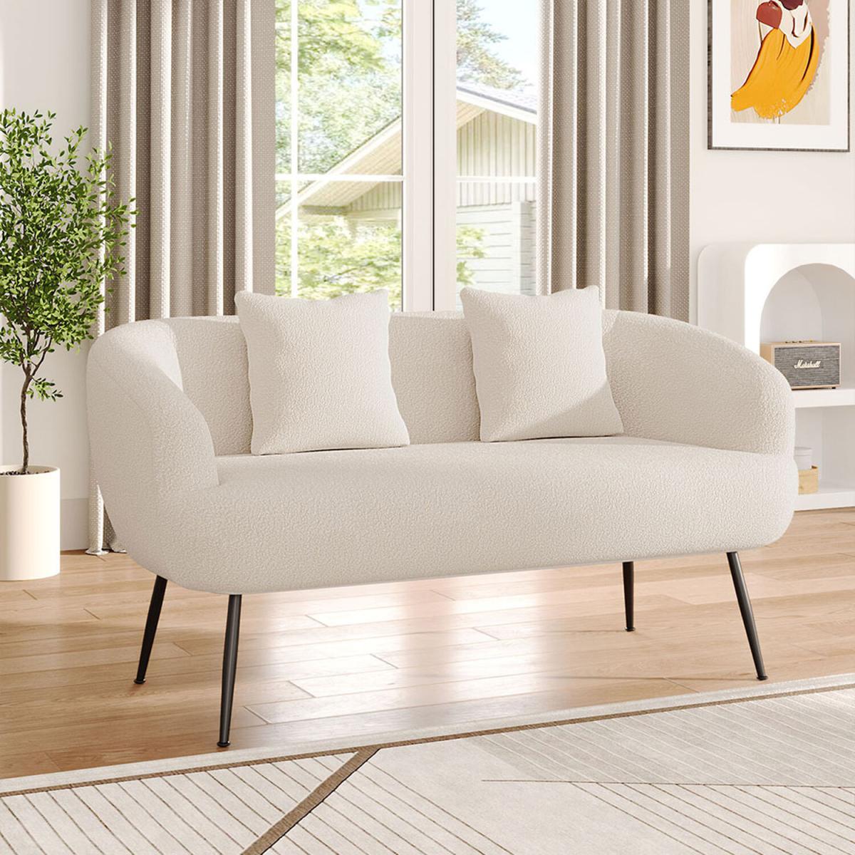 Bring cozy charm and modern simplicity to your home with the White Teddy Fabric Sofa from Livingandhome. Wrapped in ultra soft teddy fabric, this sofa combines comfort with contemporary style. Its gently rounded silhouette, foam filled backrest, and curved arms create a welcoming feel that is perfect for lounging, reading, or casual entertaining. Crafted with a sturdy wooden frame, it offers lasting support, while the slim tapered black metal legs add a touch of elegance and visual lightness. Ideal for modern living spaces, this piece is as stylish as it is snug.