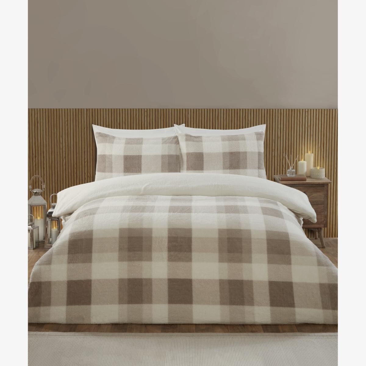 Teddy Fleece Printed Check Duvet Set - Natural / Double