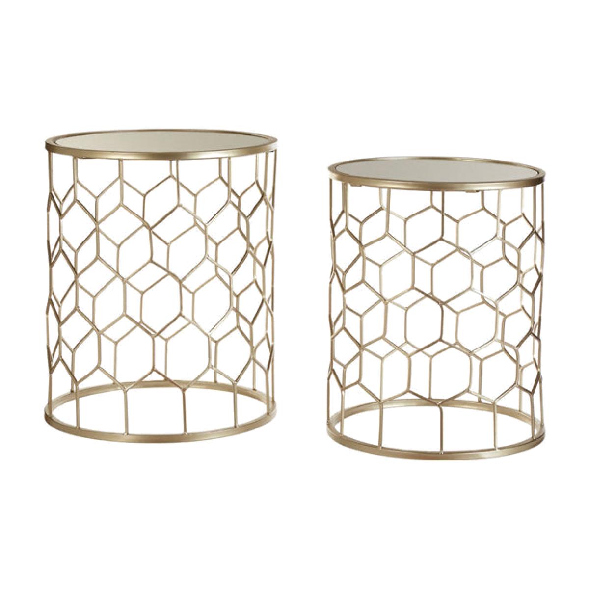A set of two mirrored top side tables that can be used to add a geometric accent to the living room.