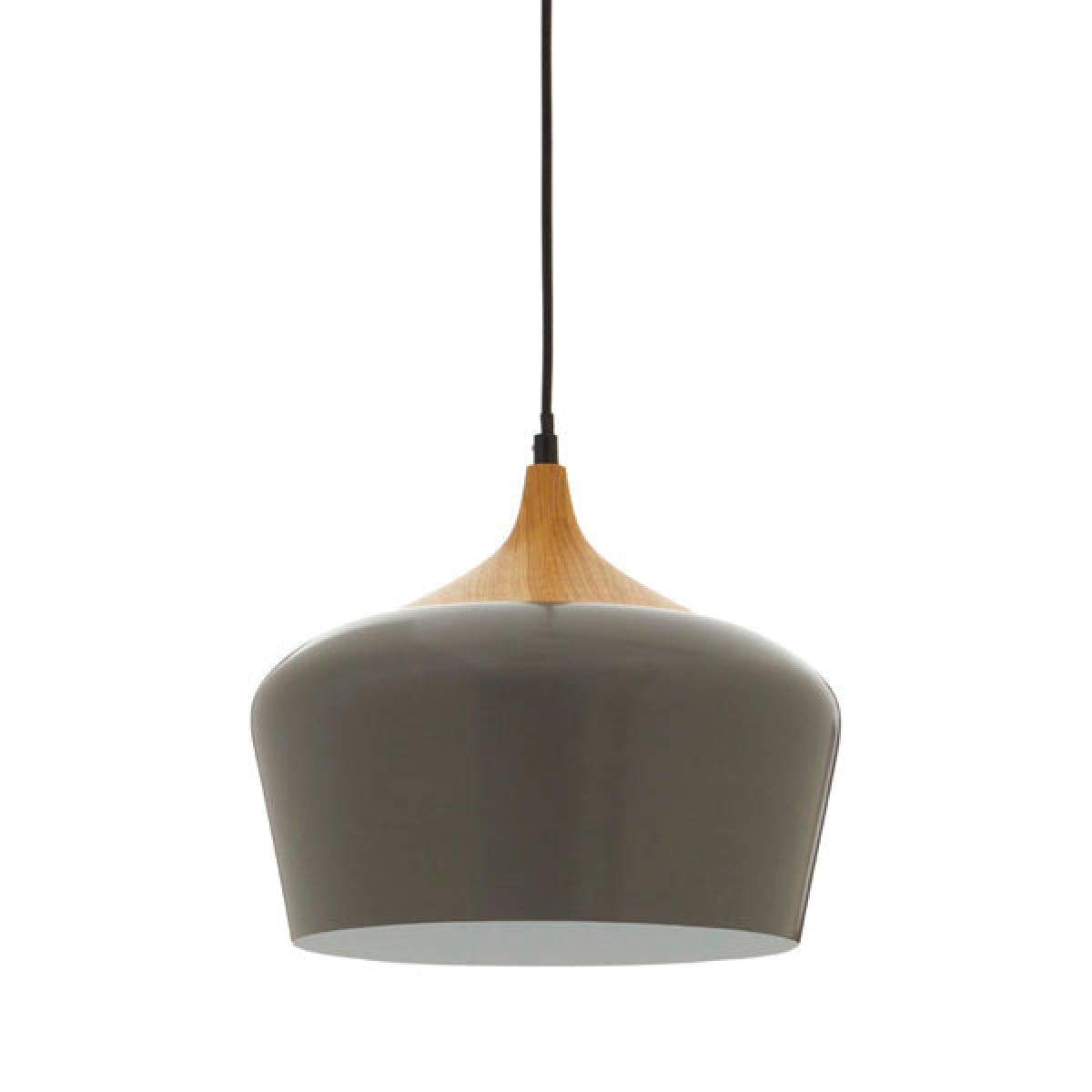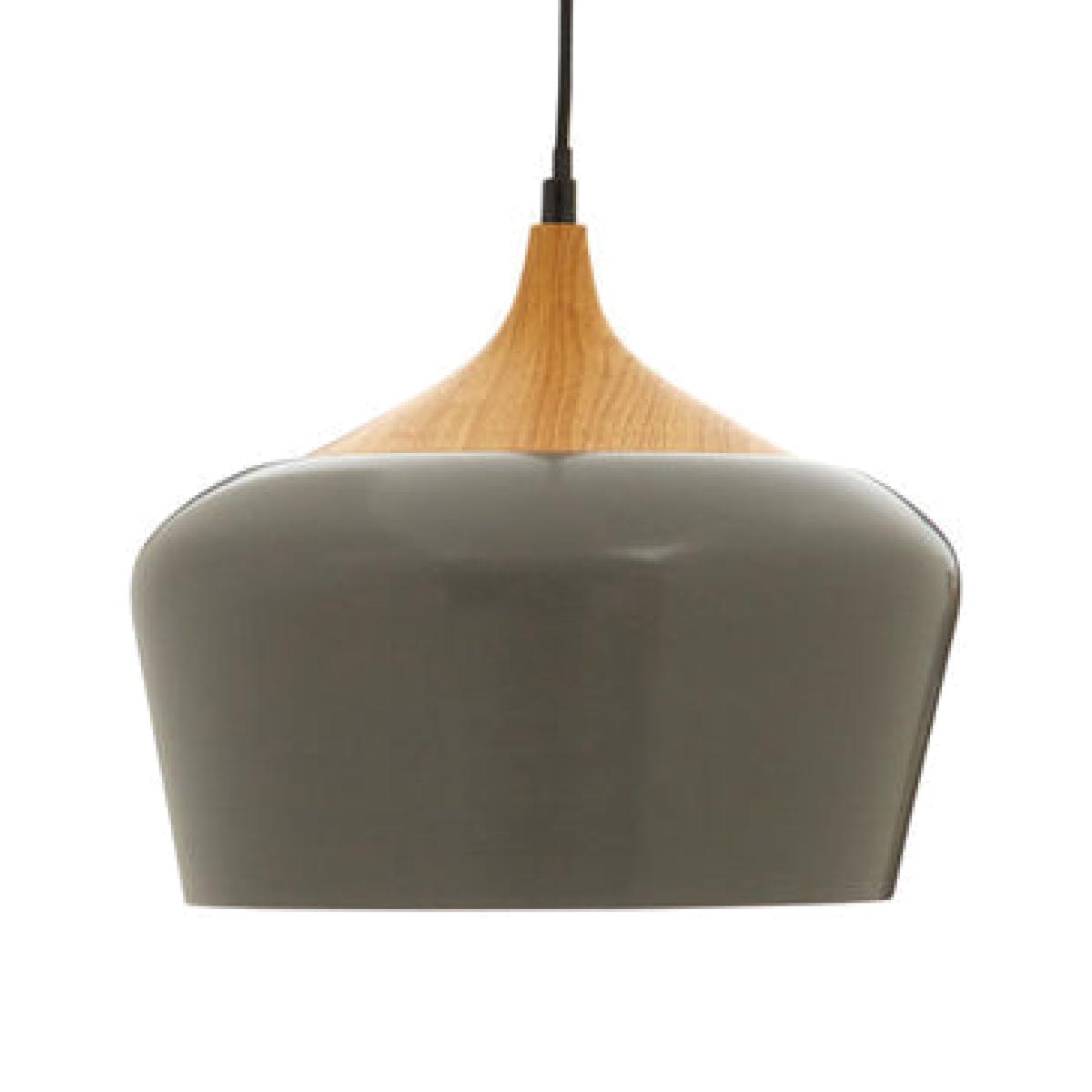 This delicately shaped pendant light merges grey metal with natural wood.