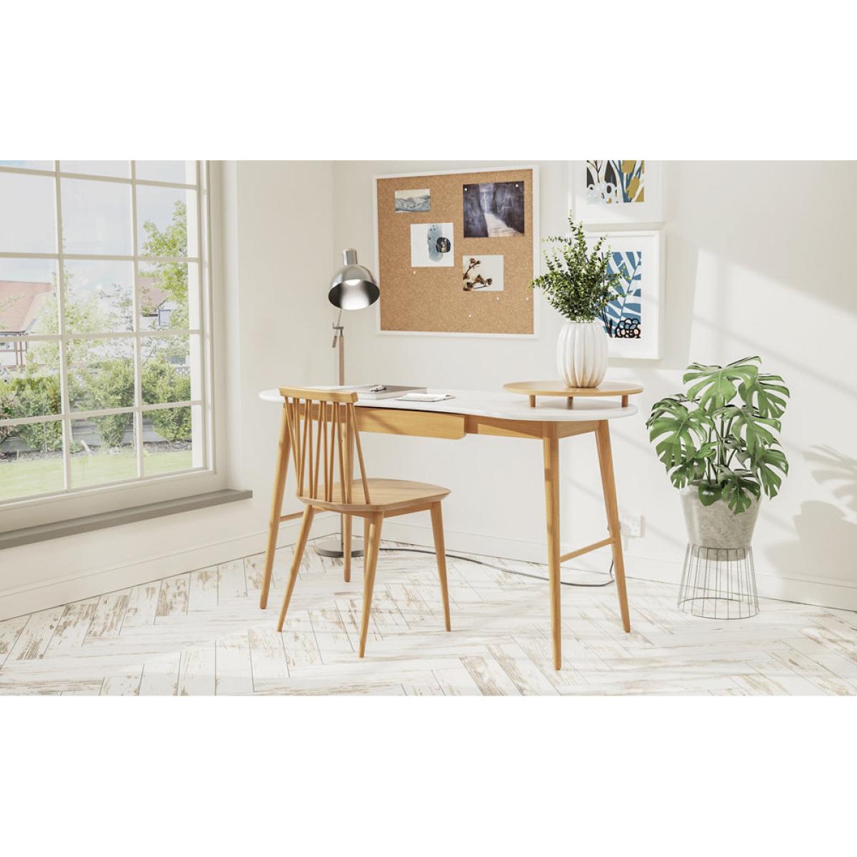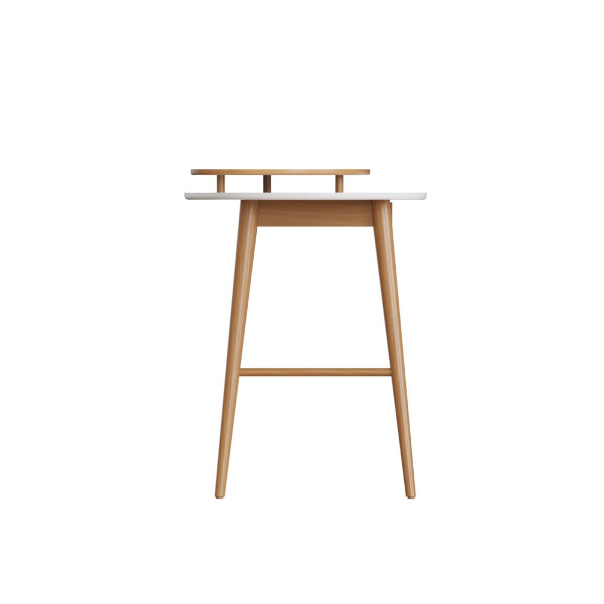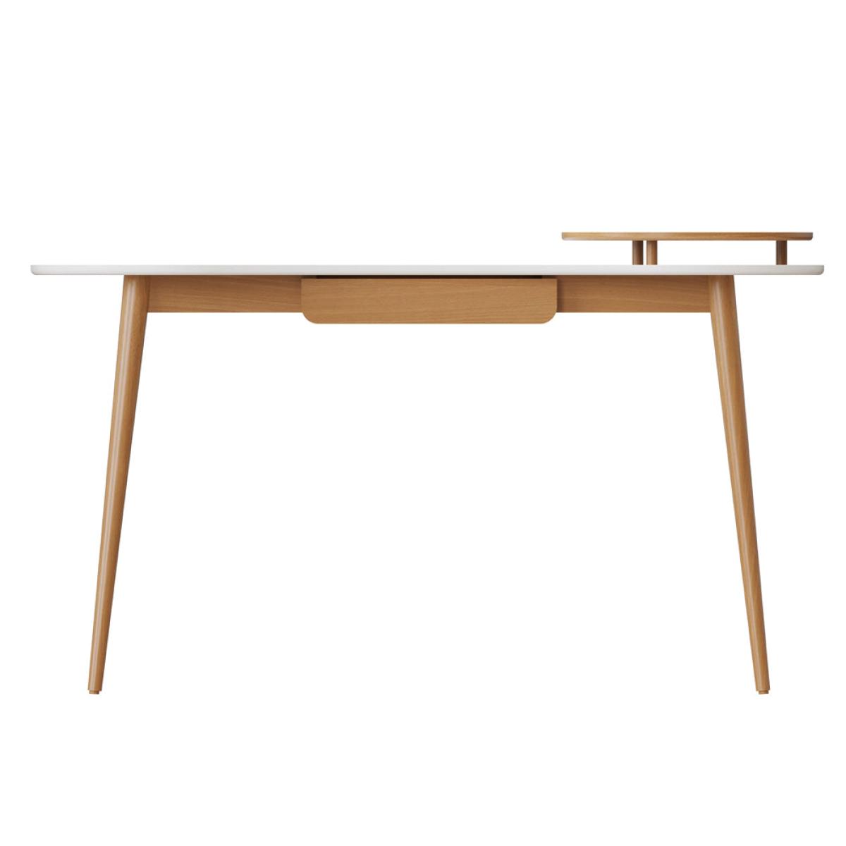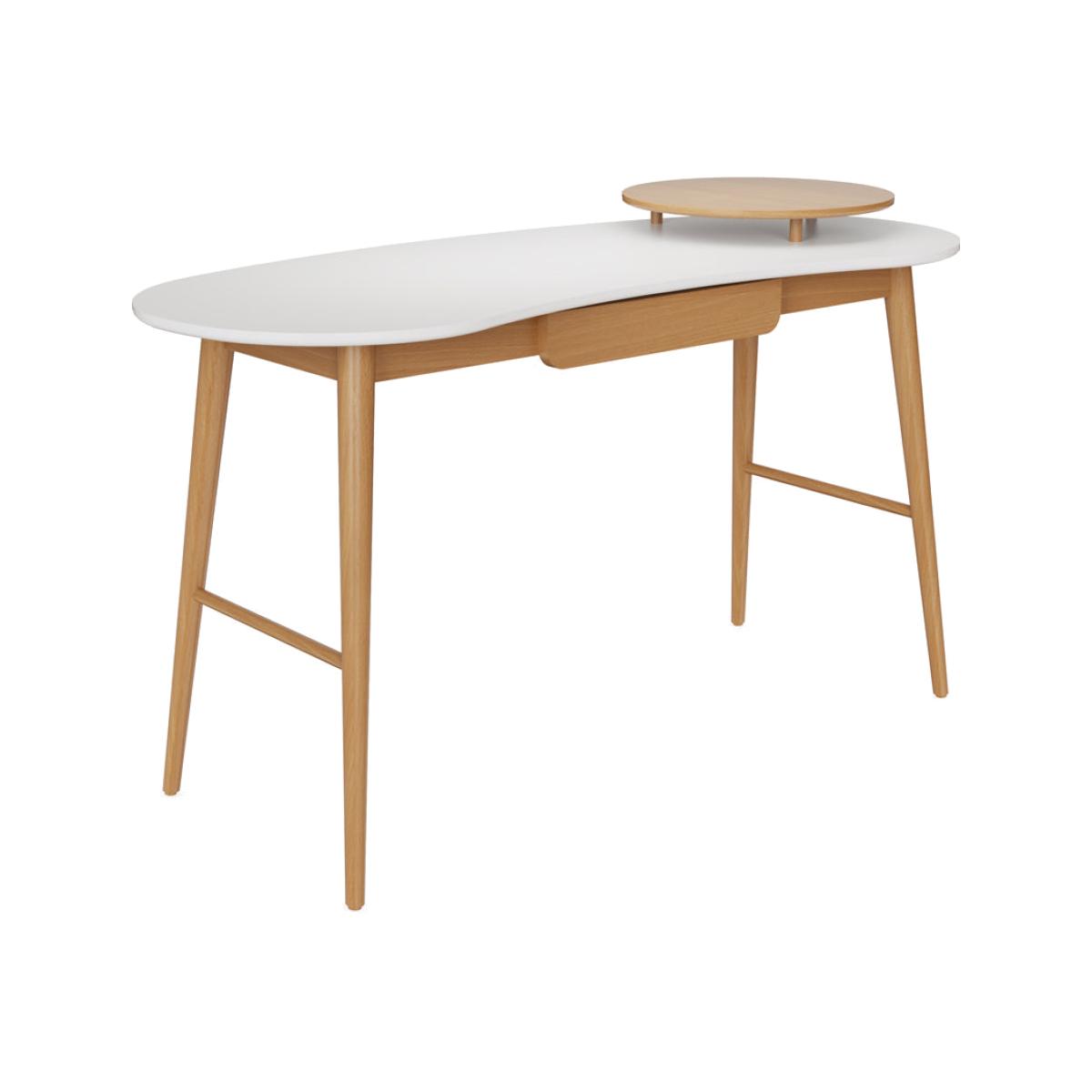 A beautifully simple desk, measuring 81. 7cm high, 140cm wide and 62cm deep. The oak and white complement one another perfectly, with oak legs and a raised platform with a white top, this piece will fit into a range of existing decors. Suitable for home working, studying or life admin, the desk also features a handy drawer to hold those things you need to keep close, but that you don't want to clutter up your workspace. The raised platform for your computer monitor will ensure you can keep it at a comfortable height and the shape of the desk does not compromise on space.