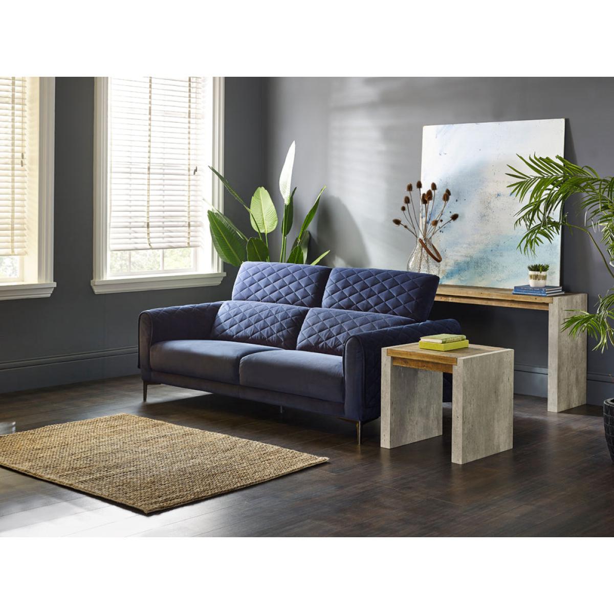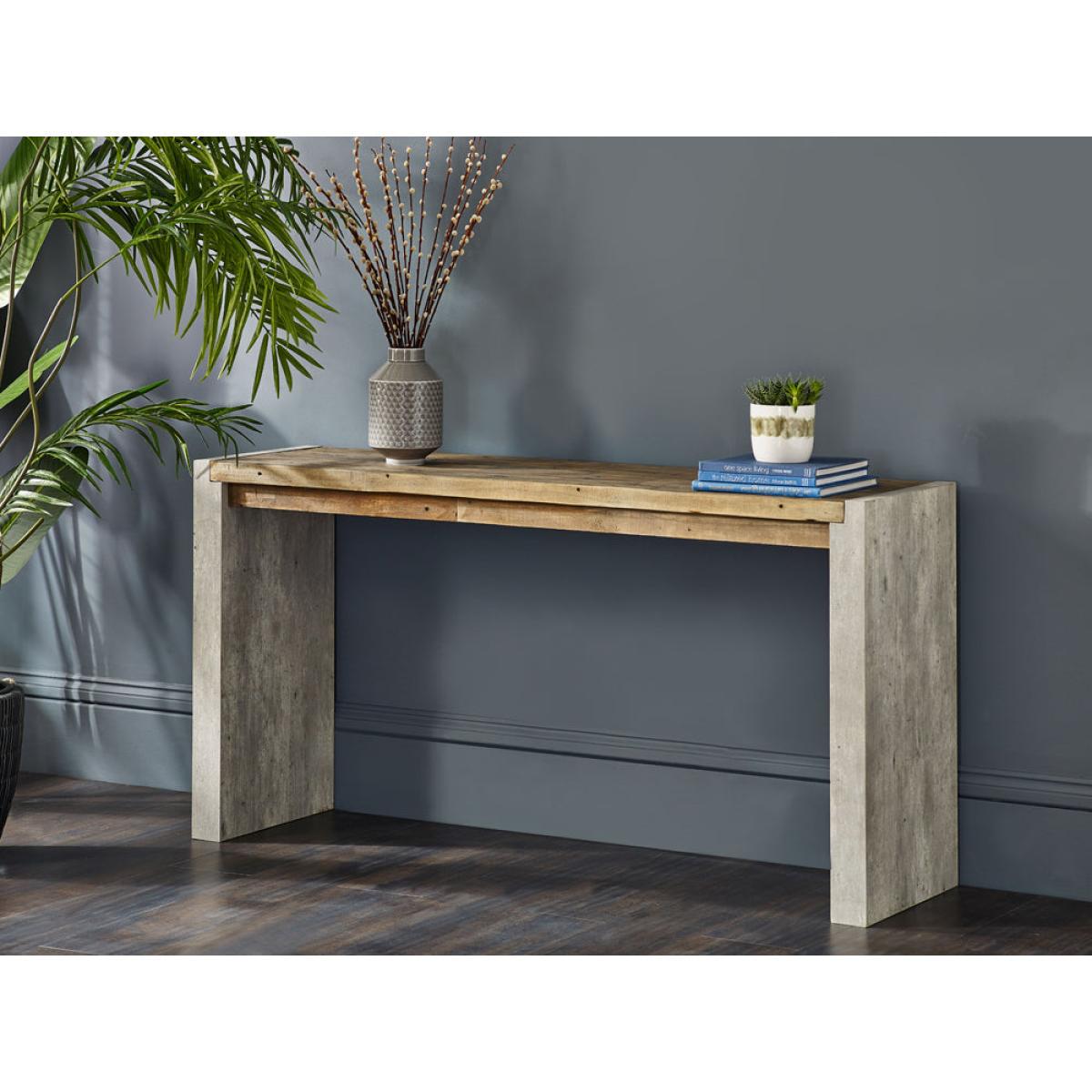The Teddy's Collection Charlotte console table in grey is a feat of minimalistic chic. Gloriously industrial in its appearance, the Charlotte console table is sure to catch the eye of all who visit your home. Smooth slabs of concrete support a solid wooden top sourced from reclaimed materials, making the Charlotte console table both stunning and friendly to the environment. Make a statement in your hallway by placing the Teddy's Collection Charlotte console table against a wall; alternatively, use the chic style to complement your décor elsewhere in your home. The dimensions are 76cm high, 150cm wide and 40. 5cm deep. Cm. Materials: Reclaimed Pine, MDF and Concrete effect melamine. Assembly required: Yes.