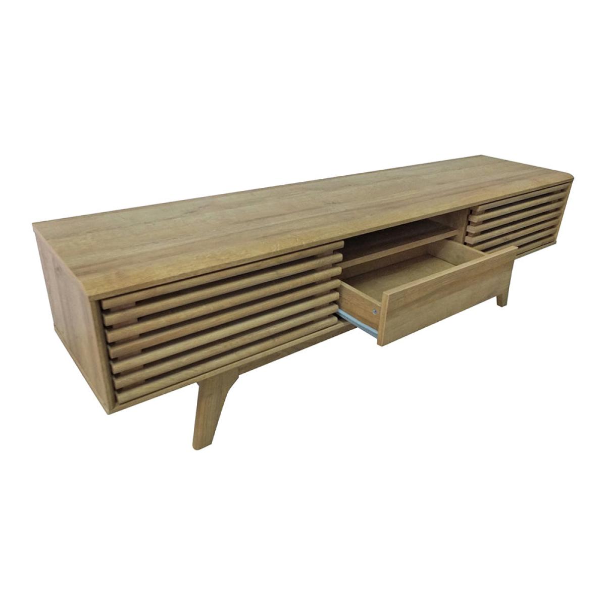 Make an impact with the stunning Copen 150 TV unit from the Teddy's collection. The design of this bold piece is an innovative fusion of Japanese and Scandinavian styles. It features sliding slatted doors which provide a storage solution that is both chic and practical. The storage space is ideal for tucking away items such as games consoles when they are not in use. This TV unit has been expertly crafted from Riviera oak with a beautiful walnut finish for a sense of timeless appeal. A well-sized piece, it measures at H: 43. 5 x W: 149 x D: 35 cm.