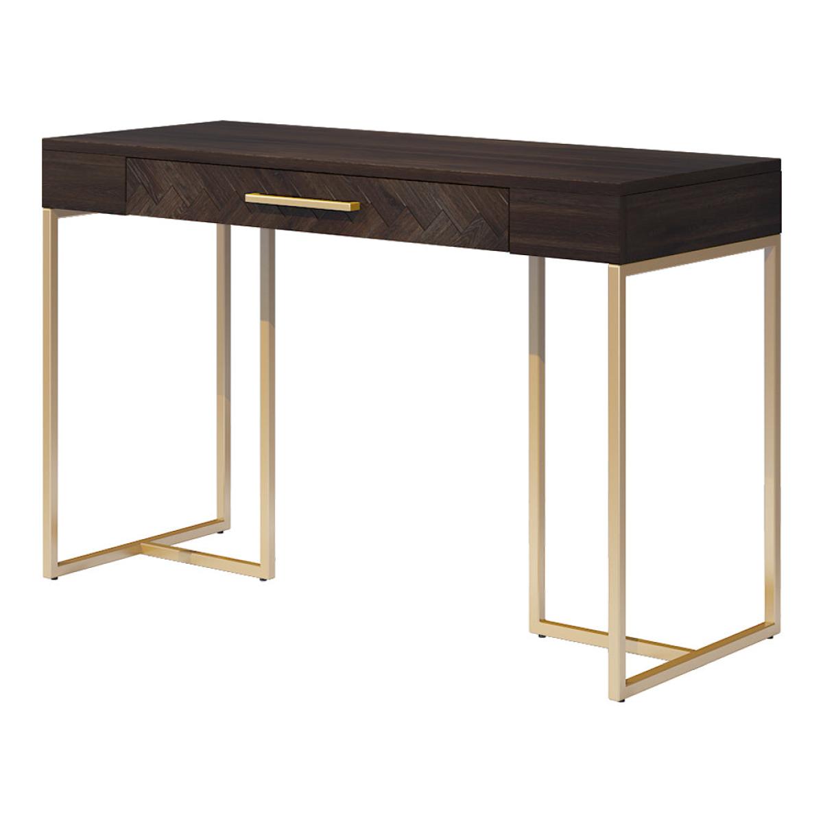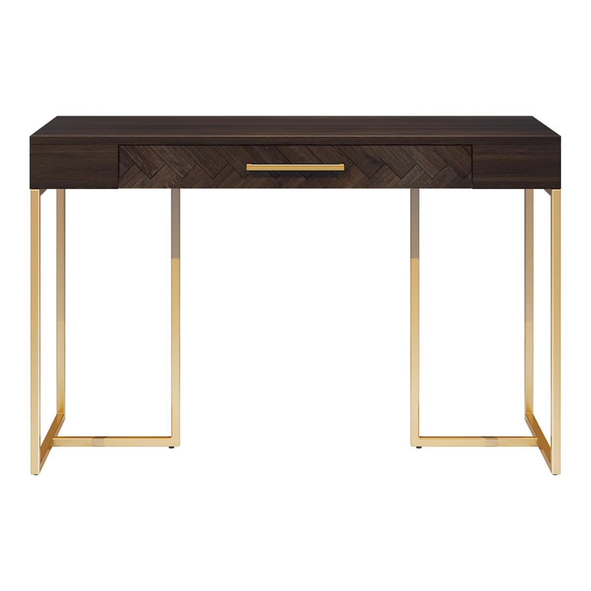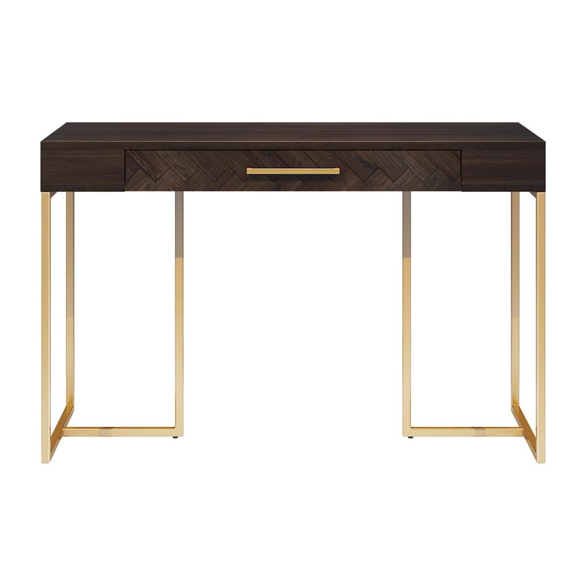 This sleek writing desk, has a stylish brass metal frame, along with some herringbone detail across the drawer front, making it a stand out piece for any home office.