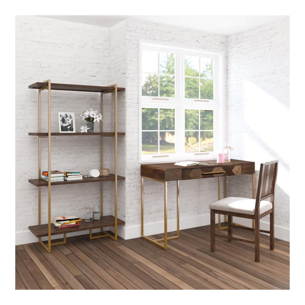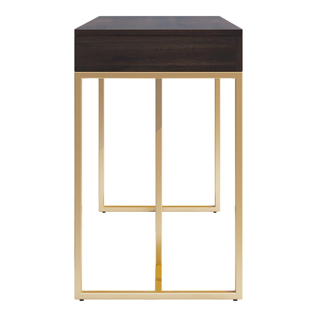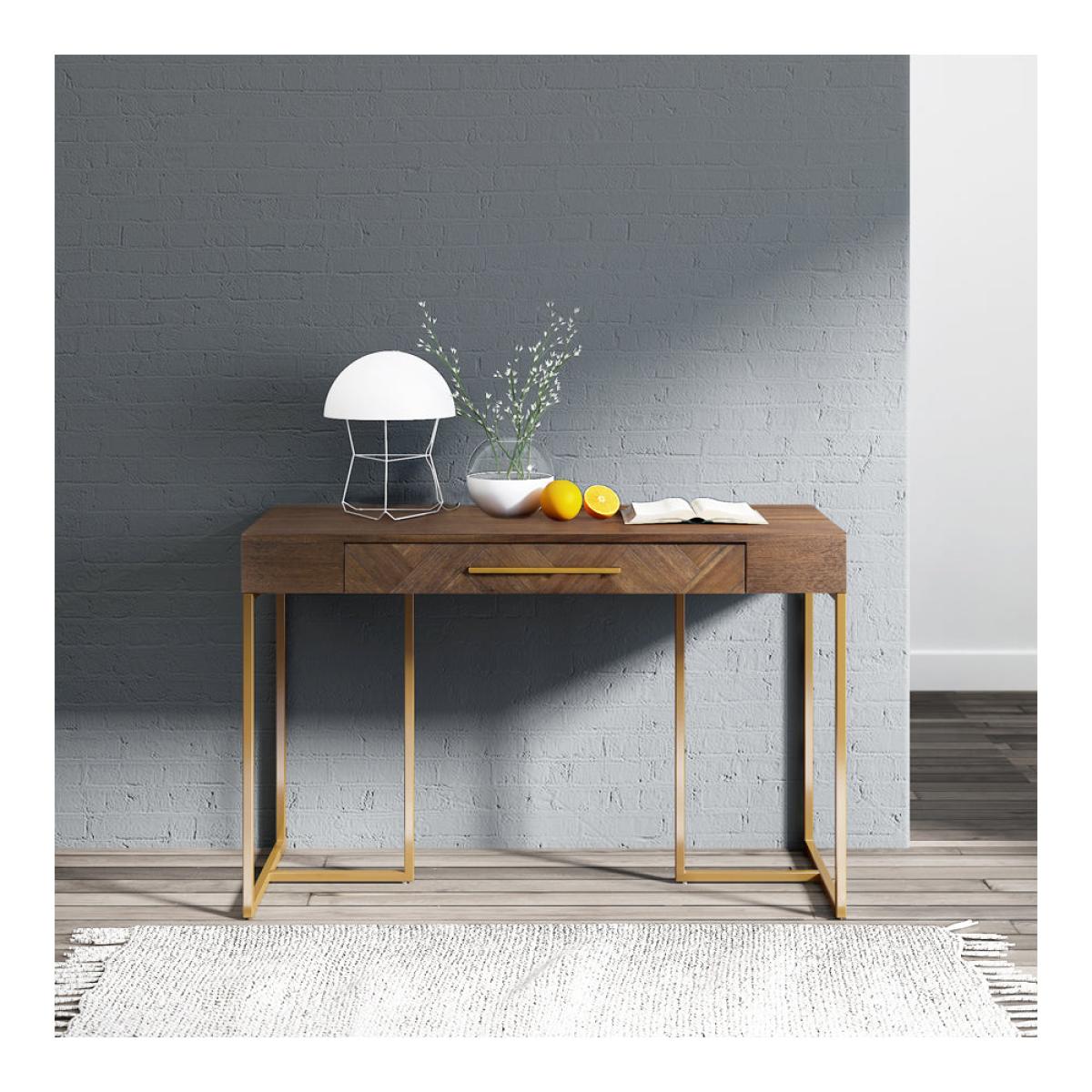 This sleek writing desk, has a stylish brass metal frame, along with some herringbone detail across the drawer front, making it a stand out piece for any home office.