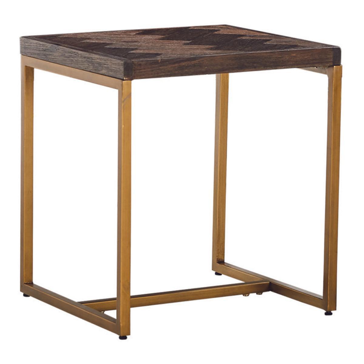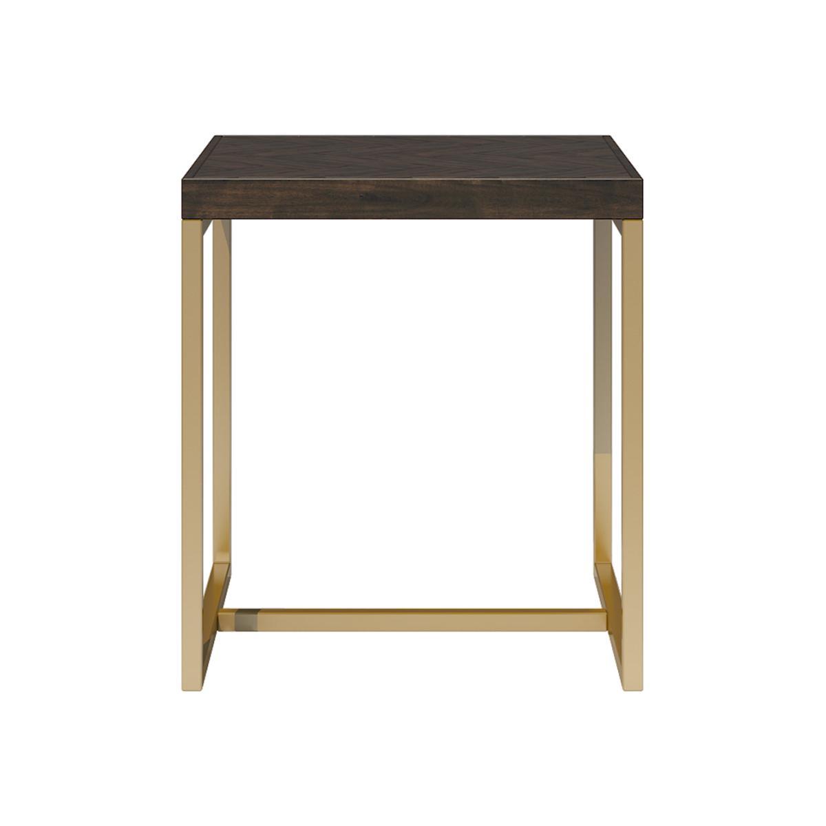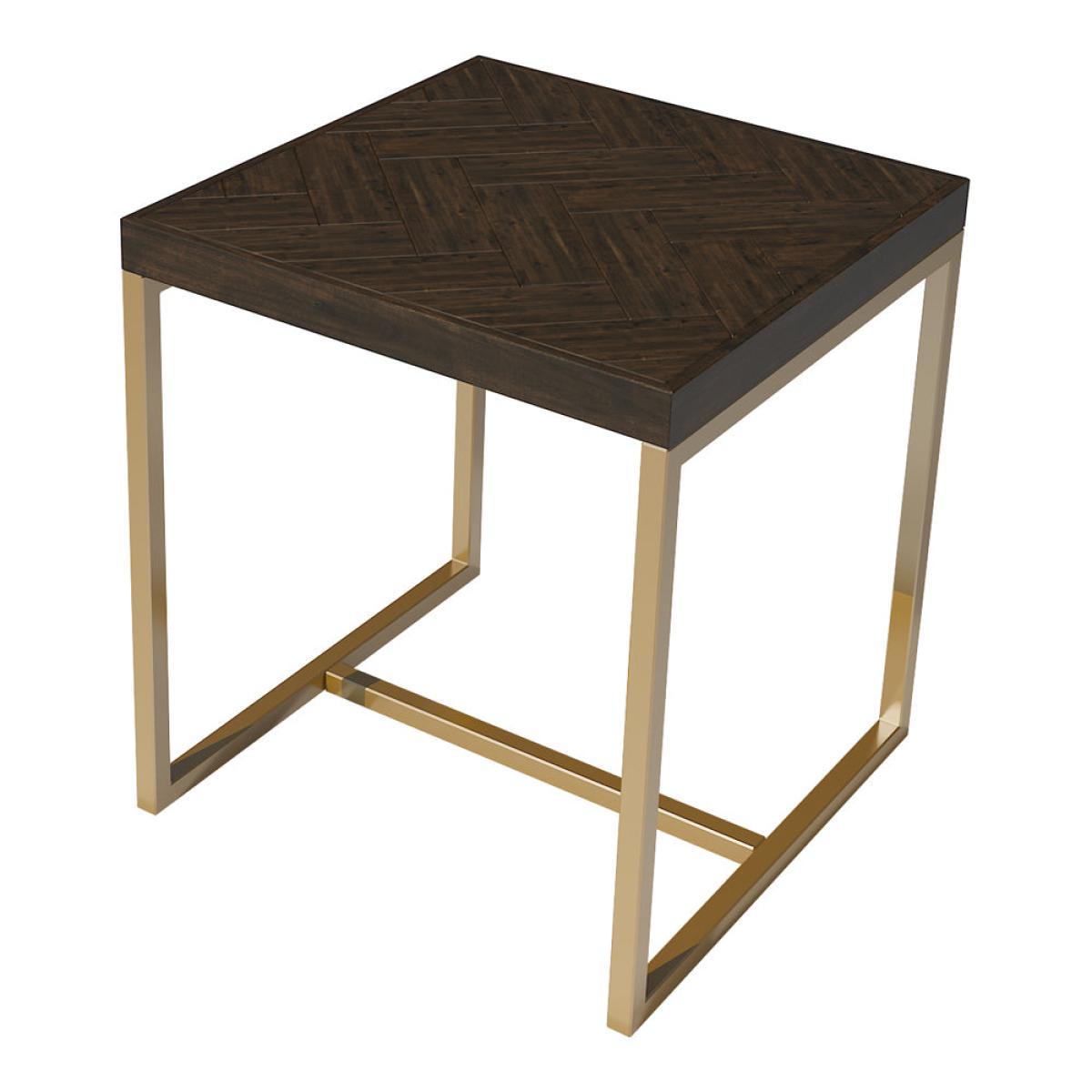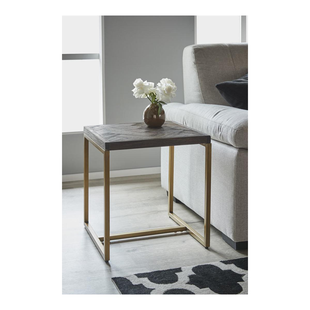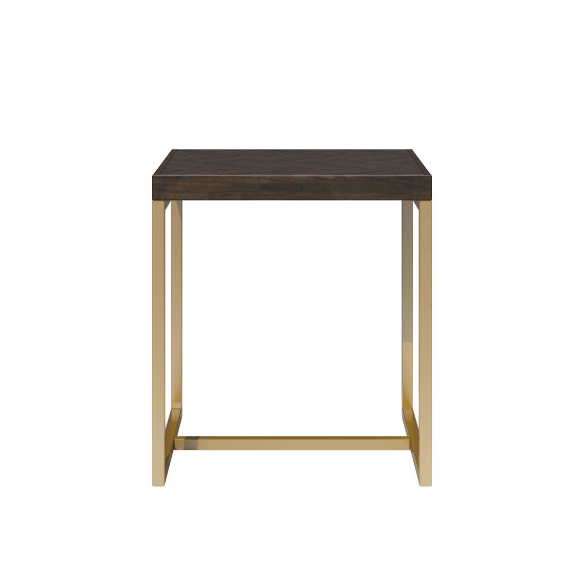 This stylish side table would work across all areas of your home. The herringbone detail on the tabletop and the angular brass metal legs make it a stand out piece.
