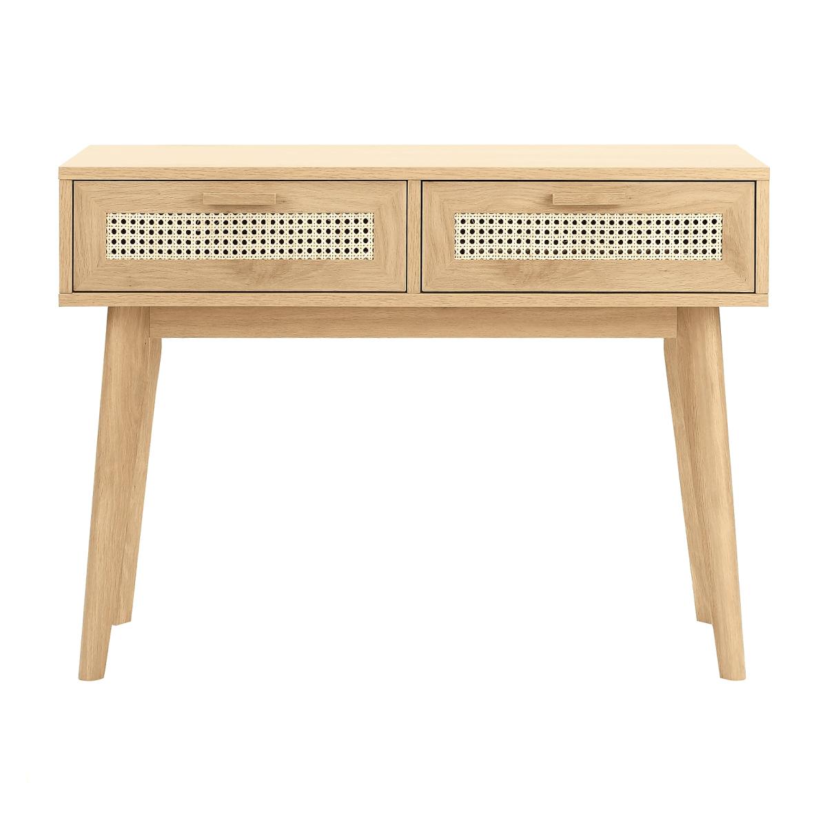 Channel mid-century chic with this vintage inspired Java console table. Drawing on retro design and inspired by nature, the table is produced from solid wood with inlaid rattan material detail. It features a concealed drawer and space for storage, making it a practical and stylish item for spaces such as bedrooms, hallways, and offices. The sleek, classic design includes rounded, splayed legs for maximum practicality while the clean lines and warm, natural wood allow it to fit in seamlessly with lighter shades and natural materials in your home decor. Highlighting understated sophistication and durable construction, this is a functional and stylish addition to any home. Cm. Materials: Melamine, Solid Wood and Rattan. Assembly Required: Yes.