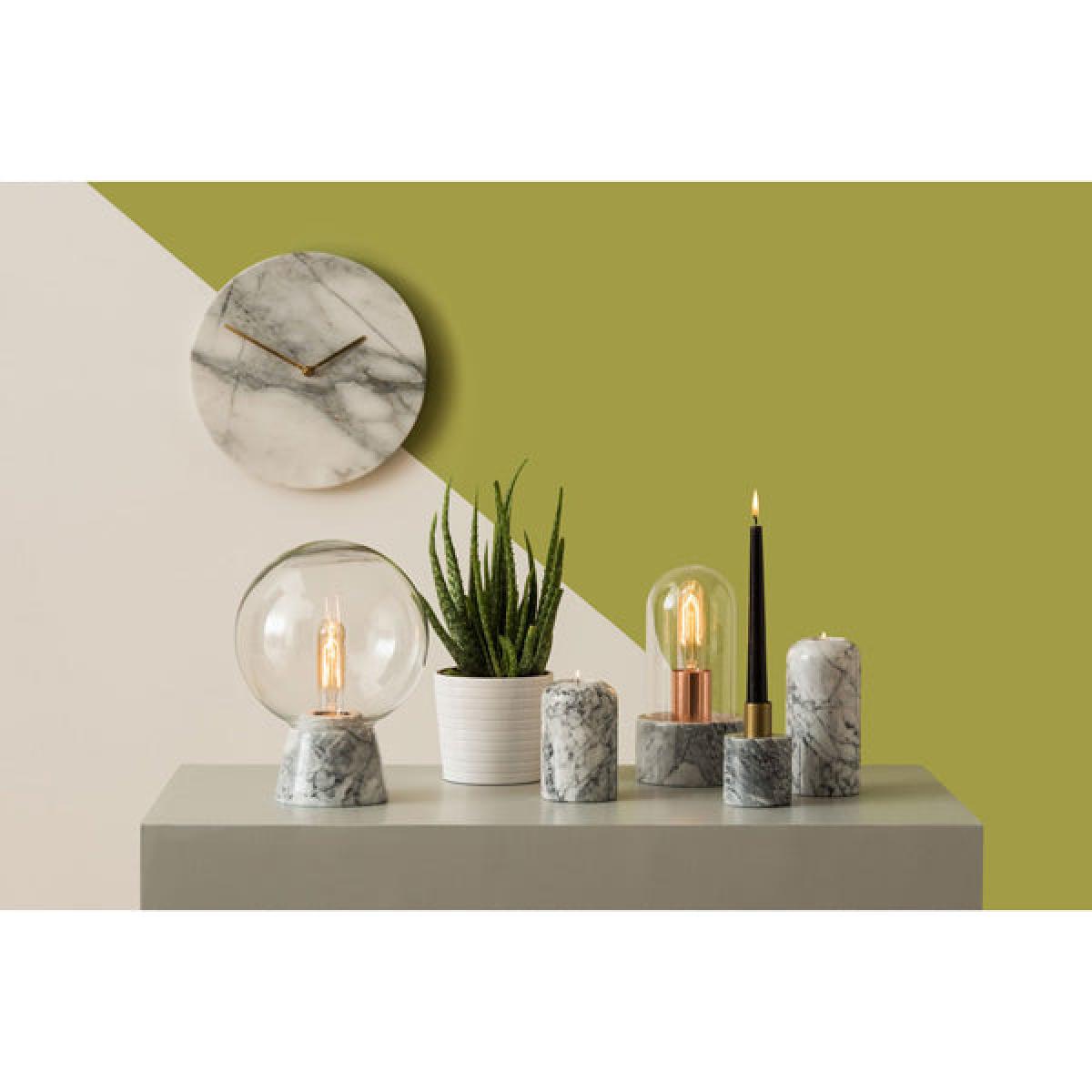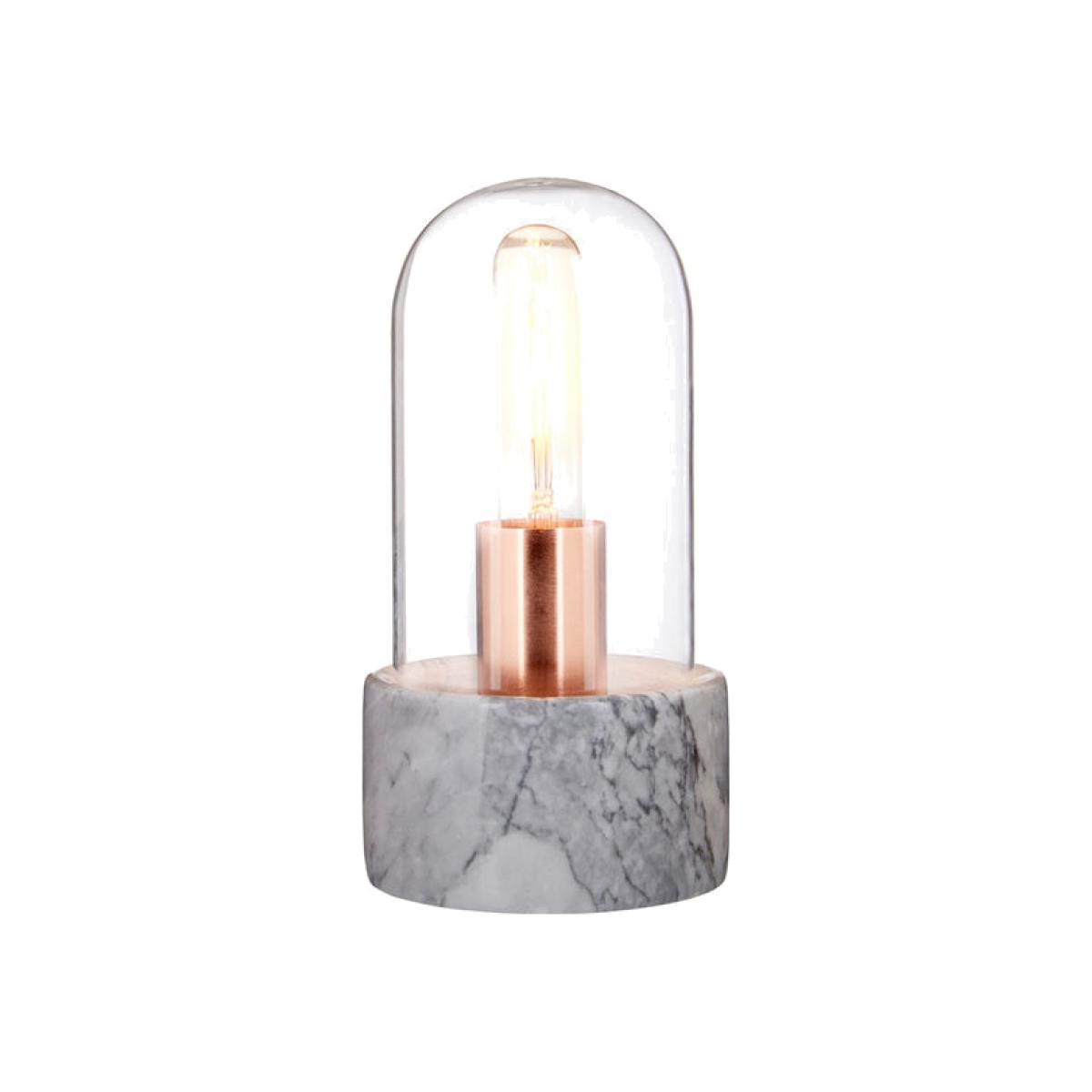 The bulb of the Luka lamp is covered by a bell-shaped cloche made from clear glass.