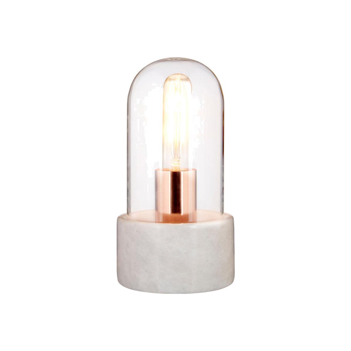 The bulb of the Luka lamp is covered by a bell-shaped cloche made from clear glass.