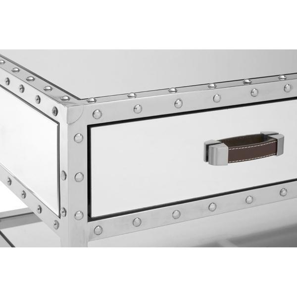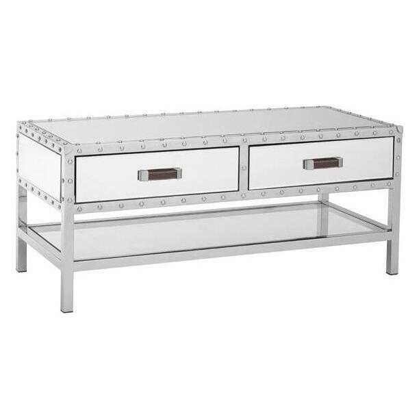 The beautiful, smooth mirrored finish of the coffee table, with two drawers and open glass shelf, is further accentuated by rivet detailing on the frame for a functional and fashionable piece in your bedroom.