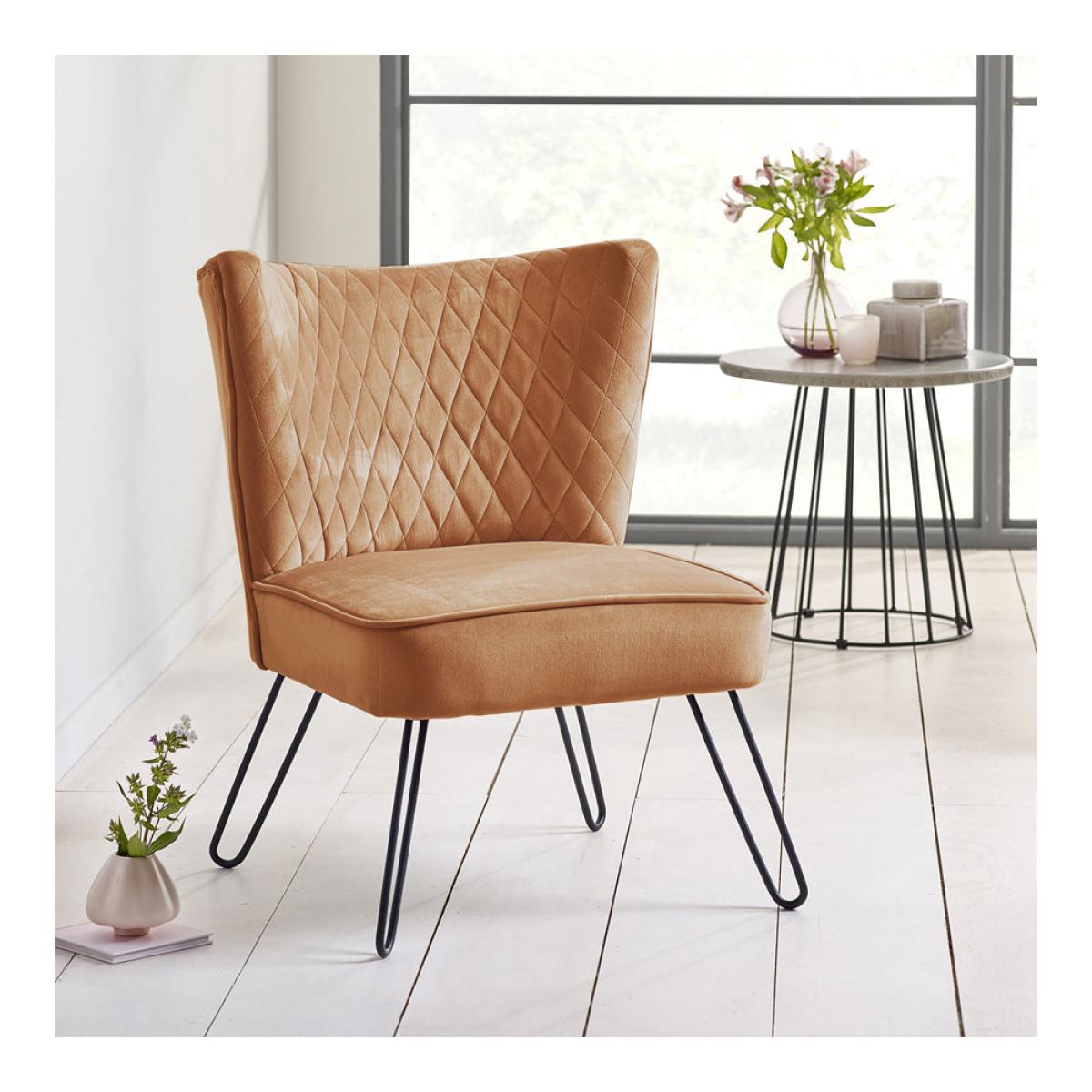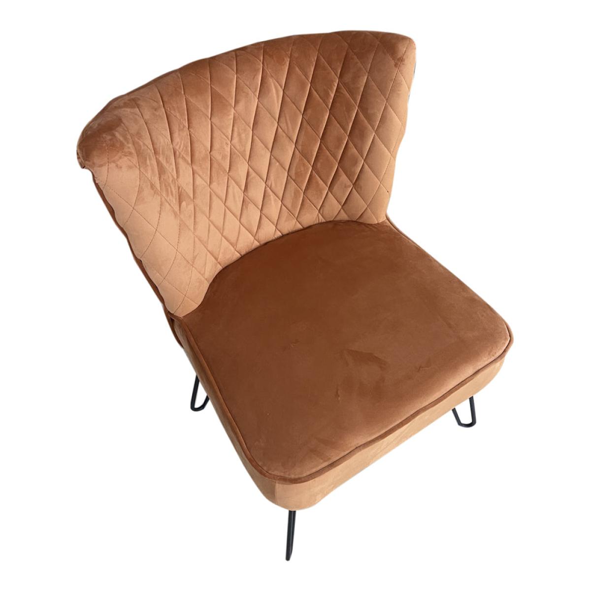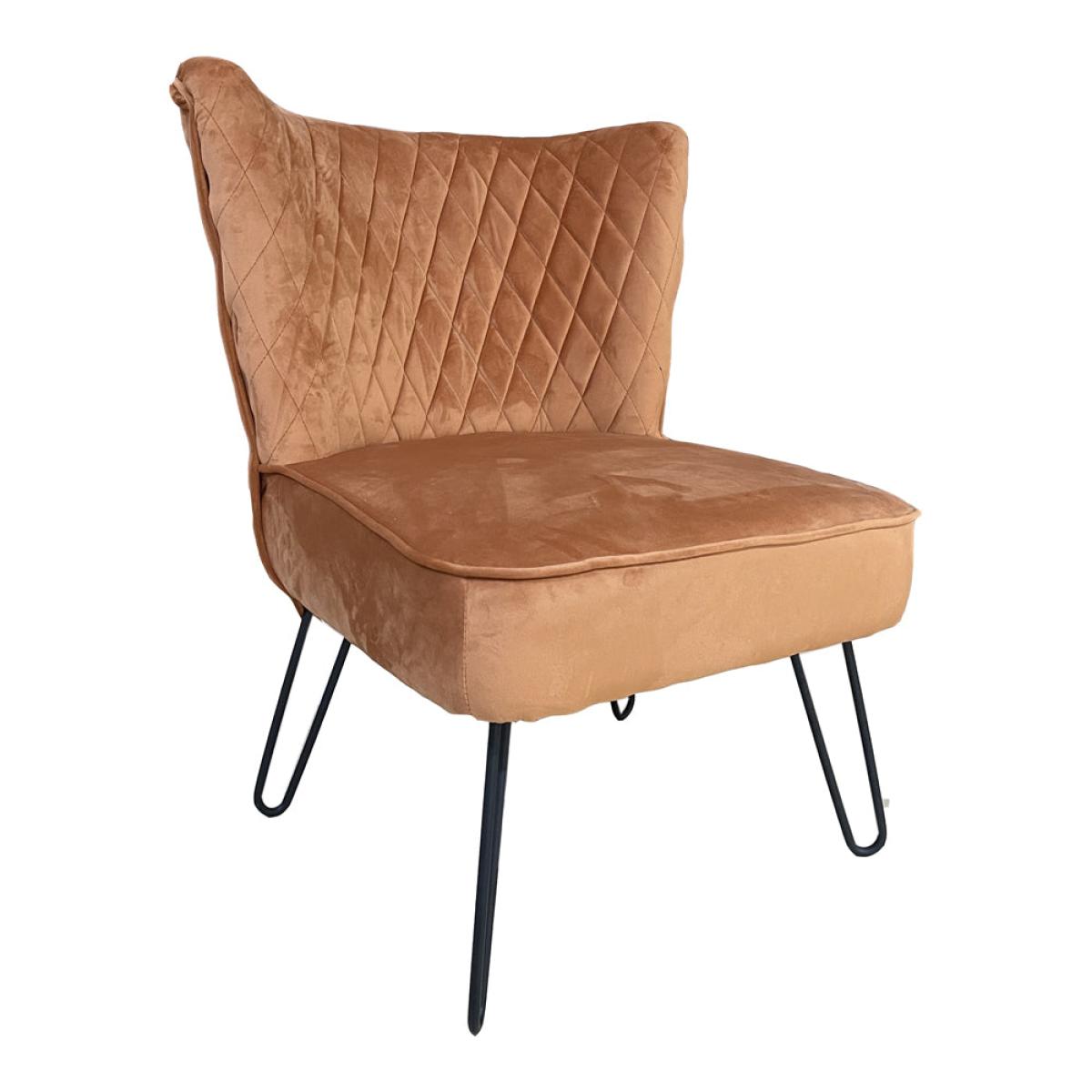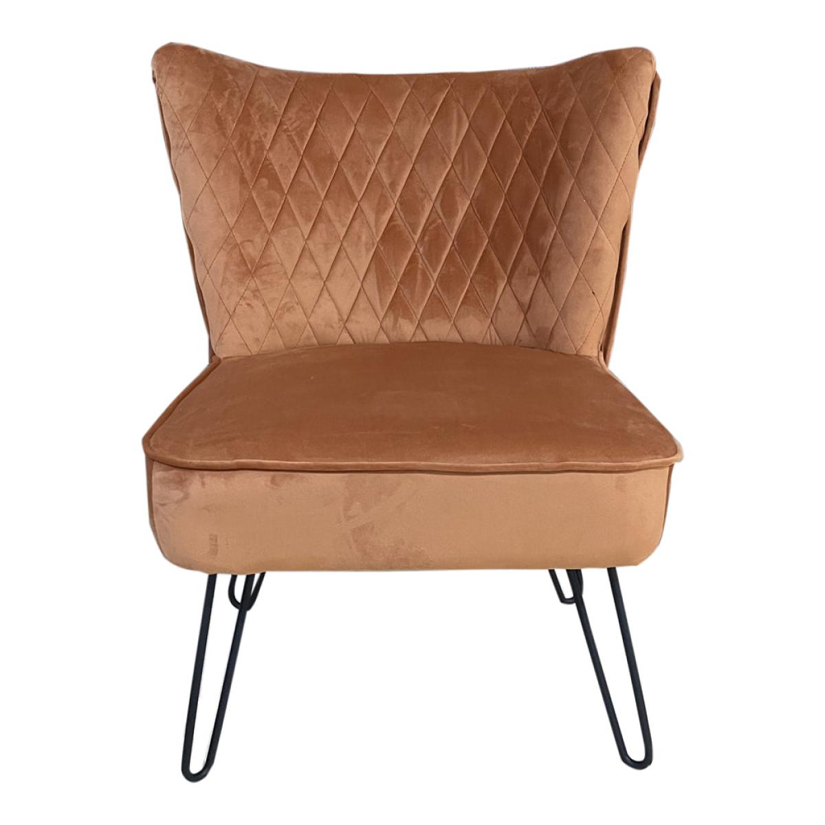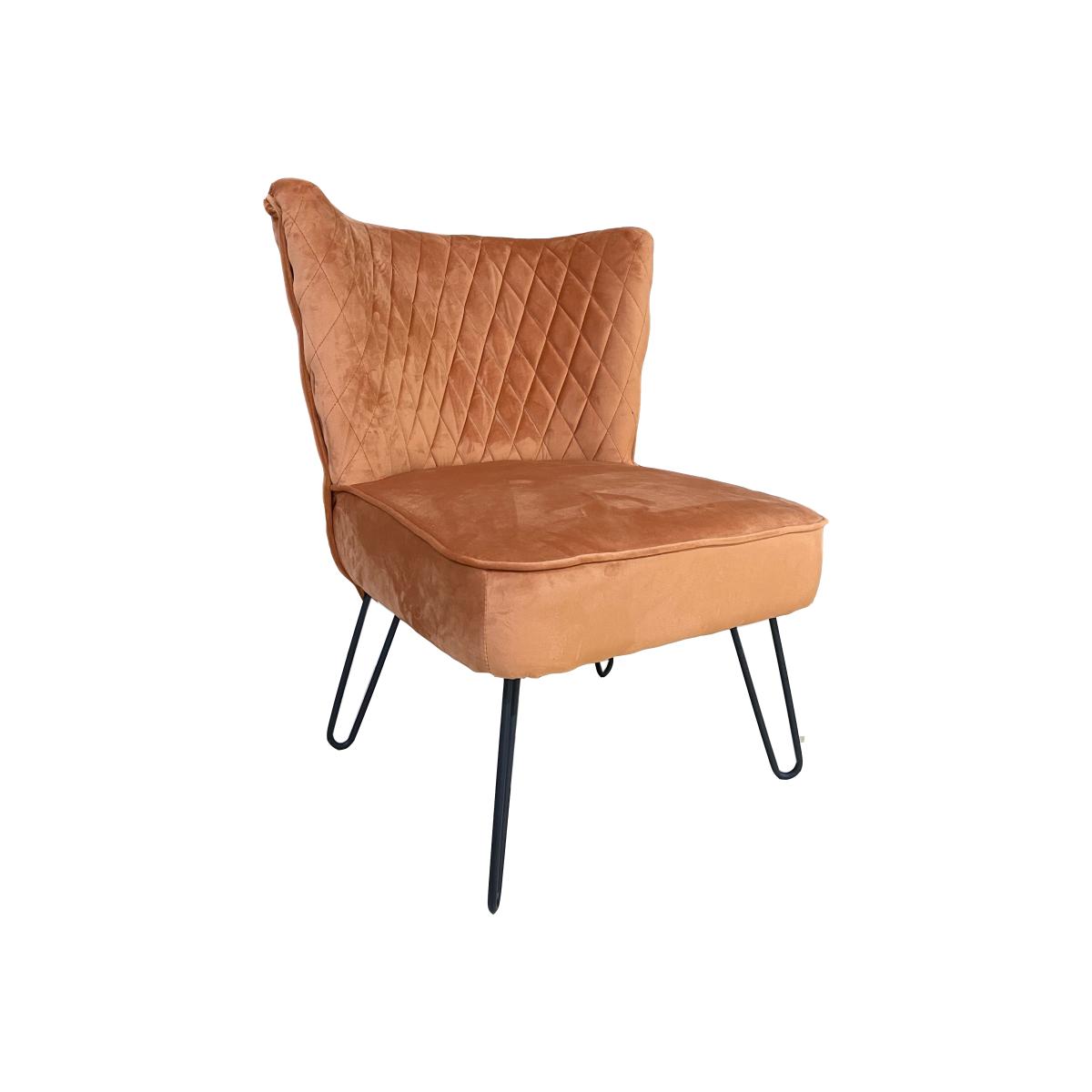 Combining practicality and a bold expression of contemporary design, the Teddy's Collection Tarnby chair in burnt orange is both superb comfort and the essence of great style. This distinctive chair is upholstered in gorgeous burnt orange velvet, with a quilted pattern on the back, a plain but generously padded seat and beautifully finished piped seams. The chair's back is sensuously curved, adding a stunning element to its unusual silhouette. The splayed metal legs, with their fashionable black finish, add a touch of looped minimalism that contributes a sturdy and robust base to an impeccable chair which will delight you for many years to come.