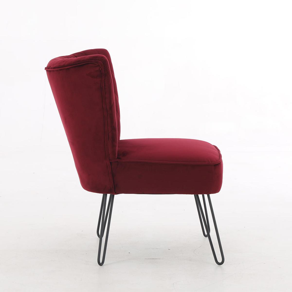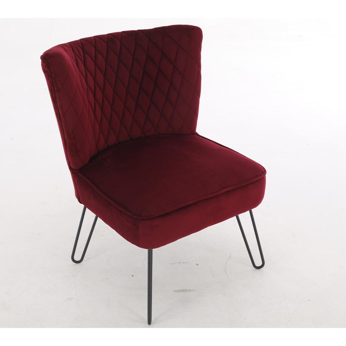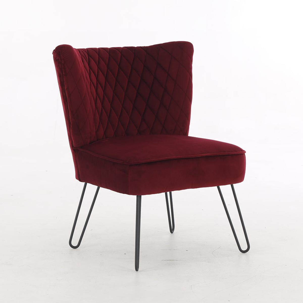 Plush velvet and clean, sleek lines make this showstopping chair a real accent piece for your home. Use it in the lounge or bedroom to add a touch of sophistication and glamour, as well as a splash of colour. The Teddy's Collection Tarnby Chair comes in a gorgeous, deep ruby red to bring warmth and depth. It has a contemporary armless design with a diamond tufted backrest. Four thin, angled, black metal hairpin legs complete the look. Use it as an accent chair or to create a dreamy little reading nook. This chair is 81cm tall, 64cm wide and 64cm deep. Materials: Metal with foam filled velvet upholstery. Assembly Required: Yes.