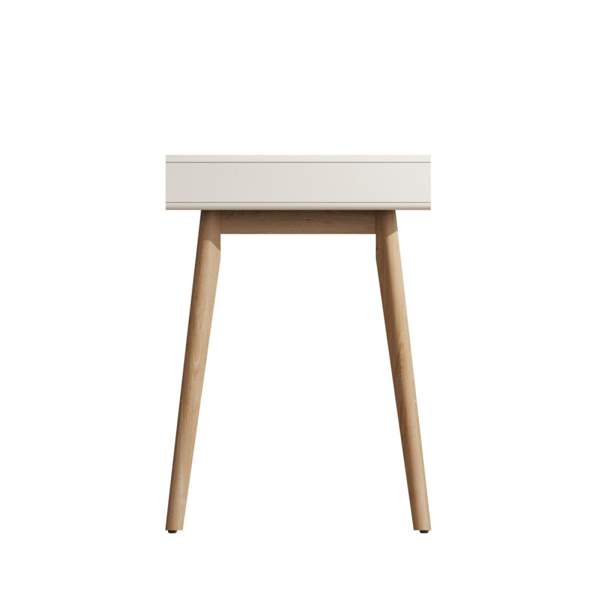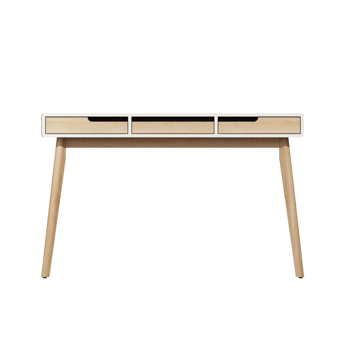 I love this desk for its clean, modern look and versatile style. The combination of white and oak makes it a great fit for contemporary or Scandinavian-inspired interiors, but it can also add a fresh touch to more traditional spaces. The slim drawers provide practical storage without cluttering the overall aesthetic, making it ideal for home offices or bedrooms. To style it effectively, consider pairing it with minimalist accessories or a sleek desk lamp, and keep the surrounding decor simple to let the natural wood tones and understated design stand out. This piece works well in neutral palettes but can also be warmed up with textured accessories or plants for a more inviting feel.