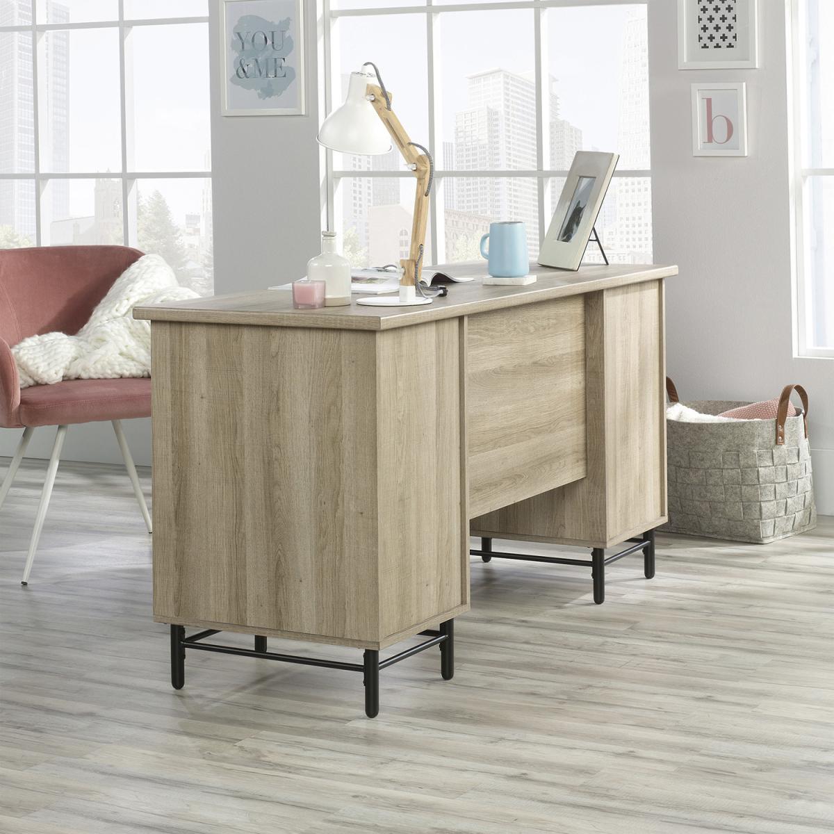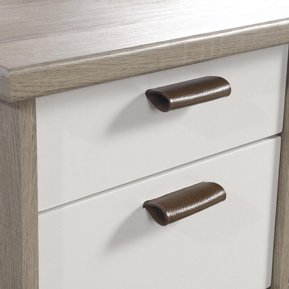The Teknik Avon Leather Handled Desk is a charming and delightfully contrasting coloured option for all styles of office and colour schemes. This fresh and modern styled desk benefits from a large desktop working surface in Sky Oak effect finish which provides more than ample space for writing and computer work. It also includes two file drawers with full extension slides for holding letter-size hanging files as well as four storage drawers featuring metal runners with safety stops in a beautiful contrasting white accent. The drawer fronts also feature an ununusal yet stunning addition of drawer pulls in durable brown leather for an extra touch of class. The desk top has grommet holes for electrical cord access to ensure you can wire up your necessary hardware in a neat and orderly fashion. Beautifully finished with a powder coated metal base, this desk will blend effortlessly within your working area. This desk also benefits from a 360 degree finish, with the option to be freestanding.