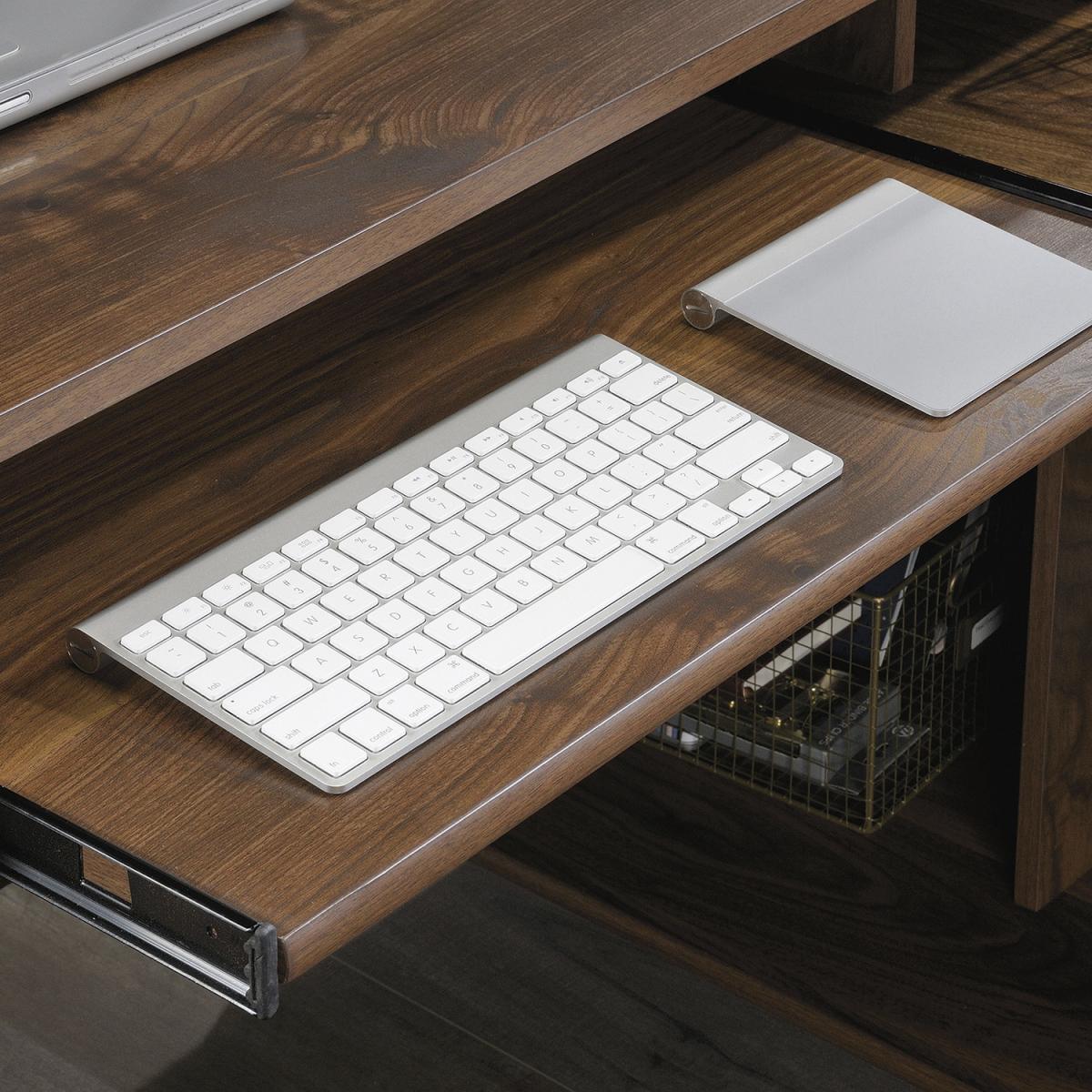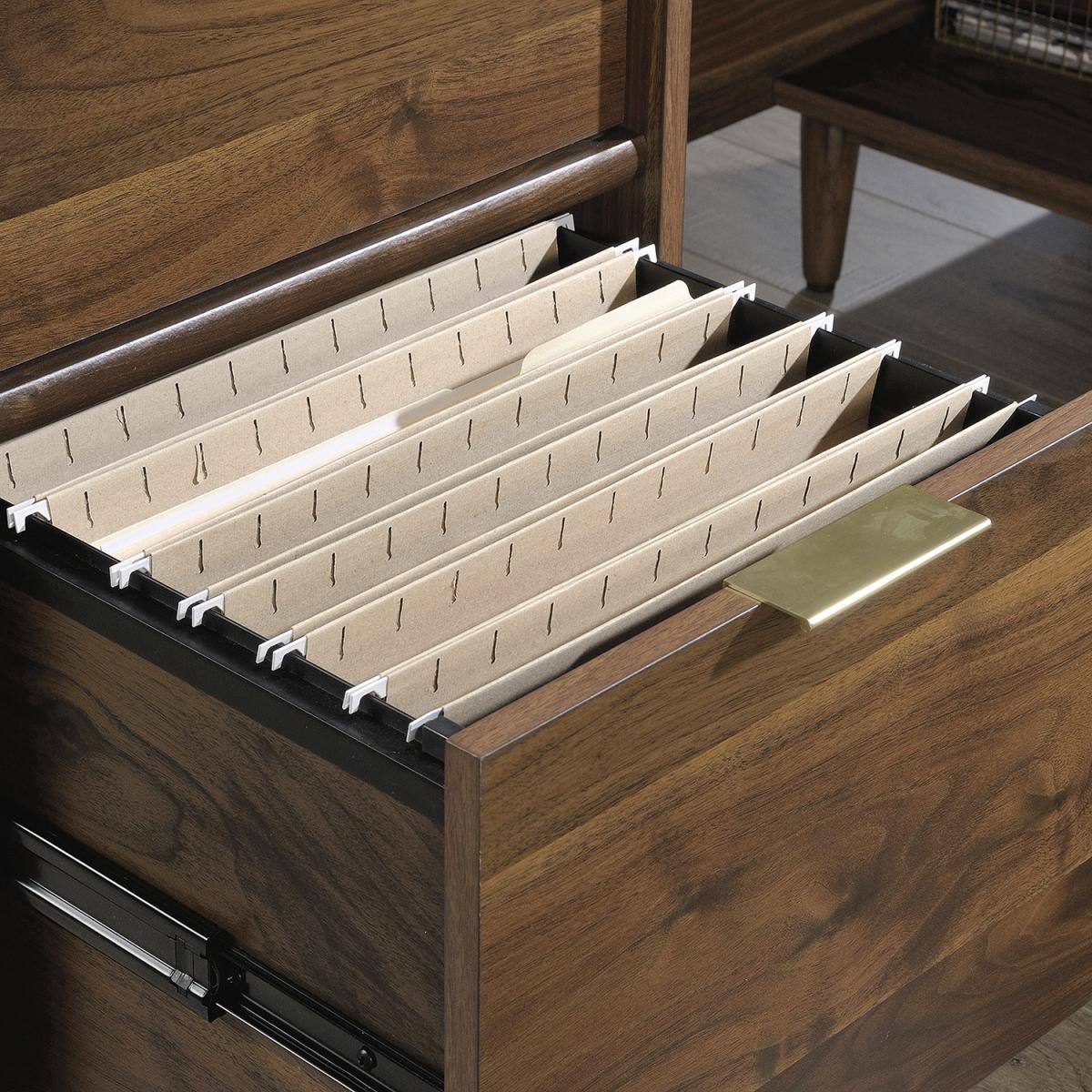The Teknik Clifton Place L-Shaped Executive Desk is the charming and delightfully neutral coloured option for those that need the full office solution for their home office without taking up all the room! This mid century styles piece offers a slide out keyboard/mouse shelf that opens and closes on smooth metal runners, three easy gliding storage drawers and two file drawers with full extension slides that accommodate letter-size hanging files. It also features cubbyhole storage so you can access all of your books and folders. Space is no issue with this desk! The large desktop and return provides a generous working area for all types of work as well as there being access to cable ports and pass through openings for discreet cable management. The return can also be fastened on to the left or right side to fit the needs of any room in your home, which is ideal for all styles and colour schemes. Beautifully finished in a Grand Walnut effect with solid wooden feet, this storage sideboard will blend effortlessly within your home. This also benefits from a 360 degree finish, with the option to be freestanding. Also ideal to match in this range are the Executive Desk, Storage Sideboard, Credenza and Lateral Filer, all finished in the same quintessential style