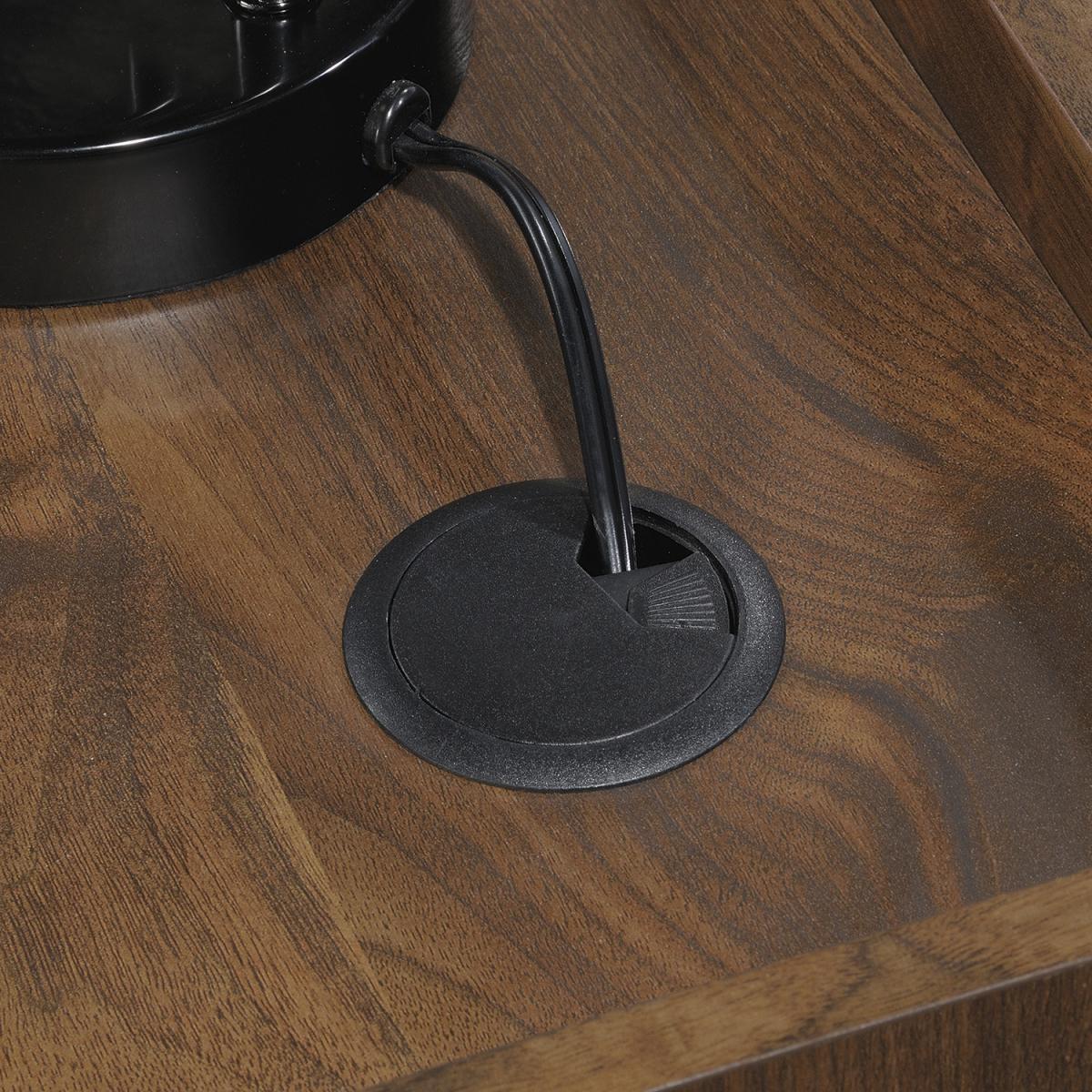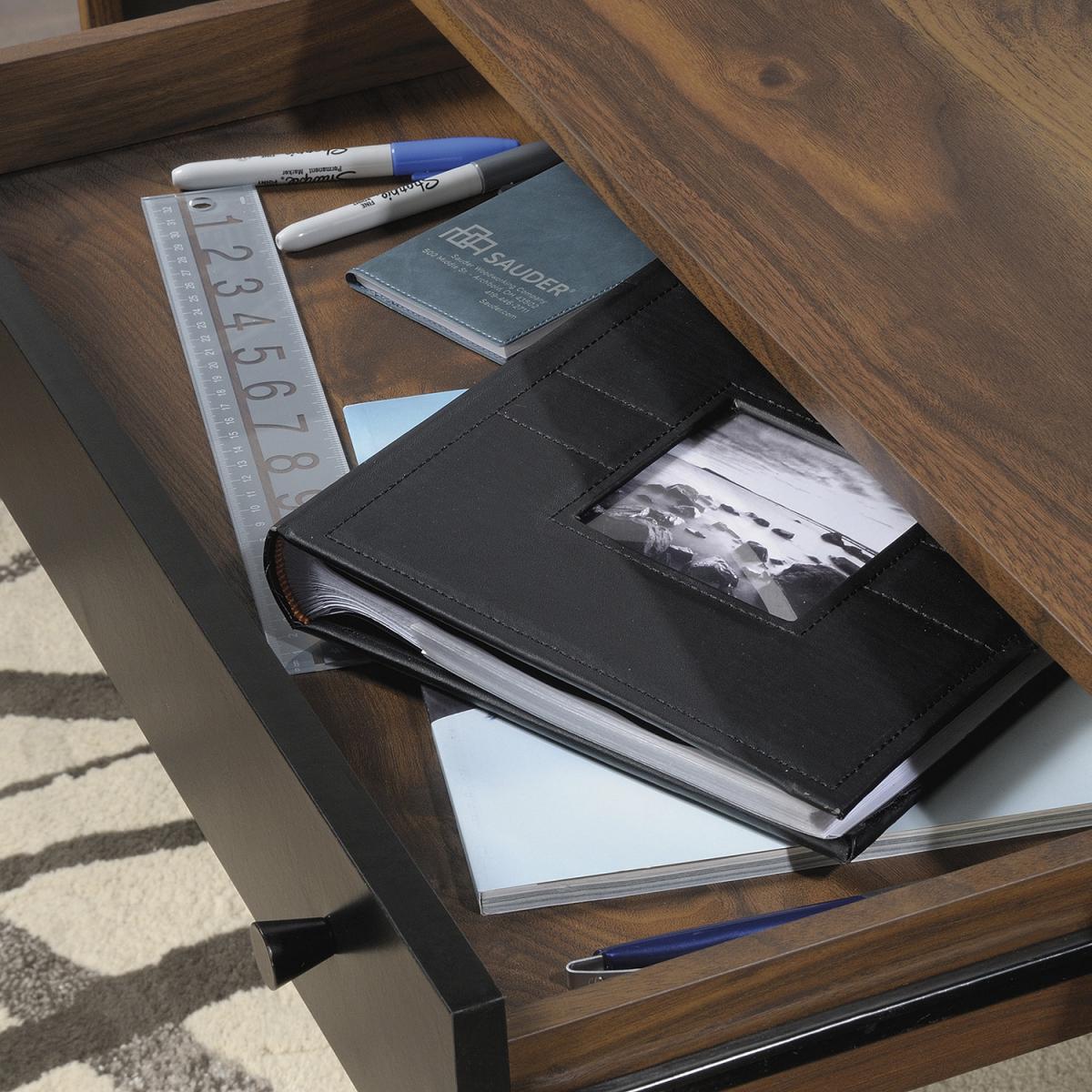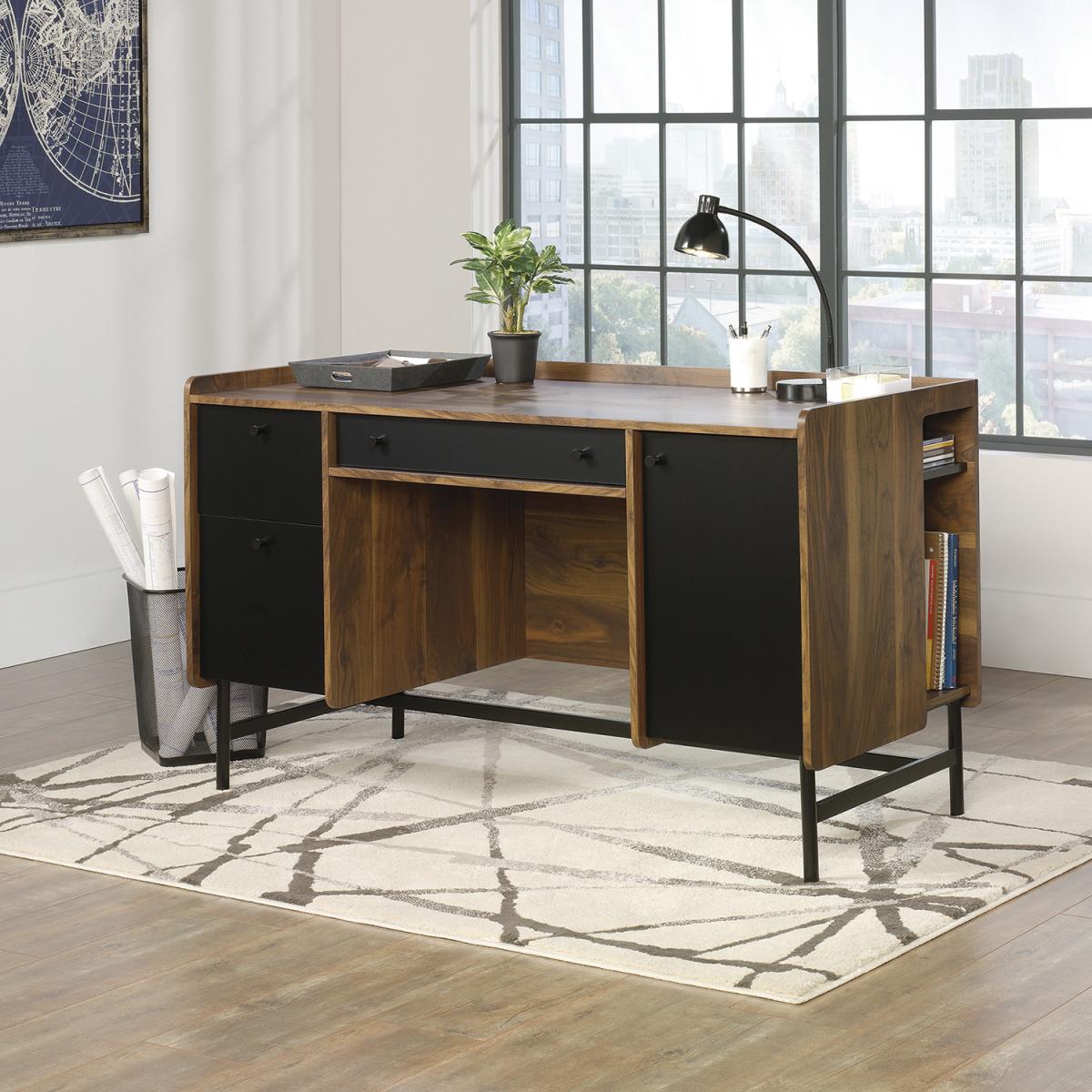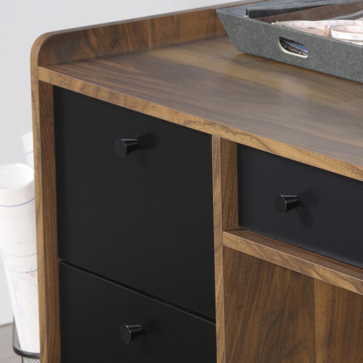 The Teknik Hampstead Park Desk is our stylish and minimalist design option for any home office or study. Its spacious work surface offers a perfect storage solution for all your office essentials and work items. This larger yet snappy looking desk features an easy gliding pencil drawer and two file drawers with full extension slides to accomodate letter-size hanging files, a fixed side shelf and last but not least, an adjustable storage shelf discreetly hidden behind a door. Beautifully finished in a Grand Walnut effect with black accents and powder coated metal base, this modern desk is just what your office has been missing! It also has the added benefit of being finished throughout so you can place the desk freestanding in any location and at any angle. Also ideal to match in this range are the Narrow Bookcase, Compact Desk, and Storage Stand, all finished in the same quintessential style.