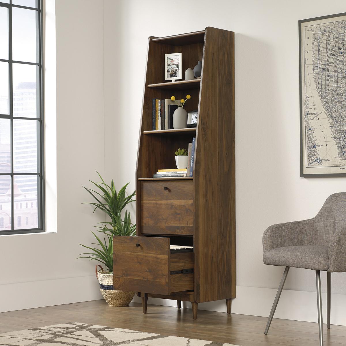 The Teknik Hampstead Park Narrow Bookcase is our stylish and spacious design option for any home office or study. Beautifully finished in a Grand Walnut effect with solid wooden feet, this mid century styled bookcase provides a roomy and neutrally coloured storage solution for all your accessories, files, books and folders, an ideal match for all colour schemes. This classic yet remarkably modern looking bookcase also features an enclosed back with cord access, two fixed display shelves and two file drawers with full extension slides to hold letter, legal, or European size hanging files – perfect for all your organisational needs. It also has the added benefit of being slimline and finished throughout so you can place the bookcase freestanding in any compact location and at any angle. Also ideal to match in this range are the Wide Bookcase, Compact Desk, Park Desk and Storage Stand, all finished in the same quint essential style.