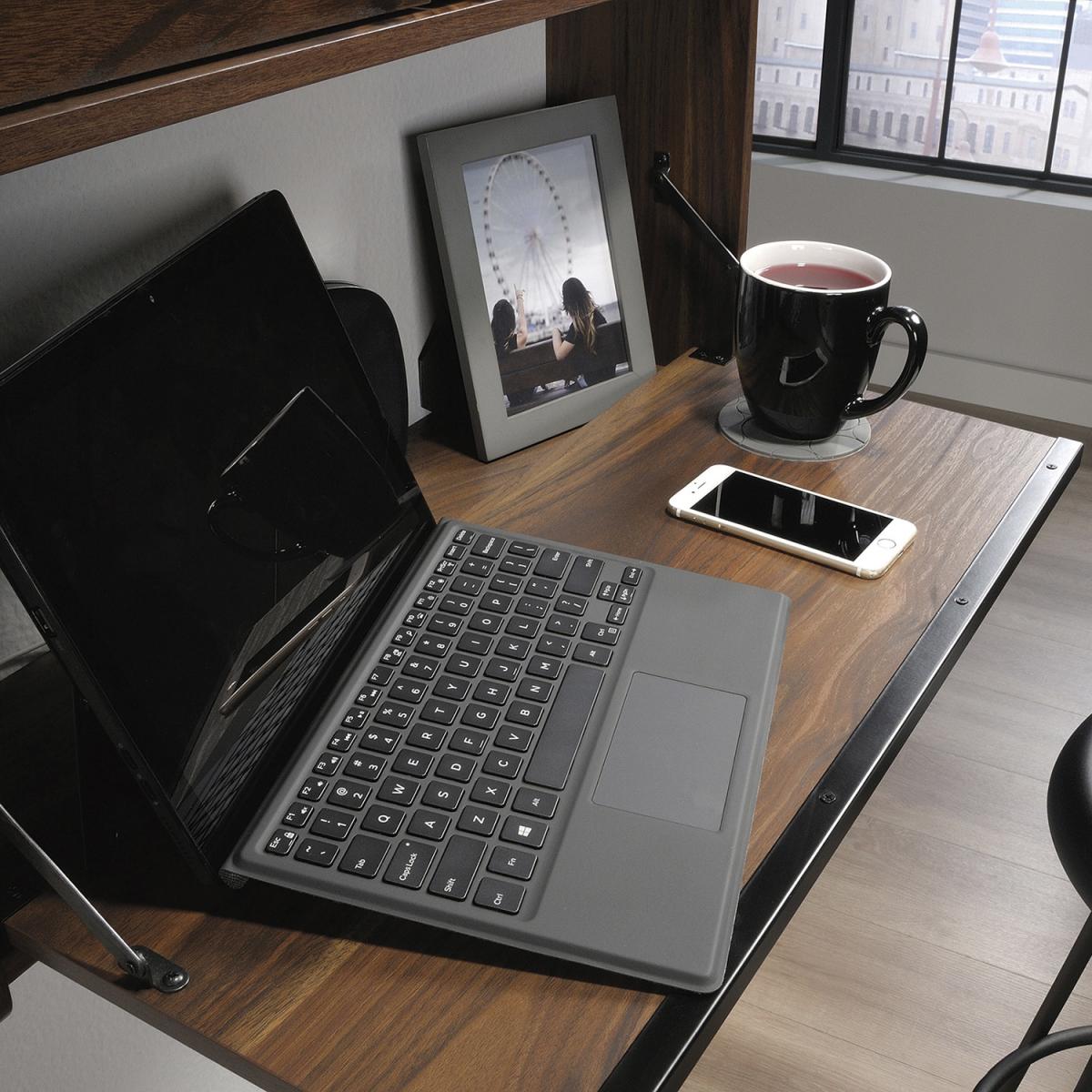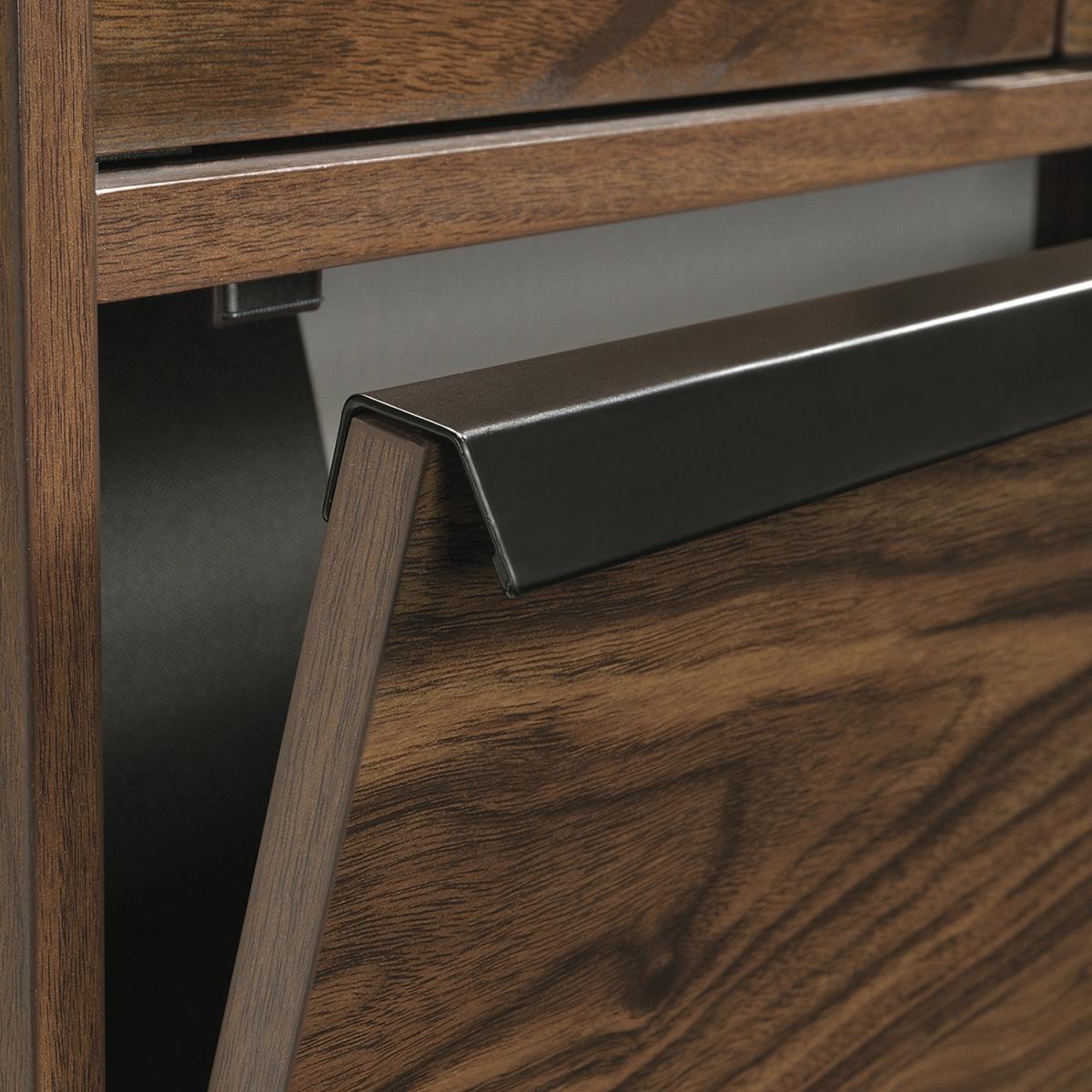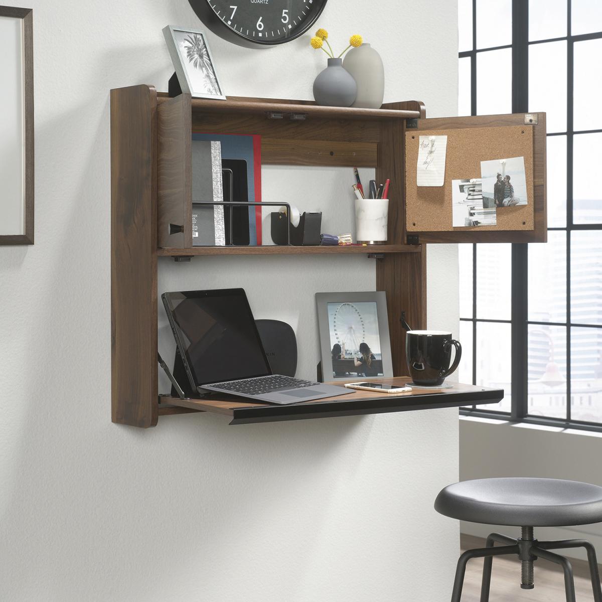The Teknik Hampstead Park Wall Desk is our stylish and minimalist design option, perfect for all colour schemes and decor. Beautifully finished in a Grand Walnut effect with black accents handles, this sleek and modern styled space saving wall desk provides a convenient solution for those with limited space, simple and versatile to hang anywhere within your home or office area. Seperated with two distinct compartments, the lower half has a door which flips down to create a spacious work area for your laptop, work accessories and even your favourite cup of tea! The top half has two upper doors which open out to offer you even more storage for your office envelopes and folders tacked on the inside of the doors is a bulletin style board for pinning your reminders and paperwork for when you need them. On top of these is an upper shelf to complete the look, great for displaying all manner of home decor. This wall desk also includes cord management pass-throughs so you can keep all your wires neat and stowed away. Also ideal to match in this range are the Narrow Bookcase, Wide Bookcase, Compact Desk and Park Desk, all finished in the same quintessential and modern style.