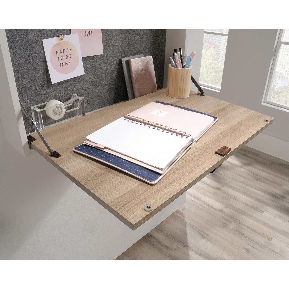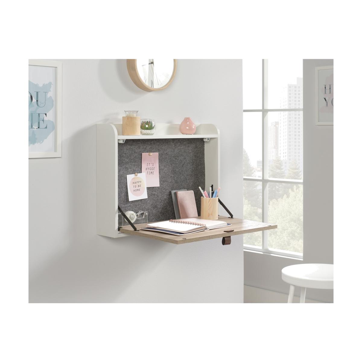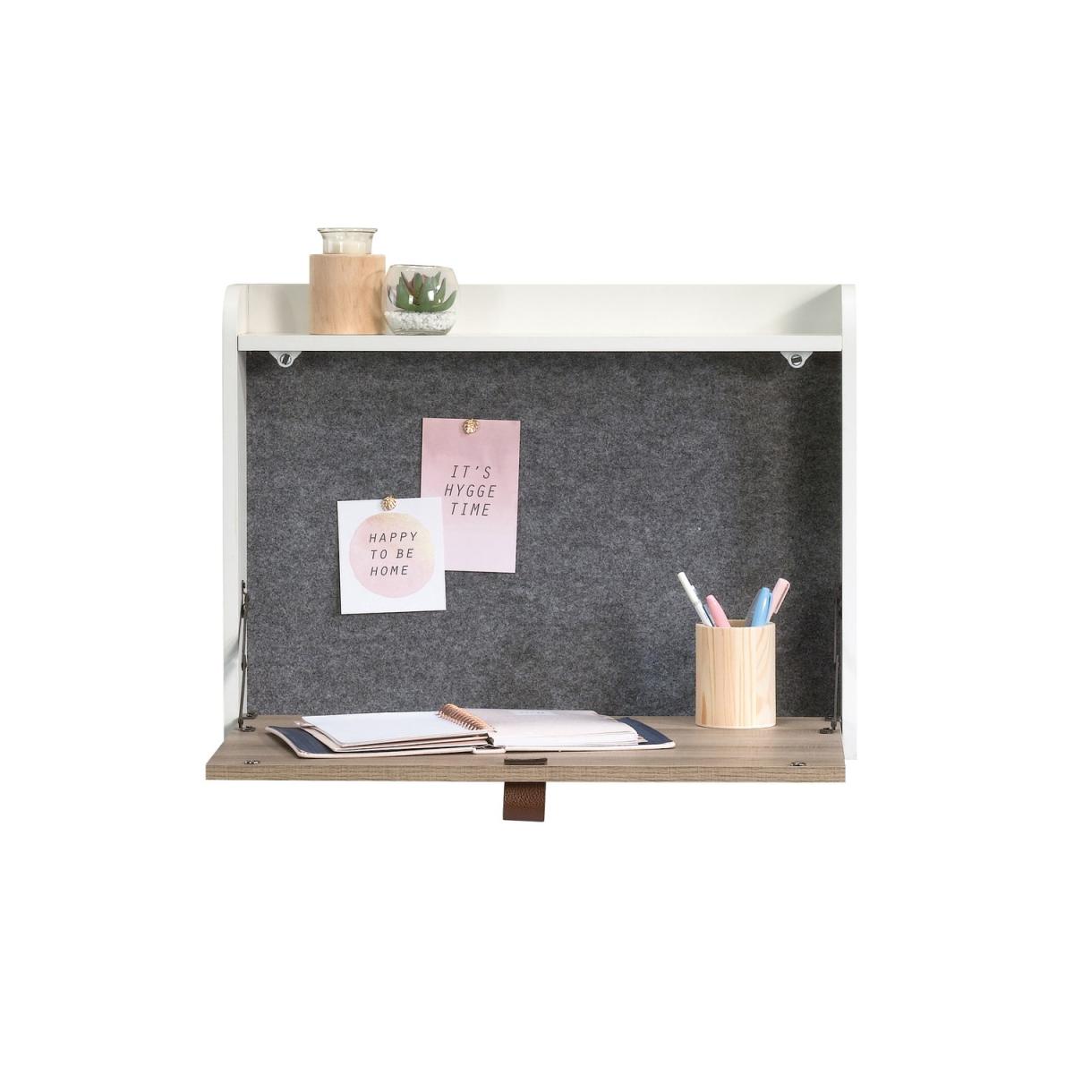 Dimensions H47 x W63 x D12.7 cm. The Teknik Office Avon Leather Handled Wall Desk is a charming and neutrally coloured option for all styles of office and colour schemes. This fresh and modern styled space saving hanging desk is finished in white with a Sky Oak effect flip down door this provides a convenient solution for those with limited space. This hanging desk is versatile enough to place anywhere in your home or office and the door can be lowered down to create a spacious desk work area for your laptop office accessories and possibly even a cup of your favourite tea! Once the desk is fully opened there is also a large contrasting grey bulletin style board in front of you perfect for pinning your reminders and paperwork in full view for when you need them. An open upper shelf on top of the desk completes the look for displaying all manner of home decor. The look is completed with the front also featuring an unusual yet stunning addition of a drawer pull in durable brown leather for an extra touch of class. A beautiful and versatile wall desk which will blend effortlessly within your home or working area. Features. Space saving hanging desk. Flip down door to create a spacious working area. Contains an upper shelf perfect for storage. Grey interior bulletin-style board. Accented leather handle pull. Easy assembly..