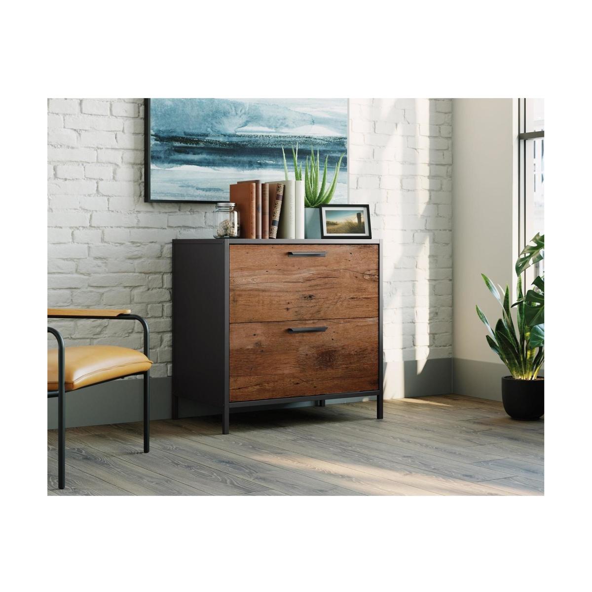Dimensions H76 x W76.8 x D47 cm Features. Loft apartment style lateral filer in a black finish with Vintage Oak accents. Offers two fully extending filing drawer for letter or legal sized hanging files. Durable powder coated metal frame360 degree finish for versatile room placement Assembly required..