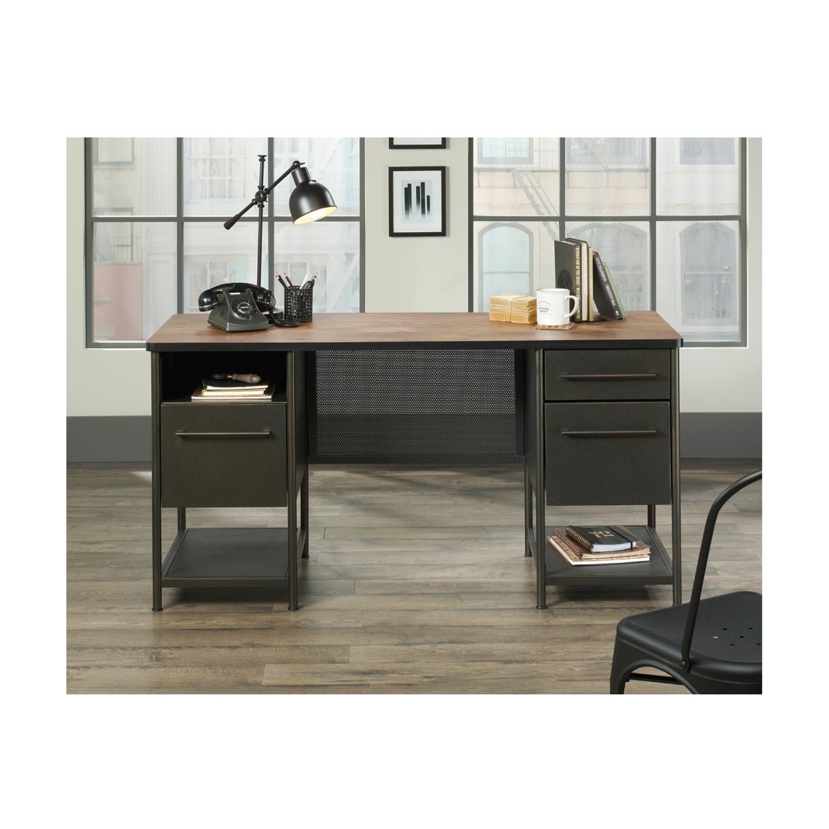Dimensions H76.5 x W152.4 x D61 cm. This 'loft apartment' style desk is the perfect office accessory. Finished in matt black with vintage oak accents it is sure to beautifully suit any home décor. Features. Contemporary design with perforated metal panels. Complete with three large drawers with full extension slides two of which accept letter size hanging files. Two shelves and a cubbyhole provide extra storage for those office essentials360 degree finish for versatile placement. Made from durable powder coated metal Assembly required..