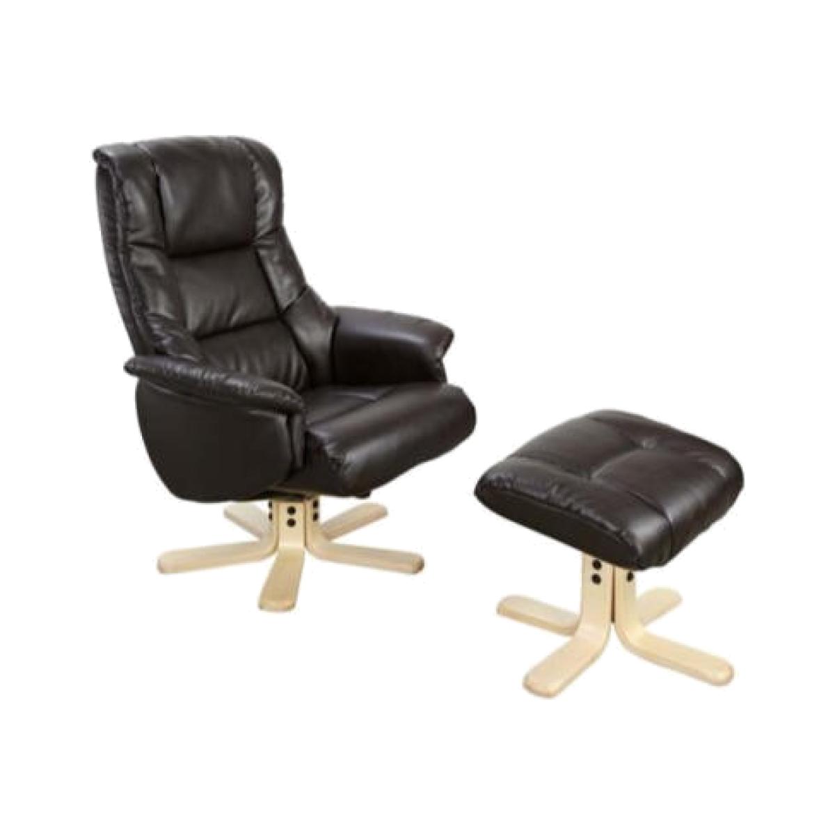 Shown in black. For that perfect first impression for your living room look no further than the Colorado Swivel Recliner and Footstool with Light Wood Base. This stunning armchair features bonded leather upholstery for a sleek look and a swivel and reclining function so you can find a blissfully comfortable position with ease. Finish Bonded Leather and Wood Effect Sizes Armchair W76cm x D86cm x H103cm. Footstool W48cm x D42cm x H42cm. Please note this item requires assembly Features. Star base Recliner armchair with footstoolSwivels. Bonded leather upholstery. Available in 2 colours..