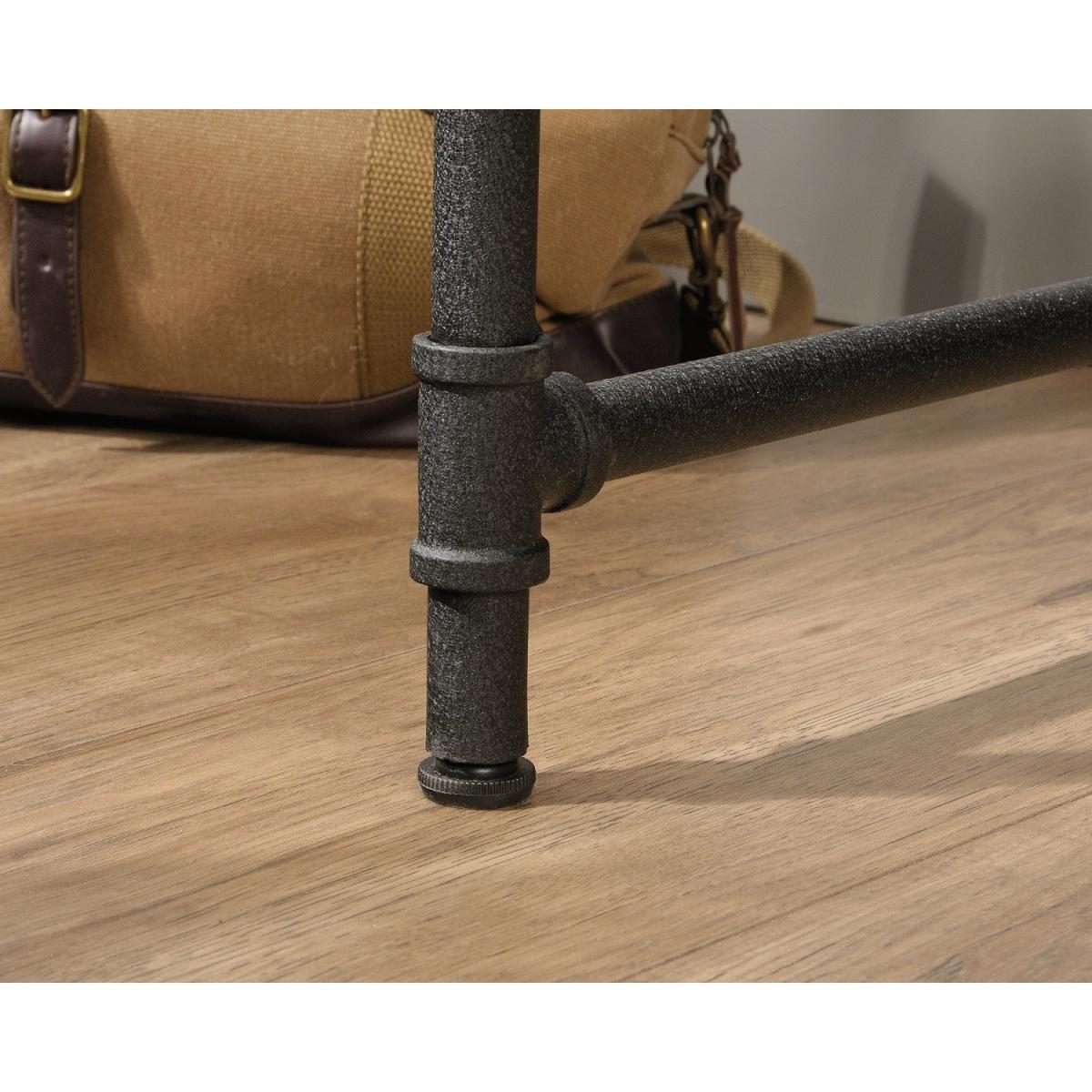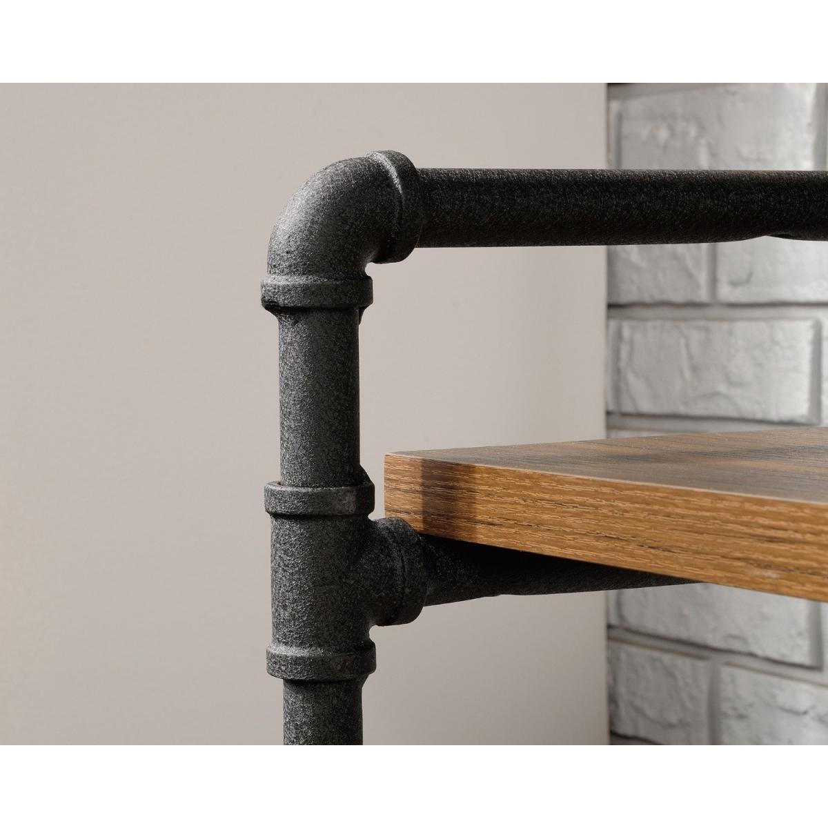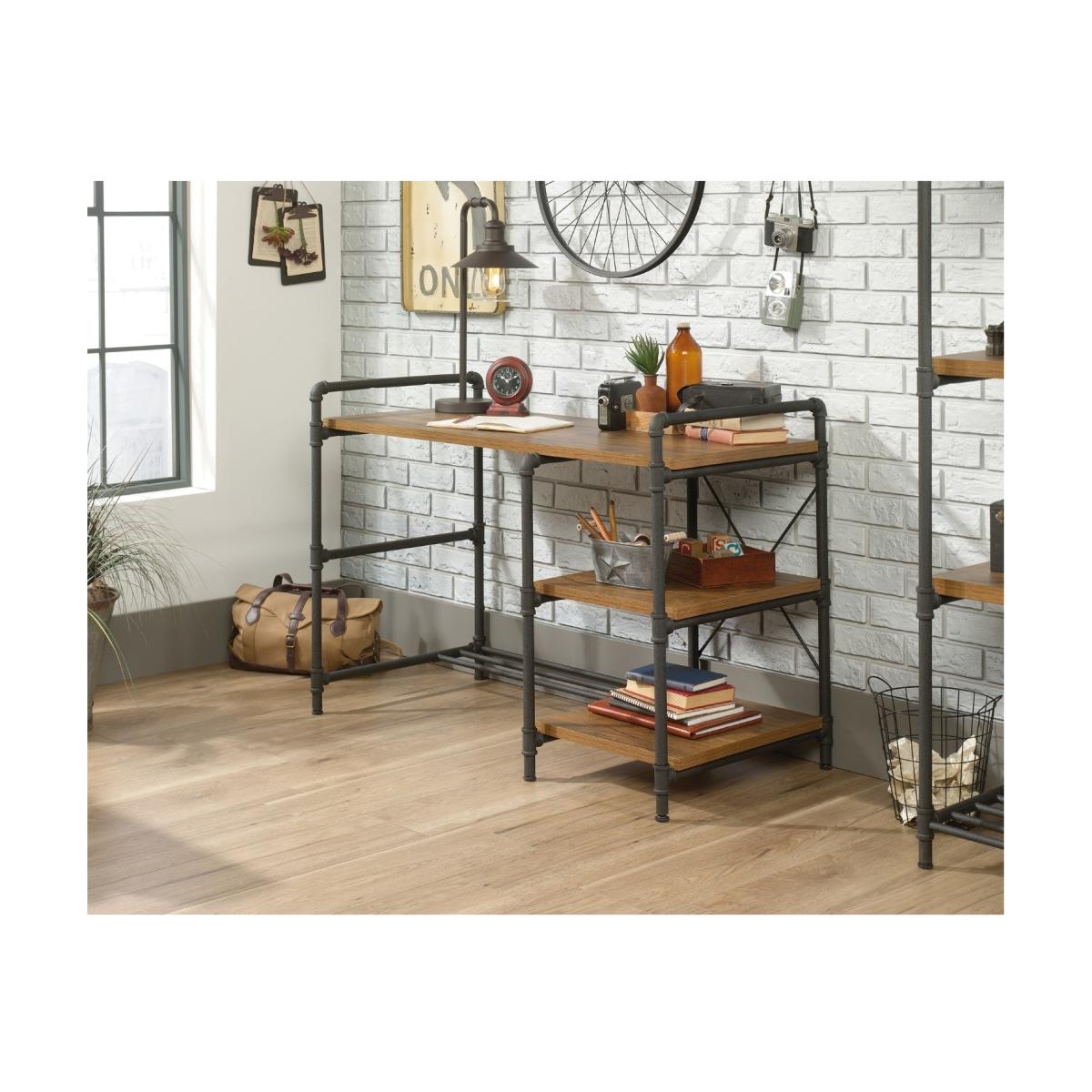 Dimensions H84.4 x W120.6 x D59 cm. This steampunk style desk features contemporary pipework effect framing and checked oak. The perfect desk for your home office. Features. Spacious work area. Complete with sturdy 1" thick shelving. Ample space for storage for those office essentials360 degree finish for versatile placement. Features contemporary pipework effect framing. Assembly required..